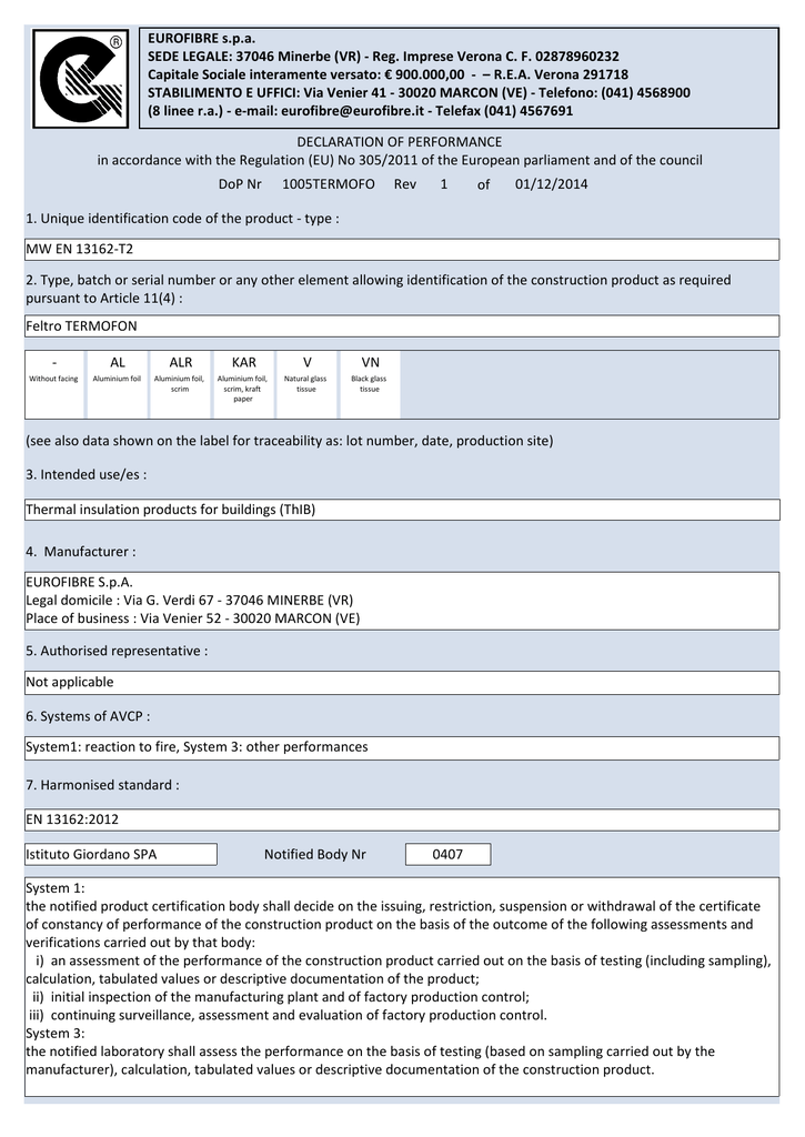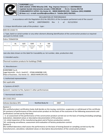 EUROFIBRE s.p.a. SEDE LEGALE: 37046 Minerbe (VR) - Reg. Imprese Verona C. F. 02878960232 Capitale Sociale interamente versato: € 900.000,00 - – R.E.A. Verona 291718 STABILIMENTO E UFFICI: Via Venier 41 - 30020 MARCON (VE) - Telefono: (041) 4568900 (8 linee r.a.) - e-mail: [email protected] - Telefax (041) 4567691 DECLARATION OF PERFORMANCE in accordance with the Regulation (EU) No 305/2011 of the European parliament and of the council DoP Nr 1005TERMOFO Rev 1 of 01/12/2014 1. Unique identification code of the product - type : MW EN 13162-T2 2. Type, batch or serial number or any other element allowing identification of the construction product as required pursuant to Article 11(4) : Feltro TERMOFON - AL ALR KAR V VN Without facing Aluminium foil Aluminium foil, scrim Aluminium foil, scrim, kraft paper Natural glass tissue Black glass tissue (see also data shown on the label for traceability as: lot number, date, production site) 3. Intended use/es : Thermal insulation products for buildings (ThIB) 4. Manufacturer : EUROFIBRE S.p.A. Legal domicile : Via G. Verdi 67 - 37046 MINERBE (VR) Place of business : Via Venier 52 - 30020 MARCON (VE) 5. Authorised representative : Not applicable 6. Systems of AVCP : System1: reaction to fire, System 3: other performances 7. Harmonised standard : EN 13162:2012 Istituto Giordano SPA Notified Body Nr 0407 System 1: the notified product certification body shall decide on the issuing, restriction, suspension or withdrawal of the certificate of constancy of performance of the construction product on the basis of the outcome of the following assessments and verifications carried out by that body: i) an assessment of the performance of the construction product carried out on the basis of testing (including sampling), calculation, tabulated values or descriptive documentation of the product; ii) initial inspection of the manufacturing plant and of factory production control; iii) continuing surveillance, assessment and evaluation of factory production control. System 3: the notified laboratory shall assess the performance on the basis of testing (based on sampling carried out by the manufacturer), calculation, tabulated values or descriptive documentation of the construction product. 8. Declared performance : All the features listed in the table are determined according to the standard of the harmonized standard EN 13162:2012 Levels and or classes Requirements Feltro TERMOFON Unit of measure - A1 AL A1 ALR A1 KAR D-s1,d0 V A1 VN A1 Reaction to fire Euroclass characteristics Reaction to fire Release of dangerous substances to the indoor enrironment Release of dangerous substances (a) Acoustic absorption index Sound absorption NPD Dynamic stiffness NPD Thickness dL NPD Compressibility NPD Air flow resistivity NPD Direct airborne sound insulation index Air flow resistivity NPD Continuous glowing combustion Continuous glowing combustion NPD Impact noise transmission index (for floors) Thermal resistance Thermal resistance (10°C) m²K/W 0,65 - 4,4 Thermal conductivity (10°C) W/(m*K) 0,036 Thickness mm 25 - 160 %/mm T2 Short term water absorption kg/m² NPD Long term water absorption kg/m² NPD Water vapour trasmission m²hPa/mg NPD Compressive stress or compressive strength kPa NPD Class for thickness tolerance Water permeability Water vapor permeability Compressive strength Durability of reaction to fire against heat, weathering, ageing/degradation Durability of thermal resistance against heat, weathering, ageing/degradation Euroclass Point load NPD Durability characteristics (c) Thermal resistance and thermal conductivity (d) Durability characteristics (e) Tensile/Flexural strength Tensile strength perpendicular to faces (f) Durability of compressive strength against ageing/degradation Compressive creep kPa NPD NPD NPD - No Performance Determined (a) The thermal insulation products must not develop hazardous substances above the maximum level allowed by European or local regulations. The European test methods are under development. (b) An European test method is under development phase and the rule will be modified when this will is available. (c)The fire performance of mineral wool does not deteriorate with time. The Euroclass classification of the product is related to the organic content, which cannot increase with time. (d) Thermal conductivity of mineral wool products does not change with time, experience has shown the fibre structure to be stable and the porosity contains no other gases than atmospheric air. (e) For dimensional stability thickness only. (f) This characteristics also covers handling and installation. 9. The performance of the product identified above is in conformity with the set of declared performance/s. This declaration of performance is issued, in accordance with Regulation (EU) No 305/2011, under the sole responsibility of the manufacturer identified above. Signed for and on behalf of the manufacturer by: At Marcon-Venezia on 01/12/2014 Paolo Vaccari Head of Technical&Commercial Dept. EUROFIBRE s.p.a. SEDE LEGALE: 37046 Minerbe (VR) - Reg. Imprese Verona C. F. 02878960232 Capitale Sociale interamente versato: € 900.000,00 - – R.E.A. Verona 291718 STABILIMENTO E UFFICI: Via Venier 41 - 30020 MARCON (VE) - Telefono: (041) 4568900 (8 linee r.a.) - e-mail: [email protected] - Telefax (041) 4567691 DICHIARAZIONE DI PRESTAZIONE Ai sensi del regolamento Prodotti da Costruzione n° 305/2011 DoP N.ro 1005TERMOFO Rev 1 del 01/12/2014 1. Codice di identificazione unico del prodotto - tipo: MW EN 13162-T2 2. Elemento, lotto, che consenta l’identificazione del prodotto da costruzione (articolo 11, paragrafo 4): Feltro TERMOFON - AL ALR KAR V VN Senza rivestimenti Alluminio Alluminio e rete di vetro Carta kraft alluminio e rete di vetro Velo vetro naturale Velo vetro nero (vedi anche dati riportati su etichetta per la tracciabilità come: numero lotto, data, sito di produzione) 3. Usi previsti: Isolanti termici per l'edilizia (ThIB) 4. F