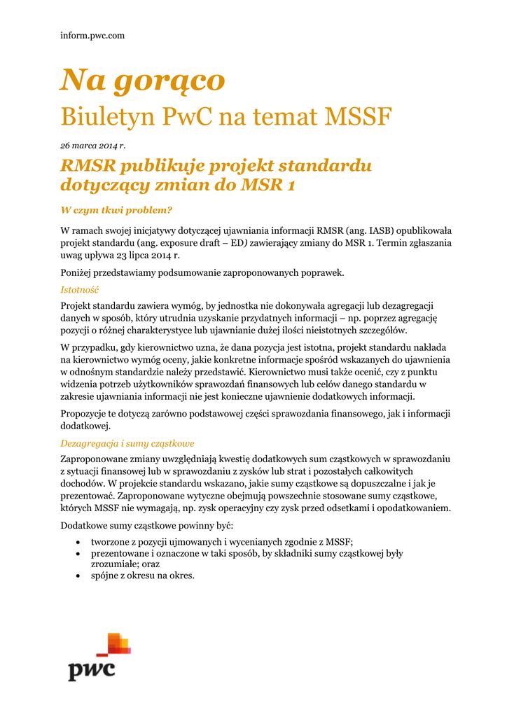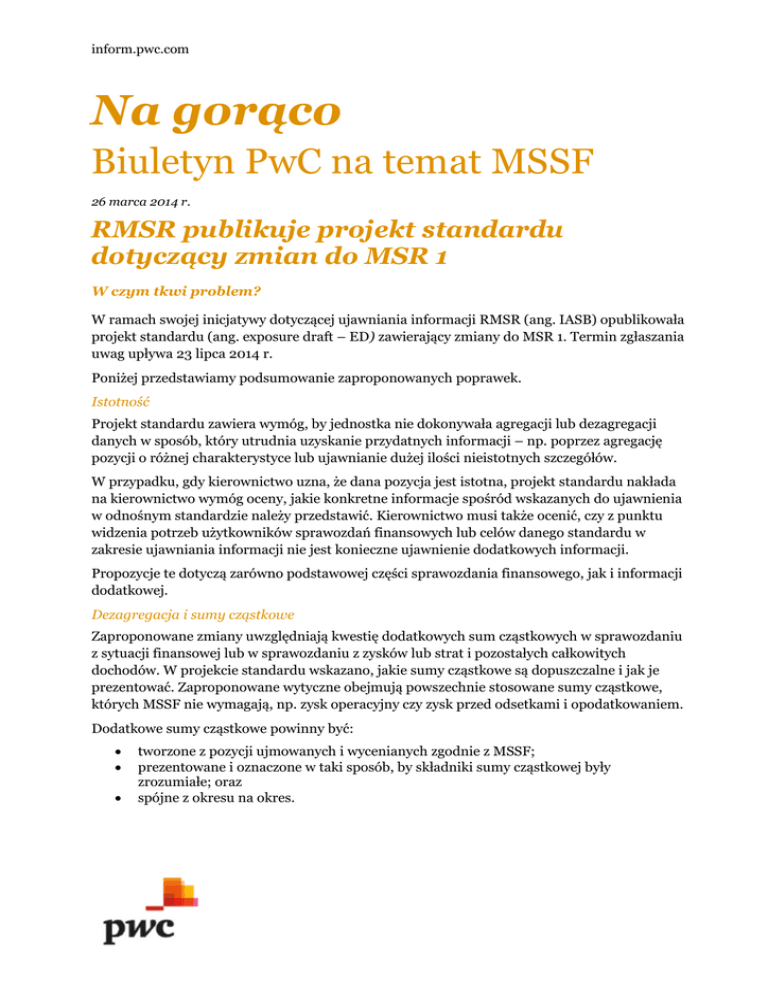 inform.pwc.com Na gorąco Biuletyn PwC na temat MSSF 26 marca 2014 r. RMSR publikuje projekt standardu dotyczący zmian do MSR 1 W czym tkwi problem? W ramach swojej inicjatywy dotyczącej ujawniania informacji RMSR (ang. IASB) opublikowała projekt standardu (ang. exposure draft – ED) zawierający zmiany do MSR 1. Termin zgłaszania uwag upływa 23 lipca 2014 r. Poniżej przedstawiamy podsumowanie zaproponowanych poprawek. Istotność Projekt standardu zawiera wymóg, by jednostka nie dokonywała agregacji lub dezagregacji danych w sposób, który utrudnia uzyskanie przydatnych informacji – np. poprzez agregację pozycji o różnej charakterystyce lub ujawnianie dużej ilości nieistotnych szczegółów. W przypadku, gdy kierownictwo uzna, że dana pozycja jest istotna, projekt standardu nakłada na kierownictwo wymóg oceny, jakie konkretne informacje spośród wskazanych do ujawnienia w odnośnym standardzie należy przedstawić. Kierownictwo musi także ocenić, czy z punktu widzenia potrzeb użytkowników sprawozdań finansowych lub celów danego standardu w zakresie ujawniania informacji nie jest konieczne ujawnienie dodatkowych informacji. Propozycje te dotyczą zarówno podstawowej części sprawozdania finansowego, jak i informacji dodatkowej. Dezagregacja i sumy cząstkowe Zaproponowane zmiany uwzględniają kwestię dodatkowych sum cząstkowych w sprawozdaniu z sytuacji finansowej lub w sprawozdaniu z zysków lub strat i pozostałych całkowitych dochodów. W projekcie standardu wskazano, jakie sumy cząstkowe są dopuszczalne i jak je prezentować. Zaproponowane wytyczne obejmują powszechnie stosowane sumy cząstkowe, których MSSF nie wymagają, np. zysk operacyjny czy zysk przed odsetkami i opodatkowaniem. Dodatkowe sumy cząstkowe powinny być: tworzone z pozycji ujmowanych i wycenianych zgodnie z MSSF; prezentowane i oznaczone w taki sposób, by składniki sumy cząstkowej były zrozumiałe; oraz spójne z okresu na okres. inform.pwc.com Projekt standardu wymaga, by dodatkowa suma cząstkowa w sprawozdaniu z zysków lub strat i pozostałych całkowitych dochodów nie była przedstawiana w sposób bardziej widoczny niż sumy i sumy cząstkowe wskazane w MSR 1. Dodatkowe sumy cząstkowe należy uzgodnić z sumami i sumami częściowymi wymaganymi przez MSR 1. Propozycja zezwala także jednostce na dezagregację określonej pozycji wymaganej przez MSR 1 w sprawozdaniu z sytuacji finansowej lub w sprawozdaniu z zysków lub strat i pozostałych całkowitych dochodów. Dla przykładu, jednostka prezentująca w sprawozdaniu z sytuacji finansowej osobno nieruchomości, a osobno maszyny i urządzenia, nadal spełniałaby wymogi MSR 1. Informacja dodatkowa Określając kolejność not, kierownictwo powinno rozważyć zrozumiałość i porównywalność sprawozdania finansowego. Nie wymaga się przedstawienia informacji dodatkowej do sprawozdania finansowego w określonej kolejności. Jednostka może, na przykład, przedstawić najpierw ważniejsze noty, albo może prezentować po kolei dziedziny, które są ze sobą powiązane. Taka elastyczność – która już teraz jest dozwolona zgodnie z MSR 1 –mogłaby pozwolić kierownictwu na bardziej wnikliwe przedstawienie jednostki. Jednostka może także zindeksować każdą pozycję przedstawioną w głównym sprawozdaniu finansowym z odnośnymi informacjami zawartymi w notach. Ujawnianie zasad (polityki) rachunkowości Dzięki usunięciu nietrafionych przykładów projekt standardu objaśnia, jak ustalić, które zasady rachunkowości są istotne. RMSR rozumie, że w ramach jej inicjatywy w sprawie ujawniania informacji konieczne są dalsze prace dotyczące określania i ujawniania istotnych zasad rachunkowości. Pozostałe całkowite dochody z inwestycji ujmowanych metodą praw własności Projekt standardu wymaga, by udział w pozostałych całkowitych dochodach z tytułu inwestycji ujmowanych metodą praw własności był grupowany w zależności od tego, czy pozycje będą podlegać w przyszłości reklasyfikacji do rachunku zysków i strat. Każdą grupę należy przedstawić jako osobną pozycję w sprawozdaniu z pozostałych całkowitych dochodów. Kogo to dotyczy? Proponowane zmiany będą mieć wpływ na każdą jednostkę. Projekt standardu uwzględnia te obszary MSR 1, które obecnie bywają błędnie rozumiane przez oraz użytkowników sprawozdań finansowych. Zaproponowane zmiany będą szczególnie istotne dla jednostek, które prezentują dodatkowe sumy cząstkowe w sprawozdaniu z sytuacji finansowej lub w sprawozdaniu z zysków lub strat i innych całkowitych dochodów. Co należy zrobić? Należy zapoznać się z proponowaną nowelizacją w całości, by określić, czy ma na Państwa wpływ, i rozważyć możliwość wysłania uwag do zaproponowanych zmian. Co dalej? Szersza inicjatywa w zakresie ujawniania informacji jest w toku. Oczekuje się, że w trzecim kwartale 2014 r. RMSR opublikuje propozycję standardu (ED) w sprawie zmian do MSR 1 w zakresie klasyfikacji zobowiązań. Ta publikacja zawiera ogólne wskazówki dotyczące wyłącznie poruszonych w niej kwestii, nie stanowi natomiast profesjonalnej porady. © 2014 PricewaterhouseCoopers. Wszystkie prawa zastrzeżone. Nazwa „PricewaterhouseCoopers” odnosi się do firm wchodzących w skład sieci PricewaterhouseCoopers International Limited, z których każda stanowi odrębny i niezależny podmiot prawny. Więcej informacji znajduje się na stronie: www.pwc.com/structure