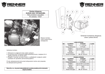 Zestaw œlizgaczy SUZUKI GSX 750 INAZUMA Rok produkcji: wszystkie Nr zestawu: 10327 4 3 2 1 6 5 L 4 Schemat monta¿owy œlizgacza. Lewa i prawa strona. Miejsce monta¿u Lewa i prawa strona analogicznie. Instrukcja monta¿u: 1. Wskazane na zdjêciach œruby nale¿y wykrêciæ. 2. Za pomoc¹ œrub 7 przykrêciæ p³ytkê poœredni¹ 2 wraz z tulejkami 3 i 4 wed³ug schematu na stronie obok. 3. Œlizgacz 1 wsun¹æ na œrubê 5 razem z podk³adk¹ 6, nastêpnie ca³oœæ przykrêciæ do uprzednio zamocowanej p³ytki 2. W celu zabezpieczenia œrub przed odkrêceniem mo¿na u¿yæ preparatu do zabezpieczania gwintów. Renner Sp. z o.o. nie ponosi odpowiedzialnoœci za szkody powsta³e pomimo stosowania naszych produktów. 7 NR 1 2 3 4 5 6 7 LEWA STRONA ELEMENT WYMIAR Œlizgacz L = 115 mm Tarcza poœrednia Ø 70x20 Tulejka 1 d1=14 mm, t1=14 mm Tulejka 2 d2=14 mm, t2=10 mm Œruba M10 Podk³adka Ø 10 Œruba mocuj¹ca M8, d³ = 80 mm ILOŒÆ 1 1 1 1 1 1 2 NR 1 2 3 4 5 6 7 PRAWA STRONA ELEMENT WYMIAR Œlizgacz L = 105 mm Tarcza poœrednia Ø 70x20 Tulejka 1 d1=14 mm, t1=14 mm Tulejka 2 d2=14 mm, t2=10 mm Œruba M10 Podk³adka Ø 10 Œruba mocuj¹ca M8, d³ = 80 mm ILOŒÆ 1 1 1 1 1 1 2
