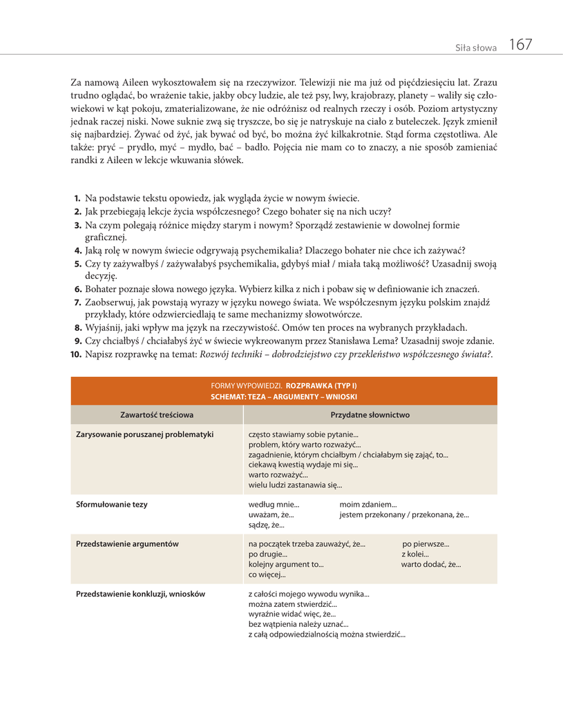 Siła słowa Za namową Aileen wykosztowałem się na rzeczywizor. Telewizji nie ma już od pięćdziesięciu lat. Zrazu trudno oglądać, bo wrażenie takie, jakby obcy ludzie, ale też psy, lwy, krajobrazy, planety – waliły się człowiekowi w kąt pokoju, zmaterializowane, że nie odróżnisz od realnych rzeczy i osób. Poziom artystyczny jednak raczej niski. Nowe suknie zwą się tryszcze, bo się je natryskuje na ciało z buteleczek. Język zmienił się najbardziej. Żywać od żyć, jak bywać od być, bo można żyć kilkakrotnie. Stąd forma częstotliwa. Ale także: pryć – prydło, myć – mydło, bać – badło. Pojęcia nie mam co to znaczy, a nie sposób zamieniać randki z Aileen w lekcje wkuwania słówek. 1. Na podstawie tekstu opowiedz, jak wygląda życie w nowym świecie. 2. Jak przebiegają lekcje życia współczesnego? Czego bohater się na nich uczy? 3. Na czym polegają różnice między starym i nowym? Sporządź zestawienie w dowolnej formie graficznej. 4. Jaką rolę w nowym świecie odgrywają psychemikalia? Dlaczego bohater nie chce ich zażywać? 5. Czy ty zażywałbyś / zażywałabyś psychemikalia, gdybyś miał / miała taką możliwość? Uzasadnij swoją decyzję. 6. Bohater poznaje słowa nowego języka. Wybierz kilka z nich i pobaw się w definiowanie ich znaczeń. 7. Zaobserwuj, jak powstają wyrazy w języku nowego świata. We współczesnym języku polskim znajdź przykłady, które odzwierciedlają te same mechanizmy słowotwórcze. 8. Wyjaśnij, jaki wpływ ma język na rzeczywistość. Omów ten proces na wybranych przykładach. 9. Czy chciałbyś / chciałabyś żyć w świecie wykreowanym przez Stanisława Lema? Uzasadnij swoje zdanie. 10. Napisz rozprawkę na temat: Rozwój techniki – dobrodziejstwo czy przekleństwo współczesnego świata?. FORMY WYPOWIEDZI. ROZPRAWKA (TYP I) SCHEMAT: TEZA – ARGUMENTY – WNIOSKI Zawartość treściowa Przydatne słownictwo Zarysowanie poruszanej problematyki często stawiamy sobie pytanie... problem, który warto rozważyć... zagadnienie, którym chciałbym / chciałabym się zająć, to... ciekawą kwestią wydaje mi się... warto rozważyć... wielu ludzi zastanawia się... Sformułowanie tezy według mnie... uważam, że... sądzę, że... Przedstawienie argumentów na początek trzeba zauważyć, że... po drugie... kolejny argument to... co więcej... Przedstawienie konkluzji, wniosków z całości mojego wywodu wynika... można zatem stwierdzić... wyraźnie widać więc, że... bez wątpienia należy uznać... z całą odpowiedzialnością można stwierdzić... moim zdaniem... jestem przekonany / przekonana, że... po pierwsze... z kolei... warto dodać, że... 167