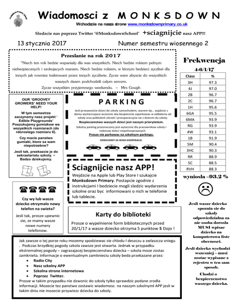 Wiadomosci z M O N K S D O W N Wchodzcie na nasza strone www.monksdownprimary.co.uk Sledzcie nas poprzez Twitter ‘@MonksdownSchool’ 13 stycznia 2017 +sciagnijcie nasz APP!!! Numer semestru wiosennego 2 Przeslanie na rok 2017 “Niech ten rok bedzie wspanialy dla was wszystkich. Niech bedzie rokiem pelnym niebezpiecznych i szokujacych marzen. Niech bedzie rokiem, w ktorym bedzieci zyczliwi dla innych jak rowniez traktowani przez innych zyczliwie. Zycze wam abyscie do wszystkich waszych dazen podchodzili calym sercem. Zycze wszystkim przyjemnego weekendu. ~ Mrs Gough OUR ‘GROOVEY GROWERS’ NEED YOUR HELP! W tym semestrze zaczynamy nasz projekt ‘ Edible Playgrounds’ Poszukujemy gumiakow we wszystkich rozmiarach (do rdoroslego rozmiaru 6). Czy macie panstwo gumiaki, ktore sa wam niepotrzebne? PARKING Jesli przeywozicie dzieci do szkoly samochodem, wanem itp… wyjdzcie z domu wystarczajaco wczesnie aby bezpiecznie zaparkowac w oddaleniu od szkoly oraz pobliskich uliczek I przespacerujcie sie z dziecmi do szkoly. Bezpieczenstwo waszych dzieci jest naszym priorytetem. Szkolny parking przeznaczony jest wylacznie dla pracownikow szkoly I rodzicow dzieci niepelnosprawnych. Prosze nie parkowac na szkolnym parkingu. DZIEKUJEMY ZA WSZA KOOPERACJE. Jesli tak, przekazcie je do sekraetariatu szkoly. ~ Badzo dziekujemy. Sciagnijcie nasz APP! Czy wy lub wasze dziecko otrzymalo nowy telefon na swieta? Jesli tak, prosze upewnic sie, ze mamy wasze nowe numery telefonow. Wejdzcie na Apple lub Play Store I szukajcie Monksdown Primary. Postapcie zgodnie z instrukcjami I bedziecie mogli sledzic wydarzenia szkolne oraz byc informowani o nich w telefonie lub tablecie. Karty do biblioteki Prosze o wypelnienie form bibliotecznych przed 20/1/17 a wasze dziecko otrzyma 5 punktow 5 Dojo ! Jak zawsze o tej porze roku mozemy spodziewac sie chlodu I deszczu a zwlaszcza sniegu . Podczas brzydkiej pogody szkola zawsze jest otwarta. Jednak w przypadku ekstremalnej pogody – zagrazajacej bezpieczenstwu dziecka – szkola moze zostac zamknieta. Informacje o ewentualnym zamknieciu szkoly beda przekazane przez: Radio City Nasz szkolny APP Szkolna strone internetowa Poprzez Twitter. Prosze w takim przypadku nie dzwonic do szkoly tylko sprawdzic podane zrodla informacji. Mozecie tez panstwo zostawic wiadomosc na naszym szkolnyml APP jesli w takim dniu nie mozecie przywiezc dziecka do szkoly. Frekwencja 4-6/1/17 Class % 3H 97.3 4J 97.0 2B 96.7 2C 96.7 1H 95.6 6GA 95.5 6MA 93.9 RG 93.9 4W 93.1 1B 91.9 5M 90.4 3HC 90.3 RR 88.9 5C 88.5 RVH 88.3 wyniosla –93.2 % Jesli wasze dziecko spoznia sie do szkoly odpowiedzialna za nie osoba dorosla MUSI wpisac dziecko na komputerowa liste obecnosci. Jesli dziecko wychodzi wszesniej – musi zostac wypisane z rejestru w ten sam sposob. Chodzi o bezpieczenstwo waszego dziecka.