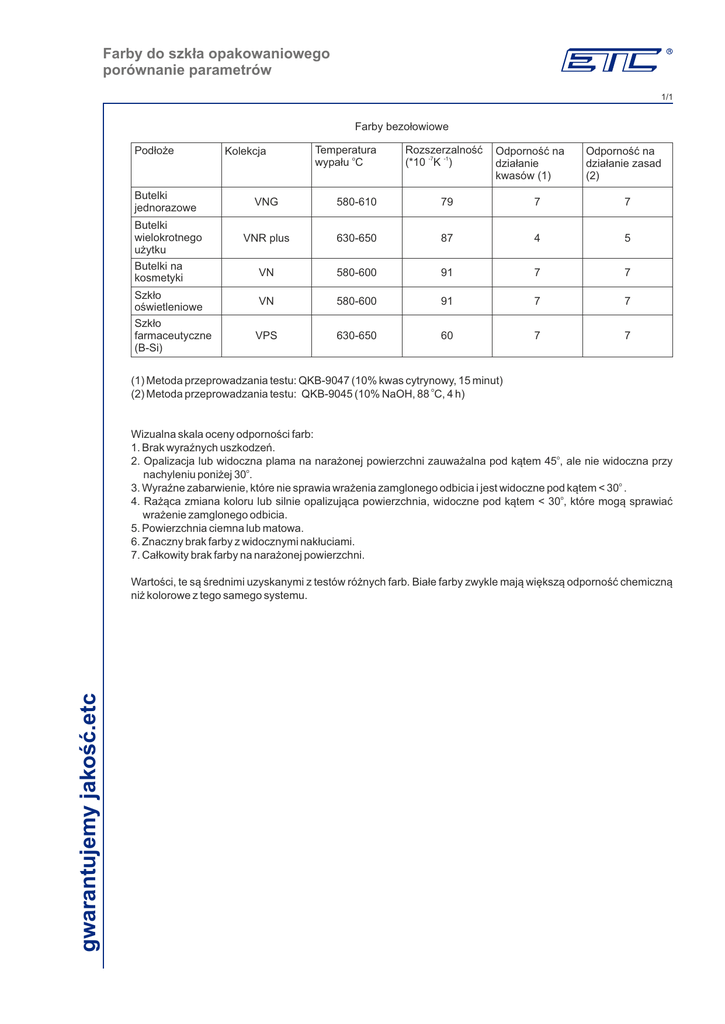 Farby do szkła opakowaniowego porównanie parametrów 1/1 Farby bezołowiowe Podłoże Butelki jednorazowe Butelki wielokrotnego użytku Butelki na kosmetyki Szkło oświetleniowe Szkło farmaceutyczne (B-Si) Kolekcja Temperatura wypału oC Rozszerzalność (*10 -7K -1) Odporność na działanie kwasów (1) Odporność na działanie zasad (2) VNG 580-610 79 7 7 VNR plus 630-650 87 4 5 VN 580-600 91 7 7 VN 580-600 91 7 7 VPS 630-650 60 7 7 (1) Metoda przeprowadzania testu: QKB-9047 (10% kwas cytrynowy, 15 minut) (2) Metoda przeprowadzania testu: QKB-9045 (10% NaOH, 88 oC, 4 h) Wizualna skala oceny odporności farb: 1. Brak wyraźnych uszkodzeń. 2. Opalizacja lub widoczna plama na narażonej powierzchni zauważalna pod kątem 45o, ale nie widoczna przy nachyleniu poniżej 30o. 3. Wyraźne zabarwienie, które nie sprawia wrażenia zamglonego odbicia i jest widoczne pod kątem < 30o . 4. Rażąca zmiana koloru lub silnie opalizująca powierzchnia, widoczne pod kątem < 30o, które mogą sprawiać wrażenie zamglonego odbicia. 5. Powierzchnia ciemna lub matowa. 6. Znaczny brak farby z widocznymi nakłuciami. 7. Całkowity brak farby na narażonej powierzchni. gwarantujemy jakość.etc Wartości, te są średnimi uzyskanymi z testów różnych farb. Białe farby zwykle mają większą odporność chemiczną niż kolorowe z tego samego systemu.