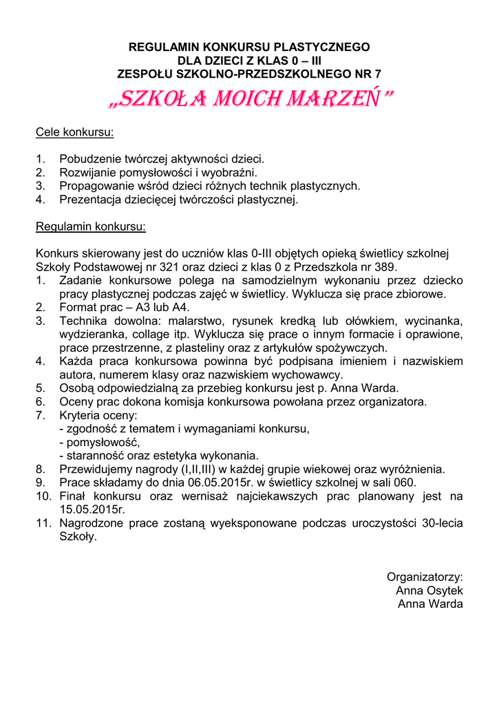 REGULAMIN KONKURSU PLASTYCZNEGO DLA DZIECI Z KLAS 0 – III ZESPOŁU SZKOLNO-PRZEDSZKOLNEGO NR 7 „SZKOŁA MOICH MARZEŃ” Cele konkursu: 1. 2. 3. 4. Pobudzenie twórczej aktywności dzieci. Rozwijanie pomysłowości i wyobraźni. Propagowanie wśród dzieci różnych technik plastycznych. Prezentacja dziecięcej twórczości plastycznej. Regulamin konkursu: Konkurs skierowany jest do uczniów klas 0-III objętych opieką świetlicy szkolnej Szkoły Podstawowej nr 321 oraz dzieci z klas 0 z Przedszkola nr 389. 1. Zadanie konkursowe polega na samodzielnym wykonaniu przez dziecko pracy plastycznej podczas zajęć w świetlicy. Wyklucza się prace zbiorowe. 2. Format prac – A3 lub A4. 3. Technika dowolna: malarstwo, rysunek kredką lub ołówkiem, wycinanka, wydzieranka, collage itp. Wyklucza się prace o innym formacie i oprawione, prace przestrzenne, z plasteliny oraz z artykułów spożywczych. 4. Każda praca konkursowa powinna być podpisana imieniem i nazwiskiem autora, numerem klasy oraz nazwiskiem wychowawcy. 5. Osobą odpowiedzialną za przebieg konkursu jest p. Anna Warda. 6. Oceny prac dokona komisja konkursowa powołana przez organizatora. 7. Kryteria oceny: - zgodność z tematem i wymaganiami konkursu, - pomysłowość, - staranność oraz estetyka wykonania. 8. Przewidujemy nagrody (I,II,III) w każdej grupie wiekowej oraz wyróżnienia. 9. Prace składamy do dnia 06.05.2015r. w świetlicy szkolnej w sali 060. 10. Finał konkursu oraz wernisaż najciekawszych prac planowany jest na 15.05.2015r. 11. Nagrodzone prace zostaną wyeksponowane podczas uroczystości 30-lecia Szkoły. Organizatorzy: Anna Osytek Anna Warda