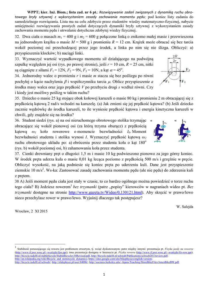 WPPT; kier. Inż. Biom.; lista zad. nr 6 pt.: Rozwiązywanie zadań związanych z dynamiką ruchu obrotowego bryły sztywnej z wykorzystaniem zasady zachowania momentu pędu; pod koniec listy zadania do samodzielnego rozwiązania. Lista ma na celu zdobycie przez studentów wiedzy matematyczno-fizycznej, nabycie umiejętności rozwiązywania prostych zadań dotyczących dynamiki bryły sztywnej z wykorzystaniem zasady zachowania momentu pędu i utrwalanie dotychczas zdobytej wiedzy fizycznej. 32. Dwa ciała o masach m1 = 400 g i m2 = 600 g połączone linką o znikomo małej masie i przewieszona na jednorodnym krążku o masie M = 500 g i promieniu R = 12 cm. Krążek może obracać się bez tarcia wokół poziomej osi przechodzącej przez jego środek, a linka po nim się nie ślizga. Obliczyć: a) przyspieszenia klocków; b) naciągi linki. 33. Wyznaczyć wartość wypadkowego momentu sił działającego na podwójną szpulkę względem jej osi (rys. po prawej stronie), jeśli r = 10 cm, R = 25 cm, nitki są ciągnięte z siłami F1 = 12N, F2 = 9N, F3 = 10N, a kąt α = 45o. 34. Jednorodny walec o promieniu r i masie m stacza się bez poślizgu po równi pochyłej o kącie nachylenia β i współczynniku tarcia µ. Oblicz przyspieszenie a środka masy walca oraz jego prędkość V po przebyciu drogi s wzdłuż równi. Czy i kiedy jest możliwy poślizg w takim ruchu? 35. Dziecko o masie 25 kg stojące obok kołowej karuzeli o masie 80 kg i promieniu 2 m obracającej się z prędkością kątową 2 rad/s wchodzi na karuzelę. (a) Jak zmieni się jej prędkość kątowa? (b) Jeśli dziecko zacznie wędrówkę do środka karuzeli, to ile wyniesie prędkość kątowa i energia kinetyczna karuzeli w chwili, gdy znajdzie się na środku? 36. Student siedzi (rys. a) na osi nieruchomego obrotowego stolika trzymając obracające się wokół pionowej osi (za którą trzyma oburącz) z prędkością kątową ω1 koło rowerowe o momencie bezwładności I0. Moment bezwładności studenta i stolika wynosi I. Wyznaczyć prędkość kątową ω2 ruchu obrotowego układu po: a) obróceniu przez studenta koła o kąt 180o (rys. b) wokół poziomej osi, b) zahamowaniu koła przez studenta. 37. Cienki drewniany pręt o długości 1,5 m i masie 10 kg podwieszono pionowo za jego górny koniec. W środek pręta uderza kula o masie 0,01 kg lecąca poziomo z prędkością 500 m/s i grzęźnie w pręcie. Obliczyć wysokość, na jaką podniesie się koniec pręta po uderzeniu kuli. Dane jest przyspieszenie ziemskie 10 m/s2. Ws-ka: Zastosować zasadę zachowania momentu pędu (ale nie pędu) do zderzenia kuli z prętem. 38 A) Jeśli moment pędu ciała jest stały w czasie, to co bardzo ogólnego można powiedzieć o torze ruchu tego ciała? B) Jedziesz rowerem1 bez trzymanki (patrz „popisy” kierowców w nagraniach wideo pt. Bez trzymanki dostępne na stronie http://www.gazeta.tv/Wideo/0,130121.html). Aby skręcić w prawo/lewo nieco przechylasz rower w prawo/lewo. Wyjaśnij dlaczego tak postępujesz? W. Salejda Wrocław, 2 XI 2015 1 Stabilność poruszającego się roweru jest problemem otwartym, tj. wciąż dyskutowanym; patrz między innymi: prezentacja pt. Fizyka jazdy na rowerze (http://www.if.pwr.wroc.pl/~wsalejda/fjnr.ppt); inna prezentacja dostępna w Internecie pt. Fizyka roweru (http://www.if.pwr.wroc.pl/~wsalejda/fiz-row.ppt); http://bicycle.tudelft.nl/stablebicycle/StableBicyclev34Revised.pdf, http://bicycle.tudelft.nl/schwab/Publications/schwab2013review.pdf; http://en.wikipedia.org/wiki/Bicycle_and_motorcycle_dynamics; https://sites.google.com/site/bikephysics/english-version; http://bicycle.tudelft.nl/schwab/; http://slideplayer.pl/user/84096/; http://socrates.berkeley.edu/~fajans/Teaching/MoreBikeFiles/JonesBikeBW.pdf. 1 Siłownia umysłowa. Zadania przeznaczone do samodzielnego rozwiązania W obliczeniach przyjąć g = 10 m/s2. 1. Układ mechaniczny tworzą trzy jednakowe, cienkie pręty, każdy o długości L połączone w kształt litery H (patrz rysunek obok). Wyznaczyć moment bezwładności tej bryły względem wskazanej na rysunku osi obrotu. 2. W chwili t = 0 wektor położenia cząstki o masie 0,01 kg wynosi r = 4i − 2j, względem początku układu współrzędnych, a jej prędkość zależna od czasu t 2 wynosi −6t i. Wyznaczyć, względem początku układu współrzędnych, dla t>0: a) moment pędu cząstki w funkcji czasu; b) działający na nią moment siły. 3. Słońce porusza się z prędkością liniową 250 km/s wokół środka Drogi Mlecznej (DM), od którego dzieli je odległość 2,2·1020 m. Jaka jest prędkość kątowa Słońca? Ile lat trwa obrót Słońca wokół środka DM? Ile takich obrotów wykonało Słońce, które istnieje około 4,5 mld lat? 4. Na poziomym stole leży szpulka nici. Z jakim przyspieszeniem a będzie się poruszać oś szpulki, jeśli ciągnąć ją siłą F? Pod jakim kątem ϕ należy ciągnąć nić, by szpulka poruszała się w prawo? Szpulka toczy się bez poślizgu. Moment bezwładności szpulki o masie m względem jej środka wynosi I. Ws-ka: Należy napisać równania ruchów: Postępowego środka masy oraz obrotowego szpulki i stąd wyprowadzić wzór na przyspieszenie a = F·(cosϕ − r/R)/(m + I/R2). 5. Pod sufitem wiszą podczepione na poziomych osiach przechodzących przez punkty zetknięcia się z sufitem: kula, sfera, walec, cienka obręcz, tarcza oraz pręt. Masa każdej bryły wynosi M. Promienie: kuli, sfery, walca, cienkiej obręczy i tarczy są równe R, a pręt ma długość R. Które z tych ciał ma względem osi obrotu największy/najmniejszy moment bezwładności? 6. Do końców stalowego pręta o długości 1,2m i masie 6,4 kg przymocowano małe kulki o masach 1,06 kg. Pręt obraca się z prędkością kątową ! = 39 obrotów/s w płaszczyźnie poziomej wokół pionowej osi przechodzącej przez jego środek. Pod wpływem tarcia zwalnia, aż do zatrzymania w czasie 32 s. Zakładając, że moment siły hamującej b