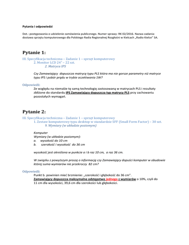 Pytania i odpowiedzi Dot.: postępowania o udzielenie zamówienia publicznego. Numer sprawy: RK 02/2016. Nazwa zadania: dostawa sprzętu komputerowego dla Polskiego Radia Regionalnej Rozgłośni w Kielcach „Radio Kielce” SA. Pytanie 1: III. Specyfikacja techniczna – Zadanie 1 – sprzęt komputerowy 2. Monitor LCD 24” – 22 szt. 2. Matryca IPS Czy Zamawiający dopuszcza matrycę typu PLS która ma nie gorsze parametry niż matryce typu IPS i pobór prądu w trybie oczekiwania 1W? Odpowiedź: Ze względu na niemalże tę samą technologię zastosowaną w matrycach PLS i rezultaty zbliżone do standardu IPS Zamawiający dopuszcza typ matrycy PLS przy zachowaniu pozostałych wymagań. Pytanie 2: III. Specyfikacja techniczna – Zadanie 1 – sprzęt komputerowy 1. Zestaw komputerowy typu desktop w standardzie SFF (Small Form Factor) – 30 szt. 9. Wymiary (w układzie poziomym) Komputer Wymiary (w układzie poziomym): a. wysokość do 10 cm b. szerokość i wysokość do 36 cm wysokość jest określona w punkcie a i b raz 10 cm, a raz 36 cm. W związku z powyższym proszę o informację czy Zamawiający dopuści komputer w obudowie której suma wymiarów nie przekroczy 82 cm? Odpowiedź: Punkt b. powinien mieć brzmienie: „szerokość i głębokość do 36 cm”. Zamawiający dopuszcza maksymalne odstępstwo jednego z wymiarów o 10%, czyli do 11 cm dla wysokości, 39,6 cm dla szerokości lub głębokości. Pytanie 3: III. Specyfikacja techniczna – Zadanie 1 – sprzęt komputerowy 3. Zestaw: biznesowy laptop typu ultrabook wraz ze stacją dokującą (replikatorem portów) – 17 kompletów 10. Multimedia: d. wejście mikrofonowe e. wyjście słuchawkowe 4. Zestaw: laptop typu mobilna stacja robocza wraz ze stacją dokującą (replikatorem portów) – 2 komplety 10. Multimedia: d. wejście mikrofonowe e. wyjście słuchawkowe Czy zamawiający dopuści w laptopach z zestawów 3 i 4 port audio tzw. combo, ponieważ laptopy spełniające wymagania podane przez zamawiającego nie posiadają osobnych portów dla słuchawek i mikrofonu. Odpowiedź: Tak, Zamawiający dopuszcza użycie gniazda combo dla wejścia mikrofonowego oraz wyjścia słuchawkowego. Pytanie 4: III. Specyfikacja techniczna – Zadanie 1 – sprzęt komputerowy 1. Zestaw komputerowy typu desktop w standardzie SFF (Small Form Factor) – 30 szt. 7. Złącza: a. co najmniej 4 porty USB 3.0, w tym dwa na przednim panelu b. port USB szybkiego ładowania Czy zamawiający w zadaniu 1 w zestawie 1 dopuści komputer o wymiarach obudowy 35,6cm x 10,2cm x 33,8cm i z czterema portami USB na przednim panelu (1x USB 3.0 i 3x USB 2.0) i sześcioma na tylnym (6x USB 3.0)? Odpowiedź: Nie, Zamawiający wymaga co najmniej dwóch portów USB 3.0 na przednim panelu – ze względu na ilość i charakter wykorzystywanych urządzeń peryferyjnych.
