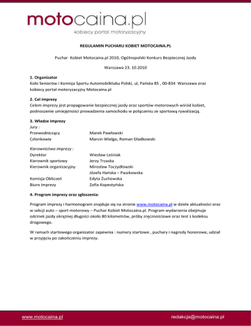 REGULAMIN PUCHARU KOBIET MOTOCAINA.PL Puchar Kobiet Motocaina.pl 2010, Ogólnopolski Konkurs Bezpiecznej Jazdy Warszawa 23. 10.2010 1. Organizator Koło Seniorów i Komisja Sportu Automobilklubu Polski, ul, Pańska 85 , 00-834 Warszawa oraz kobiecy portal motoryzacyjny Motocaina.pl 2. Cel imprezy Celem imprezy jest propagowanie bezpiecznej jazdy oraz sportów motorowych wśród kobiet, podnoszenie umiejętności prowadzenia samochodu w połączeniu ze sportową rywalizacją. 3. Władze imprezy Jury : Przewodniczący Członkowie Kierownictwo imprezy : Dyrektor Kierownik sportowy Kierownik organizacyjny Komisja Obliczeń Biuro imprezy Marek Pawłowski Marcin Wielgo, Roman Gładkowski Wiesław Leśniak Jerzy Trzaska Mirosław Toczydłowski Józefa Hańska – Paszkowska Edyta Żuchowska Zofia Kopestyńska 4. Program imprezy oraz zgłoszenia: Program imprezy i harmonogram znajduje się na stronie www.motocaina.pl w dziele aktualności oraz w sekcji auto – sport motorowy – Puchar Kobiet Motocaina.pl. Program wydarzenia obejmuje odcinek jazdy okrężnej długości około 80 kilometrów, próby zręcznościowe oraz test z kodeksu drogowego. W ramach startowego organizator zapewnia : numery startowe , puchary i nagrody honorowe, udział w przyjęciu po zakończeniu imprezy. www.motocaina.pl [email protected] Puchar Kobiet Motocaina.pl Każda zawodniczka zamierzająca wziąć udział w Pucharze musi przesłać wypełniony formularz zgłoszenia, dostępny na stronie www.motocaina.pl, oraz potwierdzenie wpłaty wpisowego pocztą email do organizatora na adres: [email protected] w terminie do 20.10.2010, do godziny 10 rano. Dla uczestniczek Pucharu Kobiet Motocaina.pl wpisowe w kwocie 120 zł płatne jest przelewem na konto: VW Bank Direct 63 2130 0004 2001 0465 3069 0001. W tytule przelewu prosimy umieścić informację: wpisowe IMIĘ NAZWISKO za udział w PK Motocaina.pl 5. Baza imprezy Ośrodek Automobilklubu Polski na Bemowie ul, Powstańców Śląskich 127 Zakończenie imprezy – Automobilklub Polski ul Pańska 85 6. Uczestnictwo W PK Motocaina.pl mogą uczestniczyć panie, które nigdy nie brały udziału w jakichkolwiek wyścigach, czy rajdach samochodowych. Przyjmujemy zgłoszenia dwuosobowych załóg kobiecych, lecz w indywidualnych przypadkach dopuszczone będą starty jednoosobowe oraz udział w Pucharze dwóch konkurentek, które mogą rywalizować i przejechać wszystkie próby tym samym samochodem (zostaną sklasyfikowane oddzielnie). Zawodniczki z licencjami będą mogły wystartować w klasie gość. 7. Klasyfikacje Grupa III - Panie - uczestniczki Pucharu Kobiet Motocaina.pl. Uczestniczki Pucharu Kobiet Motocaina.pl rywalizują w 3-klasach i klasyfikacji generalnej prowadzonej oddzielnie dla Pucharu. W PK Motocaina.pl uczestniczyć mogą załogi składające się wyłącznie z kobiet. Klasa I do 1500 ccm Klasa II powyżej 1501 ccm Klasa III Gość Klasyfikacja prowadzona jest oddzielnie dla Kryterium Żubrów (zawodów odbywających się tego samego dnia) jak i Pucharu Kobiet Motocaina.pl. Pojazdy dopuszczone do imprezy muszą spełniać warunki dopuszczenia do ruchu, posiadać ważne dowody rejestracyjne oraz ubezpieczenia NW i OC oraz apteczki i gaśnice. Podczas odbywania prób, uczestnicy zobowiązani są używać kasków ochronnych pod rygorem wykluczenia z zawodów . www.motocaina.pl [email protected] 8. Punktacja Za każdą minutę wcześniejszego lub późniejszego wjazdu na PKC (punkt kontroli czasu) - 1 pkt. karny, za potrącenie lub przesunięcie słupka - 3 pkt. Karnych, za nieprawidłowe pokonanie próby TARYFA [ 150% najlepszego czasu na danej próbie ] 9. Nagrody Laureatki pierwszych trzech miejsc z klasyfikacji generalnej oraz dwóch klas pojemnościowych otrzymają wartościowe nagrody. W klasie gość tylko zwyciężczyni zostanie uhonorowana nagrodą. Podczas przejazdu wygranego w PK Motocaina.pl na OS Karowa w Rajdzie Barbórki w grudniu 2010 roku, uczestniczka zobowiązuje się okleić auto, którym przejedzie tę trasę w dużych rozmiarów naklejki kobiecego portalu motoryzacyjnego Motocaina.pl (tak aby były one czytelne z trybun i dużej odległości). Naklejki dostarczy i zaprojektuje specjalnie na tę okazję Motocaina.pl. 10. Harmonogram imprezy 23.10.2010 godz. 9.00 otwarcie biura imprezy Autodrom - Bemowo 9.15 wydawanie dokumentów j.w. 9.45 odprawa j.w. 10.00 start pierwszej załogi j.w. 17.30 meta pierwszej załogi AP ul. Pańska 85 18.00 wyniki prowizoryczne j.w. 18.30 wyniki oficjalne j.w. 18.45 rozdanie nagród i zakończenie imprezy ORGANIZATOR Koło Seniorów AP Polski Kobiecy portal motoryzacyjny Motocaina.pl www.motocaina.pl [email protected]