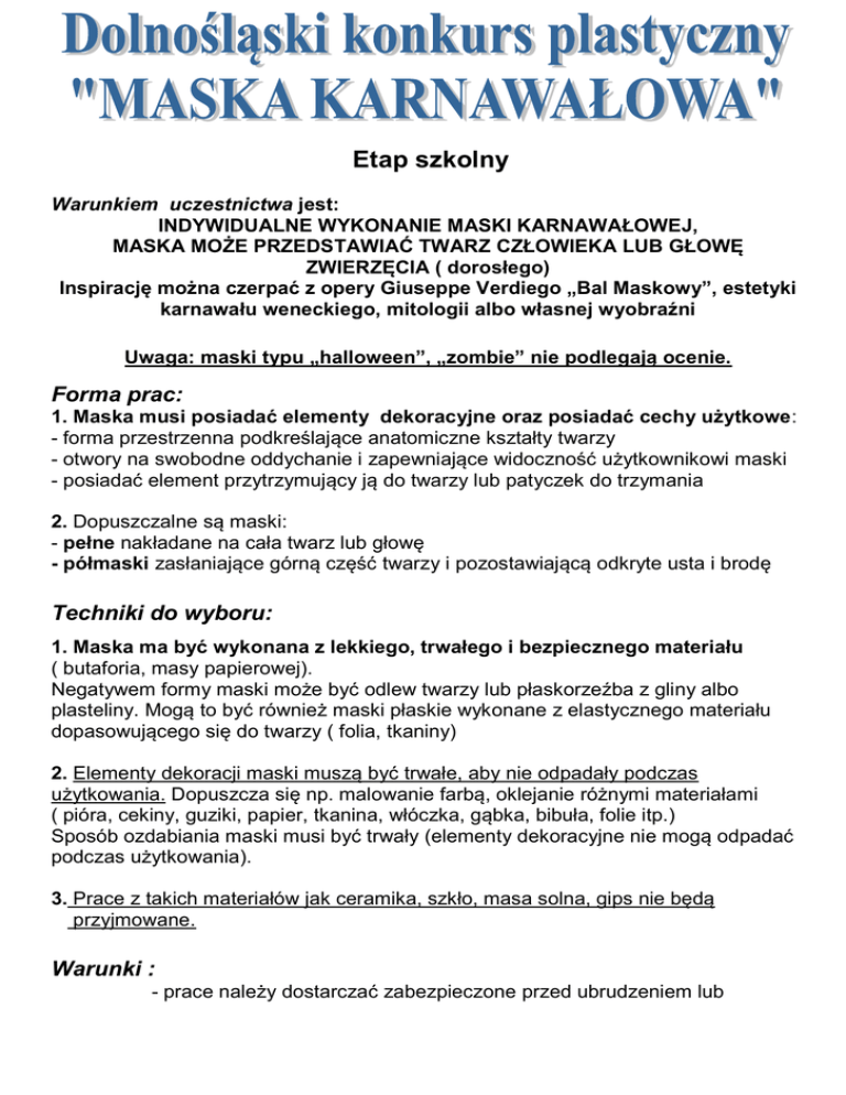 Etap szkolny Warunkiem uczestnictwa jest: INDYWIDUALNE WYKONANIE MASKI KARNAWAŁOWEJ, MASKA MOŻE PRZEDSTAWIAĆ TWARZ CZŁOWIEKA LUB GŁOWĘ ZWIERZĘCIA ( dorosłego) Inspirację można czerpać z opery Giuseppe Verdiego „Bal Maskowy”, estetyki karnawału weneckiego, mitologii albo własnej wyobraźni Uwaga: maski typu „halloween”, „zombie” nie podlegają ocenie. Forma prac: 1. Maska musi posiadać elementy dekoracyjne oraz posiadać cechy użytkowe: - forma przestrzenna podkreślające anatomiczne kształty twarzy - otwory na swobodne oddychanie i zapewniające widoczność użytkownikowi maski - posiadać element przytrzymujący ją do twarzy lub patyczek do trzymania 2. Dopuszczalne są maski: - pełne nakładane na cała twarz lub głowę - półmaski zasłaniające górną część twarzy i pozostawiającą odkryte usta i brodę Techniki do wyboru: 1. Maska ma być wykonana z lekkiego, trwałego i bezpiecznego materiału ( butaforia, masy papierowej). Negatywem formy maski może być odlew twarzy lub płaskorzeźba z gliny albo plasteliny. Mogą to być również maski płaskie wykonane z elastycznego materiału dopasowującego się do twarzy ( folia, tkaniny) 2. Elementy dekoracji maski muszą być trwałe, aby nie odpadały podczas użytkowania. Dopuszcza się np. malowanie farbą, oklejanie różnymi materiałami ( pióra, cekiny, guziki, papier, tkanina, włóczka, gąbka, bibuła, folie itp.) Sposób ozdabiania maski musi być trwały (elementy dekoracyjne nie mogą odpadać podczas użytkowania). 3. Prace z takich materiałów jak ceramika, szkło, masa solna, gips nie będą przyjmowane. Warunki : - prace należy dostarczać zabezpieczone przed ubrudzeniem lub zniszczeniem - maskę należy opatrzyć kartonikiem ( imię i nazwisko autora, klasa, wiek). Karteczkę z tymi informacjami nie należy przyczepiać bezpośrednio na maskę, ale przypiąć do sznureczka przewleczonego przez otwór do oddychania lub patrzenia maski). Nagrody: Przewidziano nagrody dla laureatów etapu regionalnego i wojewódzkiego przygotowane przez Organizatorów Konkursu. Termin dostarczenia prac: do 10 lutego 2012 r. (piątek) Szczegółowe pytania i konsultacje w sprawie konkursu udziela koordynator konkursu nauczyciel plastyki pani Monika Małachowska –Szczok