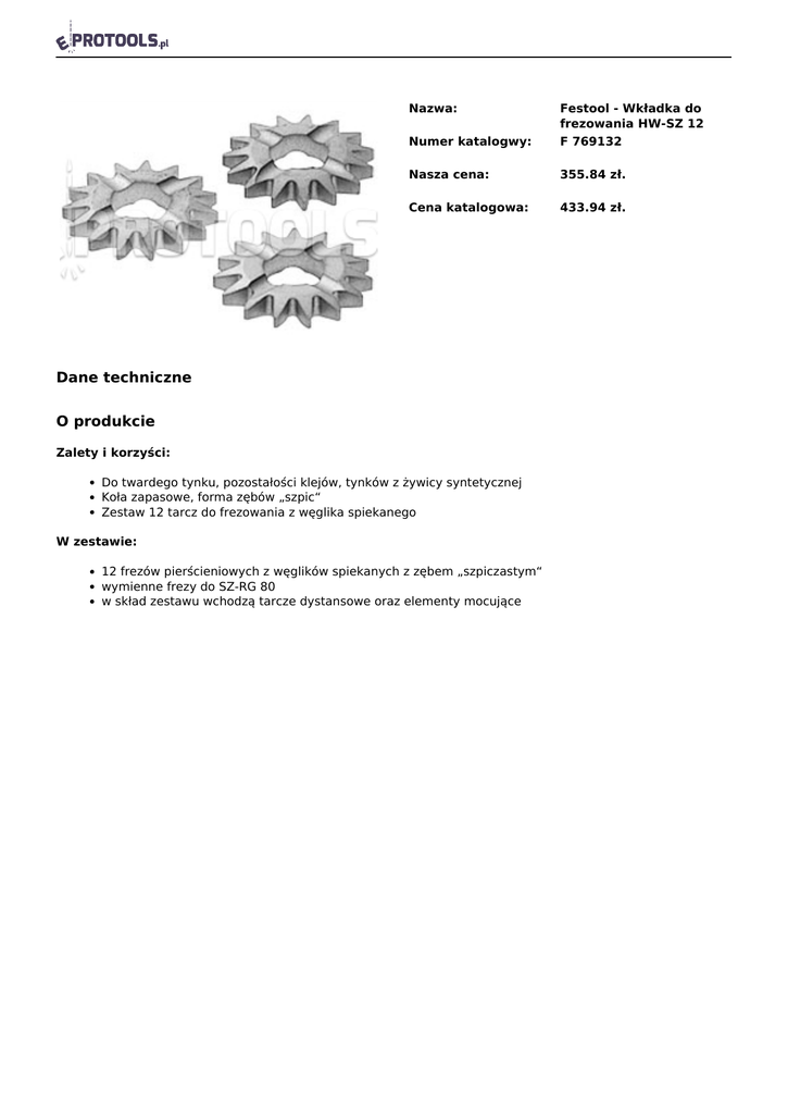 Nazwa: Festool - Wkładka do frezowania HW-SZ 12 Numer katalogwy: F 769132 Nasza cena: 355.84 zł. Cena katalogowa: 433.94 zł. Dane techniczne O produkcie Zalety i korzyści: Do twardego tynku, pozostałości klejów, tynków z żywicy syntetycznej Koła zapasowe, forma zębów „szpic“ Zestaw 12 tarcz do frezowania z węglika spiekanego W zestawie: 12 frezów pierścieniowych z węglików spiekanych z zębem „szpiczastym“ wymienne frezy do SZ-RG 80 w skład zestawu wchodzą tarcze dystansowe oraz elementy mocujące Powered by TCPDF (www.tcpdf.org)