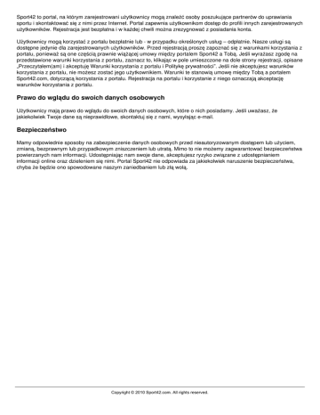 Sport42 to portal, na którym zarejestrowani użytkownicy mogą znaleźć osoby poszukujące partnerów do uprawiania sportu i skontaktować się z nimi przez Internet. Portal zapewnia użytkownikom dostęp do profili innych zarejestrowanych użytkowników. Rejestracja jest bezpłatna i w każdej chwili można zrezygnować z posiadania konta. Użytkownicy mogą korzystać z portalu bezpłatnie lub - w przypadku określonych usług – odpłatnie. Nasze usługi są dostępne jedynie dla zarejestrowanych użytkowników. Przed rejestracją proszę zapoznać się z warunkami korzystania z portalu, ponieważ są one częścią prawnie wiążącej umowy między portalem Sport42 a Tobą. Jeśli wyrażasz zgodę na przedstawione warunki korzystania z portalu, zaznacz to, klikając w pole umieszczone na dole strony rejestracji, opisane „Przeczytałem(am) i akceptuję Warunki korzystania z portalu i Politykę prywatności”. Jeśli nie akceptujesz warunków korzystania z portalu, nie możesz zostać jego użytkownikiem. Warunki te stanowią umowę między Tobą a portalem Sport42.com, dotyczącą korzystania z portalu. Rejestracja na portalu i korzystanie z niego oznaczają akceptację warunków korzystania z portalu. Prawo do wglądu do swoich danych osobowych Użytkownicy mają prawo do wglądu do swoich danych osobowych, które o nich posiadamy. Jeśli uważasz, że jakiekolwiek Twoje dane są nieprawidłowe, skontaktuj się z nami, wysyłając e-mail. Bezpieczeństwo Mamy odpowiednie sposoby na zabezpieczenie danych osobowych przed nieautoryzowanym dostępem lub użyciem, zmianą, bezprawnym lub przypadkowym zniszczeniem lub utratą. Mimo to nie możemy zagwarantować bezpieczeństwa powierzanych nam informacji. Udostępniając nam swoje dane, akceptujesz ryzyko związane z udostępnianiem informacji online oraz dzieleniem się nimi. Portal Sport42 nie odpowiada za jakiekolwiek naruszenie bezpieczeństwa, chyba że będzie ono spowodowane naszym zaniedbaniem lub złą wolą. Copyright © 2010 Sport42.com. All rights reserved. Powered by TCPDF (www.tcpdf.org)