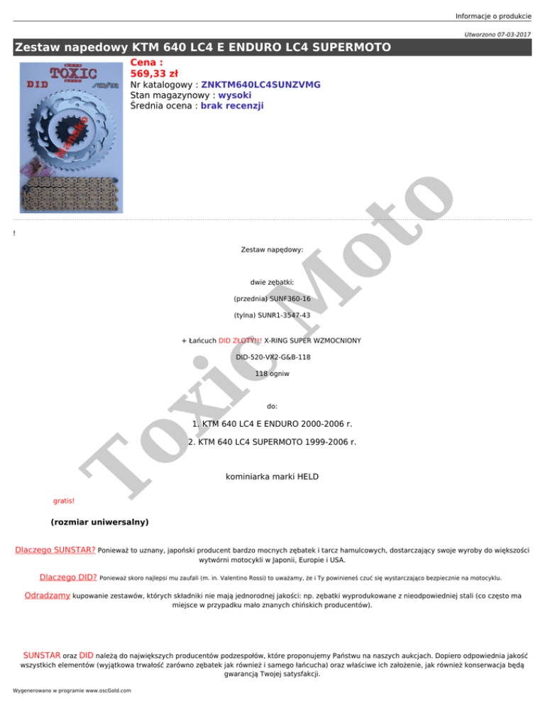 Informacje o produkcie Utworzono 07-03-2017 Zestaw napedowy KTM 640 LC4 E ENDURO LC4 SUPERMOTO Cena : 569,33 zł ot o Nr katalogowy : ZNKTM640LC4SUNZVMG Stan magazynowy : wysoki Średnia ocena : brak recenzji ! Zestaw napędowy: M dwie zębatki: (przednia) SUNF360-16 (tylna) SUNR1-3547-43 + Łańcuch DID ZŁOTY!!! X-RING SUPER WZMOCNIONY c DID-520-VX2-G&B-118 xi 118 ogniw do: To 1. KTM 640 LC4 E ENDURO 2000-2006 r. 2. KTM 640 LC4 SUPERMOTO 1999-2006 r. kominiarka marki HELD gratis! (rozmiar uniwersalny) Dlaczego SUNSTAR? Ponieważ to uznany, japoński producent bardzo mocnych zębatek i tarcz hamulcowych, dostarczający swoje wyroby do większości wytwórni motocykli w Japonii, Europie i USA. Dlaczego DID? Ponieważ skoro najlepsi mu zaufali (m. in. Valentino Rossi) to uważamy, że i Ty powinieneś czuć się wystarczająco bezpiecznie na motocyklu. Odradzamy kupowanie zestawów, których składniki nie mają jednorodnej jakości: np. zębatki wyprodukowane z nieodpowiedniej stali (co często ma miejsce w przypadku mało znanych chińskich producentów). SUNSTAR oraz DID należą do największych producentów podzespołów, które proponujemy Państwu na naszych aukcjach. Dopiero odpowiednia jakość wszystkich elementów (wyjątkowa trwałość zarówno zębatek jak również i samego łańcucha) oraz właściwe ich założenie, jak również konserwacja będą gwarancją Twojej satysfakcji. Wygenerowano w programie www.oscGold.com Uwaga! Warunkiem gwarancji ze strony producenta DID jest założenie łańcucha w serwisie motocyklowym! Błyskawiczna wysyłka!! Proponujemy w ramach serwisu m.inn. pomiar mocy motocykli na profesjonalnej hamowni Dyna Pro oraz dokładną ich diagnostykę wraz z możliwością ich regulacji pod kątem optymalizacji parametrów - tuning Rapid Bike, Power Commander. To xi c M ot o Przykładowe zdjęcie: