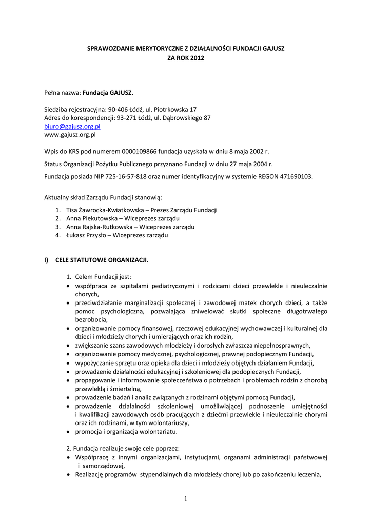 SPRAWOZDANIE MERYTORYCZNE Z DZIAŁALNOŚCI FUNDACJI GAJUSZ ZA ROK 2012 Pełna nazwa: Fundacja GAJUSZ. Siedziba rejestracyjna: 90-406 Łódź, ul. Piotrkowska 17 Adres do korespondencji: 93-271 Łódź, ul. Dąbrowskiego 87 [email protected] www.gajusz.org.pl Wpis do KRS pod numerem 0000109866 fundacja uzyskała w dniu 8 maja 2002 r. Status Organizacji Pożytku Publicznego przyznano Fundacji w dniu 27 maja 2004 r. Fundacja posiada NIP 725-16-57-818 oraz numer identyfikacyjny w systemie REGON 471690103. Aktualny skład Zarządu Fundacji stanowią: 1. 2. 3. 4. I) Tisa Żawrocka-Kwiatkowska – Prezes Zarządu Fundacji Anna Piekutowska – Wiceprezes zarządu Anna Rajska-Rutkowska – Wiceprezes zarządu Łukasz Przysło – Wiceprezes zarządu CELE STATUTOWE ORGANIZACJI. 1. Celem Fundacji jest: współpraca ze szpitalami pediatrycznymi i rodzicami dzieci przewlekle i nieuleczalnie chorych, przeciwdziałanie marginalizacji społecznej i zawodowej matek chorych dzieci, a także pomoc psychologiczna, pozwalająca zniwelować skutki społeczne długotrwałego bezrobocia, organizowanie pomocy finansowej, rzeczowej edukacyjnej wychowawczej i kulturalnej dla dzieci i młodzieży chorych i umierających oraz ich rodzin, zwiększanie szans zawodowych młodzieży i dorosłych zwłaszcza niepełnosprawnych, organizowanie pomocy medycznej, psychologicznej, prawnej podopiecznym Fundacji, wypożyczanie sprzętu oraz opieka dla dzieci i młodzieży objętych działaniem Fundacji, prowadzenie działalności edukacyjnej i szkoleniowej dla podopiecznych Fundacji, propagowanie i informowanie społeczeństwa o potrzebach i problemach rodzin z chorobą przewlekłą i śmiertelną, prowadzenie badań i analiz związanych z rodzinami objętymi pomocą Fundacji, prowadzenie działalności szkoleniowej umożliwiającej podnoszenie umiejętności i kwalifikacji zawodowych osób pracujących z dziećmi przewlekle i nieuleczalnie chorymi oraz ich rodzinami, w tym wolontariuszy, promocja i organizacja wolontariatu. 2. Fundacja realizuje swoje cele poprzez: Współpracę z innymi organizacjami, instytucjami, organami administracji państwowej i samorządowej, Realizację programów stypendialnych dla młodzieży chorej lub po zakończeniu leczenia, 1 Prowadzenie działalności propagandowej i wydawniczej, między innymi poprzez realizacje filmowe, radiowe i inne multimedialne, Prowadzenie szkoleń, zajęć terapeutycznych, poradnictwa zawodowego, poszukiwanie miejsc pracy dla podopiecznych, Prowadzenie szkoleń, kursów, warsztatów i staży przeznaczonych dla osób pracujących z dziećmi przewlekle i nieuleczalnie chorymi oraz ich rodzinami, Działalność na rzecz organizacji pozarządowych oraz podmiotów wymienionych w art. 3. ust. 3 ustawy o działalności pożytku publicznego i wolontariacie w zakresie określonym w ustawie. II) ZAKRES PROWADZONEJ DZIAŁALNOŚCI STATUTOWEJ. 1) HOSPICJUM DOMOWE DLA DZIECI ZIEMI ŁÓDZKIEJ W 2012 roku Fundacja GAJUSZ w ramach Hospicjum Domowego dla Dzieci Ziemi Łódzkiej objęła opieką 76 pacjentów. Każdy pacjent przyjęty do Hospicjum otrzymuje opiekę medyczną, socjalną, psychologiczną i duchową. Wizyta lekarska odbywa się nie rzadziej niż dwa razy w miesiącu a pielęgniarska minimum dwa razy w tygodniu. Rehabilitant, pracownik socjalny i psycholog odwiedzają dzieci według potrzeb. Każdy z pacjentów jest zaopatrzony w sprzęt medyczny. Pacjenci z rodzin o trudnej sytuacji materialnej mają zapewniony zakup leków. W razie potrzeby Hospicjum zapewnia badania diagnostyczne, specjalistyczny transport medyczny, konsultacje specjalistów (głównie neurologa), rehabilitację. Opieka w ramach Hospicjum jest oparta na kontrakcie z Narodowym Funduszem Zdrowia. W 2012 roku Fundacja GAJUSZ podpisała kontrakt na 74 zł. na osobodzień dla 30 pacjentów miesięcznie, co dało kwotę 814 500 zł. w skali roku. a) Liczba pacjentów Hospicjum Pacjent inicjały Wiek AA AP AS BM BW BN CK CA DL DM DM DA FA FD GE GZ JN JK JB KA 2 0 17 0 0 16 18 14 2 0 13 12 0 0 0 10 0 14 0 0 Odległość Liczba dni w km od pod opieką Hospicjum Hospicjum nowotwór 60 3 wcześniactwo 4 58 wada wrodzona 4 162 wada wrodzona 7 151 choroba neurometaboliczna 80 350 choroba neurologiczna 50 249 choroba neurologiczna 100 164 choroba neurometaboliczna 4 366 wada genetyczna 15 59 wada wrodzona 120 89 choroba neurometaboliczna 100 366 choroba neurologiczna 10 239 wcześniactwo 5 30 wcześniactwo 3 86 wcześniactwo 70 52 nowotwór 50 55 wada wrodzona 20 350 nowotwór 120 73 wcześniactwo 8 11 wada wrodzona 60 177 Jednostka chorobowa 2 KZ KJ KA KK KI KP KK KM KK ŁM ŁM MK MK MA MM MD OD OZ OI OW PM PJ PM PP PB RK SM SA SF SA SO SL SJ SN SM SA SŁ SW SM ŚJ TA UA UO WC WŁ WF WO WA WM WA 17 1 1 0 6 11 6 19 3 13 0 0 12 0 8 6 6 1 5 0 0 0 0 1 9 1 15 18 0 4 16 0 0 4 0 17 0 5 1 1 5 6 11 0 18 1 16 0 7 15 choroba neurometaboliczna choroba neurologiczna wada wrodzona wada wrodzona choroba neurometaboliczna wada genetyczna nowotwór nowotwór choroba neurologiczna choroba neurologiczna wcześniactwo wcześniactwo nowotwór wada wrodzona choroba neurometaboliczna choroba neurometaboliczna wcześniactwo choroba neurologiczna choroba neurometaboliczna wada wrodzona wcześniactwo wcześniactwo wcześniactwo choroba neurologiczna choroba neurologiczna wada wrodzona choroba neurologiczna choroba neurometaboliczna wcześniactwo choroba neurologiczna choroba neurologiczna wcześniactwo wcześniactwo nowotwór choroba neurologiczna choroba neurologiczna wada wrodzona choroba neurologiczna wada wrodzona choroba neurometaboliczna wada wrodzona choroba neurometaboliczna choroba neurometaboliczna wcześniactwo choroba neurologiczna choroba neurologiczna choroba neurologiczna wcześniactwo choroba neurometaboliczna choroba neurologiczna 3 60 30 40 120 35 45 35 40 40 6 35 30 10 5 40 100 5 50 40 60 30 50 45 45 90 60 50 20 50 10 2 50 50 20 50 45 10 20 15 10 50 45 70 35 20 10 30 75 100 45 43 360 290 85 354 360 3 4 365 365 12 279 14 150 1