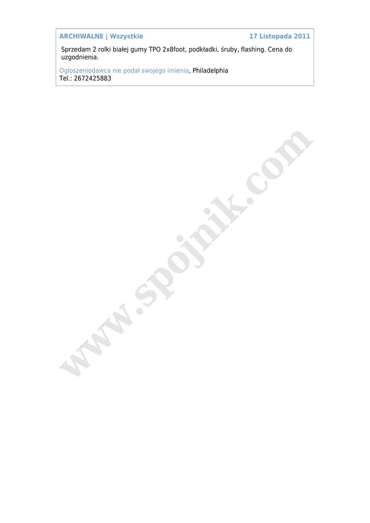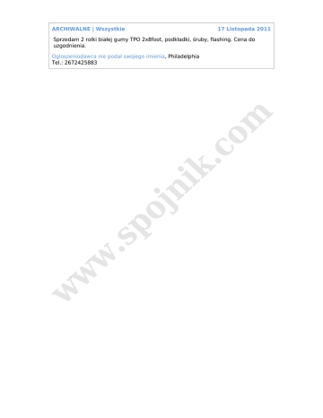 ARCHIWALNE | Wszystkie 17 Listopada 2011 Sprzedam 2 rolki białej gumy TPO 2x8foot, podkładki, śruby, flashing. Cena do uzgodnienia. w w w .s po jn ik .c o m Ogloszeniodawca nie podał swojego imienia, Philadelphia Tel.: 2672425883