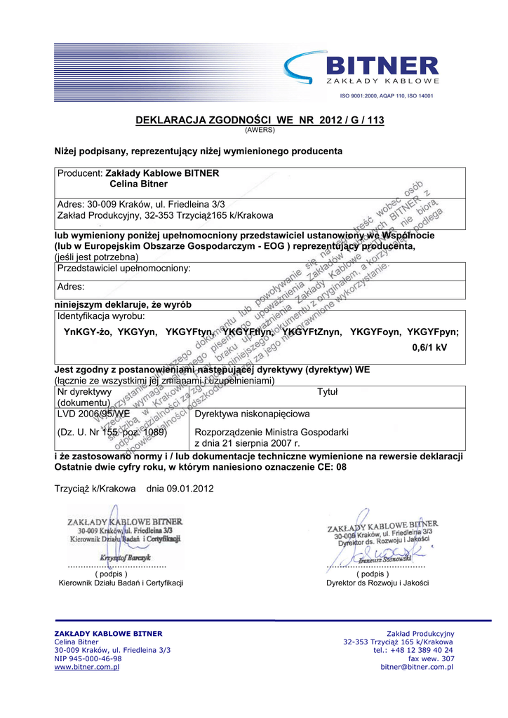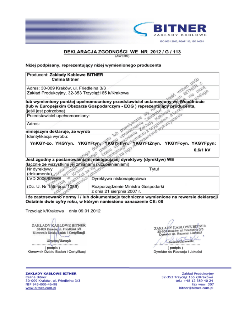 DEKLARACJA ZGODNOŚCI WE NR 2012 / G / 113 (AWERS) NiŜej podpisany, reprezentujący niŜej wymienionego producenta Producent: Zakłady Kablowe BITNER Celina Bitner Adres: 30-009 Kraków, ul. Friedleina 3/3 Zakład Produkcyjny, 32-353 TrzyciąŜ165 k/Krakowa lub wymieniony poniŜej upełnomocniony przedstawiciel ustanowiony we Wspólnocie (lub w Europejskim Obszarze Gospodarczym - EOG ) reprezentujący producenta, (jeśli jest potrzebna) Przedstawiciel upełnomocniony: Adres: niniejszym deklaruje, Ŝe wyrób Identyfikacja wyrobu: YnKGY-Ŝo, YKGYyn, YKGYFtyn, YKGYFtlyn, YKGYFtZnyn, YKGYFoyn, YKGYFpyn; 0,6/1 kV Jest zgodny z postanowieniami następującej dyrektywy (dyrektyw) WE (łącznie ze wszystkimi jej zmianami i uzupełnieniami) Nr dyrektywy Tytuł (dokumentu) LVD 2006/95/WE Dyrektywa niskonapięciowa (Dz. U. Nr 155 poz. 1089) Rozporządzenie Ministra Gospodarki z dnia 21 sierpnia 2007 r. i Ŝe zastosowano normy i / lub dokumentacje techniczne wymienione na rewersie deklaracji Ostatnie dwie cyfry roku, w którym naniesiono oznaczenie CE: 08 TrzyciąŜ k/Krakowa dnia 09.01.2012 ...................................... ( podpis ) Kierownik Działu Badań i Certyfikacji ZAKŁADY KABLOWE BITNER Celina Bitner 30-009 Kraków, ul. Friedleina 3/3 NIP 945-000-46-98 www.bitner.com.pl ...................................... ( podpis ) Dyrektor ds Rozwoju i Jakości Zakład Produkcyjny 32-353 TrzyciąŜ 165 k/Krakowa tel.: +48 12 389 40 24 fax wew. 307 [email protected] DEKLARACJA ZGODNOŚCI WE NR 2012 / G / 113 (REWERS) Normy i / lub dokumentacje techniczne lub ich części zastosowane do wyrobu, którego dotyczy niniejsza deklaracja: - normy zharmonizowane: Numer Wydanie Tytuł PN-HD 605 S2:2008 Kable elektroenergetyczne - Dodatkowe metody badania (oryg) PN-EN 60228:2007 śyły przewodów i kabli PN-EN 60332-1-2:2010 Badania palności kabli i przewodów elektrycznych oraz światłowodowych. Część 12: Sprawdzanie odporności pojedynczego izolowanego przewodu lub kabla na pionowe rozprzestrzenianie się płomienia. Metoda badania płomieniem mieszankowym 1 kW Część (1) - inne normy i / lub dokumentacje techniczne: Numer Wydanie Tytuł ZN-CB-33:2006 Kable elektroenergetyczne górnicze o izolacji polwinitowej na napięcie znamionowe 0,6/1 kV PN-E-90163:1990 Osłony ochronne i pancerze kabli elektrycznych Część (1) - inne rozwiązania techniczne, szczegóły, które zostały włączone do dokumentacji technicznej lub techniczno konstrukcyjnej: - Opinia Techniczna EMAG OT 07/17 ............................................................................................................................................................. Inne dokumenty lub informacje wymagane przez dyrektywę ( -y ) WE : - zintegrowany system zarządzania jakością i środowiskiem ISO 9001:2008 i ISO 14001:2004 ............................................................................................................................................................. ............................................................................................................................................................. (1) NaleŜy wypełnić w przypadku powoływania się na części lub rozdziały normy lub dokumentacji technicznej.