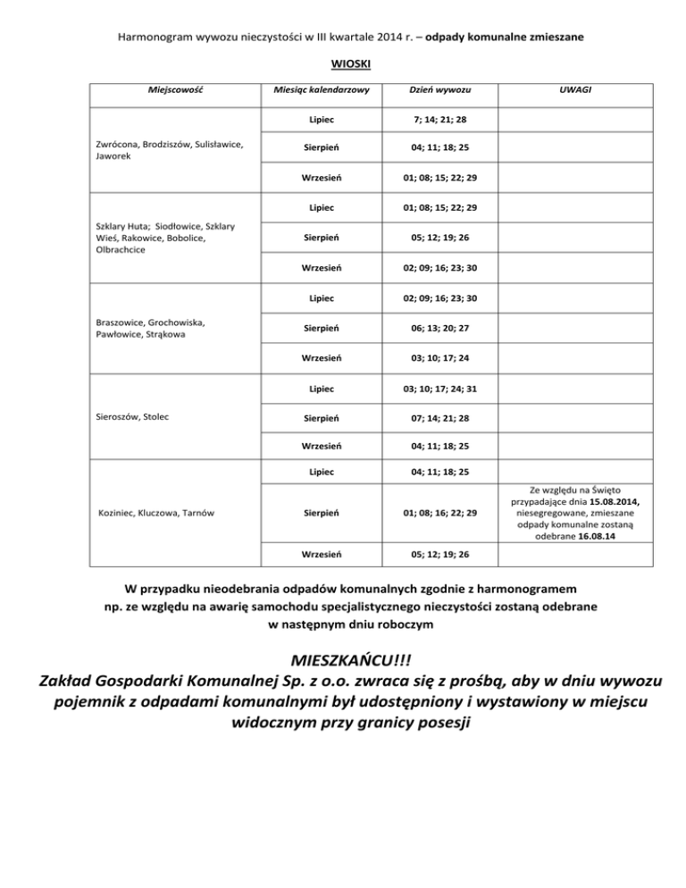 Harmonogram wywozu nieczystości w III kwartale 2014 r. – odpady komunalne zmieszane WIOSKI Miejscowość Zwrócona, Brodziszów, Sulisławice, Jaworek Szklary Huta; Siodłowice, Szklary Wieś, Rakowice, Bobolice, Olbrachcice Braszowice, Grochowiska, Pawłowice, Strąkowa Sieroszów, Stolec Koziniec, Kluczowa, Tarnów Miesiąc kalendarzowy Dzień wywozu Lipiec 7; 14; 21; 28 Sierpień 04; 11; 18; 25 Wrzesień 01; 08; 15; 22; 29 Lipiec 01; 08; 15; 22; 29 Sierpień 05; 12; 19; 26 Wrzesień 02; 09; 16; 23; 30 Lipiec 02; 09; 16; 23; 30 Sierpień 06; 13; 20; 27 Wrzesień 03; 10; 17; 24 Lipiec 03; 10; 17; 24; 31 Sierpień 07; 14; 21; 28 Wrzesień 04; 11; 18; 25 Lipiec 04; 11; 18; 25 Sierpień 01; 08; 16; 22; 29 Wrzesień 05; 12; 19; 26 UWAGI Ze względu na Święto przypadające dnia 15.08.2014, niesegregowane, zmieszane odpady komunalne zostaną odebrane 16.08.14 W przypadku nieodebrania odpadów komunalnych zgodnie z harmonogramem np. ze względu na awarię samochodu specjalistycznego nieczystości zostaną odebrane w następnym dniu roboczym MIESZKAŃCU!!! Zakład Gospodarki Komunalnej Sp. z o.o. zwraca się z prośbą, aby w dniu wywozu pojemnik z odpadami komunalnymi był udostępniony i wystawiony w miejscu widocznym przy granicy posesji Harmonogram odbioru odpadów komunalnych gromadzonych selektywnie - WIOSKI III kwartał 2014 r. Miejscowość Miesiąc Lipiec Zwrócona, Brodziszów, Sulisławice, Sierpień Wrzesień Lipiec Szklary Huta; Siodłowice, Szklary Wieś, Rakowice, Bobolice, Jaworek Sierpień Wrzesień Lipiec Braszowice, Grochowiska, Pawłowice, Strąkowa Sierpień Wrzesień Lipiec Sieroszów, Stolec Sierpień Wrzesień Lipiec Olbrachcice, Koziniec, Kluczowa, Tarnów Sierpień Wrzesień Odpady BIO 07; 14; 21; 28 04; 11; 18; 25 01; 08; 15; 29 01; 08; 15; 22 05; 12; 19; 26 02; 09; 16; 23 02; 09; 16; 23 06; 13; 20; 27 03; 10; 17; 24 03; 10; 17; 24 07; 14; 21; 28 04; 11; 18; 25 04; 11; 18; 25 01; 08; 22; 29 05; 12; 19; 26 Szkło Tworzywa sztuczne i op. z metalu Papier i tektura 07 14 21 04 11 18 01 08 15 01 08 15 05 12 19 02 09 16 02 09 16 06 13 20 03 10 17 03 10 17 07 14 21 04 11 18 04 11 18 01 08 22 05 12 19 W przypadku nieodebrania odpadów segregowanych zgodnie z harmonogramem np. ze względu na awarię samochodu specjalistycznego nieczystości zostaną odebrane w następnym dniu roboczym MIESZKAŃCU!!! Zakład Gospodarki Komunalnej Sp. z o.o. zwraca się z prośbą, aby w dniu odbioru worki lub pojemniki z odpadami segregowanymi były udostępnione i wystawione w miejscu widocznym
