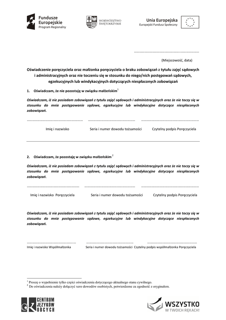 ……………………..……………….……..………………… (Miejscowość, data) Oświadczenie poręczyciela oraz małżonka poręczyciela o braku zobowiązań z tytułu zajęć sądowych i administracyjnych oraz nie toczeniu się w stosunku do niego/nich postępowań sądowych, egzekucyjnych lub windykacyjnych dotyczących niespłaconych zobowiązań 1. Oświadczam, że nie pozostaję w związku małżeńskim 1 Oświadczam, iż nie posiadam zobowiązań z tytułu zajęć sądowych i administracyjnych oraz że nie toczy się w stosunku do mnie postępowanie sądowe, egzekucyjne lub windykacyjne dotyczące niespłaconych zobowiązań. ………………………………………………….…… Imię i nazwisko 2. ……………………………………………… ………………………………………………………… Seria i numer dowodu tożsamości Oświadczam, że pozostaję w związku małżeńskim Czytelny podpis Poręczyciela 2 Oświadczam, iż nie posiadam zobowiązań z tytułu zajęć sądowych i administracyjnych oraz że nie toczy się w stosunku do mnie postępowanie sądowe, egzekucyjne lub windykacyjne dotyczące niespłaconych zobowiązań. …………………………………………………… Imię i nazwisko Poręczyciela …….…………………………………………… ………………………………………………………… Seria i numer dowodu tożsamości Czytelny podpis Poręczyciela Oświadczam, iż nie posiadam zobowiązań z tytułu zajęć sądowych i administracyjnych oraz że nie toczy się w stosunku do mnie postępowanie sądowe, egzekucyjne lub windykacyjne dotyczące niespłaconych zobowiązań. ……………………………………………..… ……………………………………………… Imię i nazwisko Współmałżonka Seria i numer dowodu tożsamości Czytelny podpis współmałżonka Poręczyciela 1 2 ………………………………………………… Proszę o wypełnienie tylko części oświadczenia dotyczącego aktualnego stanu cywilnego. Do oświadczenia należy dołączyć xero dowodów osobistych, potwierdzone za zgodność z oryginałem.