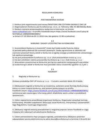 REGULAMIN KONKURSU §1 POSTANOWIENIA OGÓLNE 1. Konkurs jest organizowany pod nazwą ŚWIATOWE DNI CZYTANIA SKŁADU Z DAY UP 2. Organizatorem Konkursu jest Eurofutura sp. z o.o., ul. Telimeny 10B, 43-382 Bielsko-Biała. 3. Konkurs zostanie przeprowadzony wyłącznie w Internecie, na stronie www.czytajsklad.com i na profilu Facebook-owym https://www.facebook.com/Czytaj-Sk %C5%82ad-1489604008030845/ w dniach 27.10.2016 do 03.11.2016 roku (do godziny 12:00 w południe). §2 WARUNKI I ZASADY UCZESTNICTWA W KONKURSIE 1. Uczestnikiem Konkursu („Uczestnik”) może być każda osoba fizyczna, która: a) posiada pełną zdolność do czynności prawnych. Osoby ograniczone w zdolności do czynności prawnych biorą udział w Konkursie za zgodą swojego przedstawiciela ustawowego lub opiekuna prawnego. b) nie jest pracownikiem Eurofutura sp. z o.o. i/lub pracownikiem Arteta sp. z o.o. c) nie jest członkiem rodziny pracownika Eurofutura sp. z o.o. i/lub Arteta sp. z o.o. 2. Warunkiem uczestnictwa w Konkursie jest łączne spełnienie następujących warunków: a) osoba biorąca udział w Konkursie musi posiadać status Uczestnika zgodnie z § 2 pkt 1. §3 NAGRODY 1. Nagrodą w Konkursie są: Zestawy produktów DAY UP Arteta sp. z o.o. - 3 sztuki o wartości około 30 zł każdy. 2. Zdobywcami nagród w Konkursie są Uczestnicy, wyłonieni przez Komisję Konkursową, którzy w czasie trwania konkursu, pod postem konkursowym na profilu Facebook-owym: https://www.facebook.com/Czytaj-Sk%C5%82ad-1489604008030845/ zamieszczą wpis zawierający informację jakich składników warto unikać w produktach spożywczych. 3. Celem zapewnienia prawidłowej organizacji Konkursu, Organizator powołuje komisję konkursową. Wszelkie wątpliwości dotyczące zasad Konkursu, interpretacji i postanowień tego Regulaminu rozstrzyga Organizator. 4. Zdobywcy nagród zostaną powiadomieni o wygranej poprzez serwis Facebook w ciągu 5 (pięciu) dni roboczych od zakończenia Konkursu. 5. Celem potwierdzenia chęci przyjęcia nagrody, powiadomiony Zdobywca powinien odpowiedzieć pocztą elektroniczną na adres [email protected] w terminie 3 (trzech) dni od dnia wysłania powiadomienia, pod rygorem przepadnięcia prawa do nagrody. 6. Za przekazanie nagród zwycięzcy odpowiedzialny będzie pracownik firmy Arteta sp. z o.o. 7. W myśl niniejszego regulaminu, każdy uczestnik zwalnia serwis Facebook z odpowiedzialności za konkurs prowadzony przez Eurofutura sp. z o.o. 8. Konkurs nie jest w żaden sposób sponsorowany, popierany, przeprowadzany przez serwis Facebook, ani z nim związany. §4 DANE OSOBOWE UCZESTNIKÓW KONKURSU 1. Warunkiem udziału w Konkursie jest podanie przez Uczestnika Konkursu prawdziwych danych osobowych, tj.: imienia, nazwiska, adresu, adresu konta poczty elektronicznej, numeru tel. kontaktowego niezbędnych do przekazania nagrody. 2. Przystępując do Konkursu i akceptując niniejszy regulamin Uczestnik wyraża zgodę na przetwarzanie podanych przez niego danych osobowych przez Organizatora. Dane będą przetwarzane w celu przeprowadzenia Konkursu oraz w związku z wydaniem nagrody. §5 POSTANOWIENIA KOŃCOWE Organizator ma prawo do zmiany postanowień niniejszego Regulaminu, o ile nie wpłynie to na pogorszenie warunków uczestnictwa w Konkursie. Dotyczy to w szczególności zmian terminów poszczególnych czynności konkursowych. Zmieniony Regulamin obowiązuje od czasu opublikowania go na stronie www.czytajsklad.com