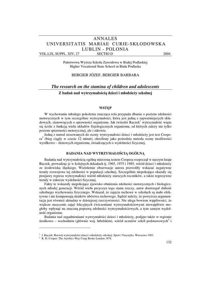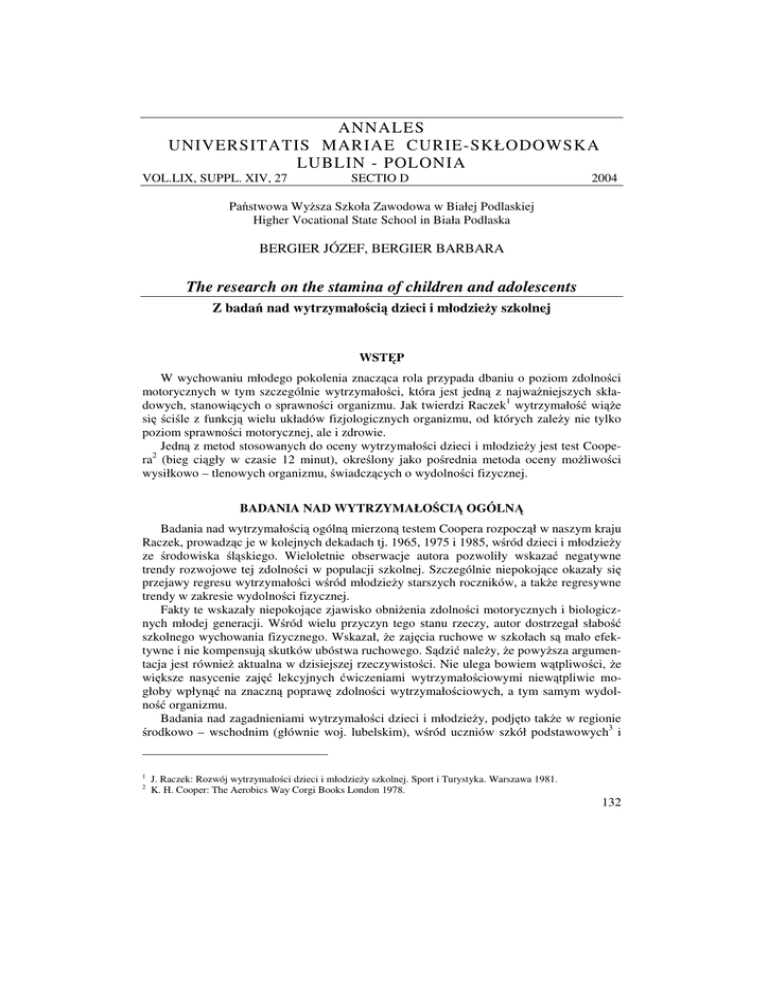 ANNALES UNIVERSITATIS MARIAE CURIE-SKŁODOWSKA LUBLIN - POLONIA VOL.LIX, SUPPL. XIV, 27 SECTIO D 2004 Państwowa Wyższa Szkoła Zawodowa w Białej Podlaskiej Higher Vocational State School in Biała Podlaska BERGIER JÓZEF, BERGIER BARBARA The research on the stamina of children and adolescents Z badań nad wytrzymałością dzieci i młodzieży szkolnej WSTĘP W wychowaniu młodego pokolenia znacząca rola przypada dbaniu o poziom zdolności motorycznych w tym szczególnie wytrzymałości, która jest jedną z najważniejszych składowych, stanowiących o sprawności organizmu. Jak twierdzi Raczek1 wytrzymałość wiąże się ściśle z funkcją wielu układów fizjologicznych organizmu, od których zależy nie tylko poziom sprawności motorycznej, ale i zdrowie. Jedną z metod stosowanych do oceny wytrzymałości dzieci i młodzieży jest test Coopera2 (bieg ciągły w czasie 12 minut), określony jako pośrednia metoda oceny możliwości wysiłkowo – tlenowych organizmu, świadczących o wydolności fizycznej. BADANIA NAD WYTRZYMAŁOŚCIĄ OGÓLNĄ Badania nad wytrzymałością ogólną mierzoną testem Coopera rozpoczął w naszym kraju Raczek, prowadząc je w kolejnych dekadach tj. 1965, 1975 i 1985, wśród dzieci i młodzieży ze środowiska śląskiego. Wieloletnie obserwacje autora pozwoliły wskazać negatywne trendy rozwojowe tej zdolności w populacji szkolnej. Szczególnie niepokojące okazały się przejawy regresu wytrzymałości wśród młodzieży starszych roczników, a także regresywne trendy w zakresie wydolności fizycznej. Fakty te wskazały niepokojące zjawisko obniżenia zdolności motorycznych i biologicznych młodej generacji. Wśród wielu przyczyn tego stanu rzeczy, autor dostrzegał słabość szkolnego wychowania fizycznego. Wskazał, że zajęcia ruchowe w szkołach są mało efektywne i nie kompensują skutków ubóstwa ruchowego. Sądzić należy, że powyższa argumentacja jest również aktualna w dzisiejszej rzeczywistości. Nie ulega bowiem wątpliwości, że większe nasycenie zajęć lekcyjnych ćwiczeniami wytrzymałościowymi niewątpliwie mogłoby wpłynąć na znaczną poprawę zdolności wytrzymałościowych, a tym samym wydolność organizmu. Badania nad zagadnieniami wytrzymałości dzieci i młodzieży, podjęto także w regionie środkowo – wschodnim (głównie woj. lubelskim), wśród uczniów szkół podstawowych3 i 1 2 J. Raczek: Rozwój wytrzymałości dzieci i młodzieży szkolnej. Sport i Turystyka. Warszawa 1981. K. H. Cooper: The Aerobics Way Corgi Books London 1978. 132 ponadpodstawowych4. Charakterystycznym zjawiskiem, które stwierdzono, było szybkie zakończenie dynamiki rozwoju wytrzymałości w wieku 12-13 lat. Badania młodzieży szkół średnich wykazały, iż poziom wytrzymałości u chłopców jest stały, natomiast u dziewcząt obniża się. Różnice w pokonywanym dystansie w wieku 18 lat wyniosły około 700 metrów na korzyść chłopców. Zgromadzony materiał badawczy umożliwił opracowanie regionalnych norm do oceny wytrzymałości młodzieży szkolnej (tab. 1-4). Warto podkreślić, iż wyniki badanych z terenu makroregionu środkowo – wschodniego nie odbiegały od wyników poziomu wytrzymałości z innych regionów kraju. Tym samym możemy stwierdzić, iż obserwujemy wyrównywanie różnic między regionami Polski, wśród których lubelszczyzna należała do terenów zaniedbanych w zakresie poziomu sprawności motorycznej młodzieży szkolnej. W ostatnim okresie przeprowadzono również badania wśród dzieci wiejskich w wieku 10-15 lat z byłego woj. bialskopodlaskiego5 wyliczając VO2 max i wartości punktowe wydajności fizycznej. W ocenie wytrzymałości chłopców stwierdzono stały wzrost, u dziewcząt natomiast wykazano jej progresję w wieku 13 lat. Wyniki tych badań nie wykazały większych różnic między młodzieżą środowisk wiejskich i miejskich. W 1999 roku po raz pierwszy w Polsce przeprowadzono ogólnopolskie badania wytrzymałości mierzonej testem Coopera6. To niezwykle doniosłe wydarzenie. Opracowane normy, popularne także w wielu krajach, dają możliwość porównywania wytrzymałości młodzieży polskiej do rówieśników z innych krajów (tab. 5-6). Każda z tabel obrazuje pięć zakresów wytrzymałości. Jeśli wynik badanego mieści się np. w średnim zakresie odniesienia, oznacza to, że jego wytrzymałość (wydolność) jest na poziomie prawidłowym (uzyskiwanym przez 34 % populacji) i należy dołożyć starań, by poziom ten podnieść, a w najgorszym razie utrzymać (w zależności od wieku). Natomiast wyniki poniżej zakresu średniego są sygnałem, że poziom wytrzymałości (wydolności) tego ćwiczącego jest niewystarczający do optymalnego funkcjonowania w codziennym życiu – nie tylko szkolnym. Większość teoretyków i nauczycieli wychowania fizycznego, skłania się do opinii o niezadowalającym poziomie wytrzymałości naszej młodzieży. Potwierdzeniem tej tezy jest porównanie wyników badań młodzieży z Polski, Czech i Słowacji7. Wyniki te są szczególnie niekorzystne dla naszych dziewcząt. W niektórych grupach wieku, różnice wynoszą ponad 200 m. na korzyść rówieśników z Czech i ponad 100 m. u uczennic na Słowacji. PODSUMOWANIE Zdolności wytrzymałościowe będące także miernikiem wydolności organizmu, w znacznym stopniu świadczą o poziomie zdrowotności dzieci i młodzieży. Badania wytrzymałości prowadzone w naszym kraju na przestrzeni kilkudziesięciu lat, sygnalizują niekorzystne 3 B. Bergier, J. Bergier: Ocena wytrzymałości ogólnej dzieci szkół podstawowych makroregionu środkowowschodniego. [w:] Efekty kształcenia i wychowania w kulturze fizycznej. AWF Katowice 1989. 4 J. Bergier: Poziom wytrzymałości ogólnej młodzieży makroregionu środkowo-wschodniego [w:] Motoryczność dzieci i młodzieży- aspekty teoretyczne oraz implikacje metodyczne J Raczek (red.) AWF Katowice 1986. 5 M. Bytniewski, A. Michalsk