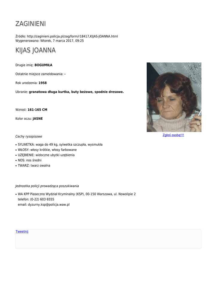 ZAGINIENI Źródło: http://zaginieni.policja.pl/zag/form/r18417,KIJAS-JOANNA.html Wygenerowano: Wtorek, 7 marca 2017, 09:25 KIJAS JOANNA Drugie imię: BOGUMIŁA Ostatnie miejsce zameldowania: Rok urodzenia: 1958 Ubranie: granatowa długa kurtka, buty beżowe, spodnie dresowe. Wzrost: 161-165 CM Kolor oczu: JASNE Cechy rysopisowe ● SYLWETKA: waga do 49 kg, sylwetka szczupła, wysmukła ● WŁOSY: włosy krótkie, włosy farbowane ● UZĘBIENIE: widoczne ubytki uzębienia ● NOS: nos średni ● TWARZ: twarz owalna Jednostka policji prowadząca poszukiwania ● WA KPP Piaseczno Wydział Kryminalny (KSP), 00-150 Warszawa, ul. Nowolipie 2 telefon: (0-22) 603 6555 email: [email protected] Tweetnij Zgłoś osobę!!!