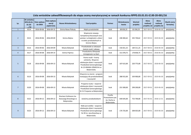 Lista wniosków zakwalifikowanych do etapu oceny merytorycznej w ramach konkursu RPPD.03.01.01-IZ.00-20-001/16 Lp. 1 Nr wniosku Data wpływu RPO.03.01. Data wpływu wersji do GWA 01-20papierowej …./16 0114 2016-09-06 2016-09-15 Nazwa Wnioskodawcy Tytuł projektu Partner Wnioskowana kwota Wartość projektu Okres realizacji projektu od Okres realizacji projektu do Wynik oceny formalnej Gmina Nowe Piekuty Mądry przedszkolak brak 68 636,25 81 036,25 2017-09-01 2018-06-30 pozytywny Wspieranie rozwoju kompetencji kluczowych oraz postaw i umiejętności u dzieci w wieku przedszkolnych w Gminie Zbójna brak 248 484,62 292 740,62 2017-09-01 2019-06-30 pozytywny brak 156 651,25 184 311,25 2017-08-01 2018-06-30 pozytywny brak 151 078,75 178 858,75 2017-08-01 2018-06-30 pozytywny brak 187 615,00 220 775,00 2017-08-01 2018-06-30 pozytywny 2 0115 2016-09-06 2016-09-09 Gmina Zbójna 3 0116 2016-09-06 2016-09-09 Miasto Białystok 4 0117 2016-09-08 2016-09-14 Gmina Piątnica Przedszkolaki w ciekawym świecie nauki i zabawy Przedszkolna Olimpiada Umiejętności na Start 5 0118 2016-09-08 2016-09-13 Miasto Białystok Kraina nauki – krainą uśmiechu. Wsparcie edukacyjne dzieci i nauczycieli Przedszkola Samorządowego Nr 25 KRAINA UŚMIECHU w Białymstoku 6 0119 2016-09-08 2016-09-13 Miasto Białystok Wsparcie na starcie – program rozwijający dla przedszkolaków i nauczycieli brak 288 915,00 339 900,00 2017-09-01 2019-06-30 pozytywny 2016-09-13 Miasto Białystok Przyjazna nauka – wsparcie edukacyjne dzieci i nauczycieli Przedszkola Samorządowego Nr 51 Przyjazne w Białymstoku brak 253 300,00 298 200,00 2017-09-01 2019-06-30 pozytywny 2016-09-12 Bractwo Cerkiewne św. Atanazego Brzeskiego w Białymstoku Jesteśmy przedszkolakami Parafia Prawosławna pw. św. Ducha w Białymstoku 640 645,00 753 700,00 2017-05-01 2018-12-31 pozytywny Miasto Białystok Małe jest wielkie – wsparcie edukacyjne dzieci i nauczycieli Przedszkola Samorządowego Nr 49 im. Jana Brzechwy w Białymstoku brak 176 725,00 208 025,00 2017-09-01 2019-06-30 pozytywny 7 8 9 0120 0122 0123 2016-09-08 2016-09-12 2016-09-12 2016-09-13 10 0125 2016-09-13 2016-09-15 Towarzystwo Amicus Kreatywny Klub Małych Odkrywców brak 101 881,75 120 232,75 2017-08-01 2018-12-31 pozytywny 11 0128 2016-09-13 2016-09-14 Marek Danilewicz Kreatywny świat przedszkolaka brak 421 561,50 497 137,50 2017-09-01 2018-06-30 pozytywny 12 0131 2016-09-14 2016-09-14 Miasto Kolno brak 266 366,25 313 376,25 2017-08-01 2018-07-31 pozytywny 13 0132 2016-09-14 2016-09-14 Miasto Białystok Przedszkole na plus "Równy start malucha sukcesem w przyszłości". brak 742 306,84 873 886,15 2017-08-01 2019-07-31 pozytywny 14 0134 2016-09-14 2016-09-19 Gmina Miasto Augustów Słoneczna Szósteczka brak 176 135,00 220 885,00 2017-09-01 2018-06-30 pozytywny 15 0135 2016-09-14 2016-09-15 Gmina Łomża SZANSA NA LEPSZY START brak 518 332,50 609 862,50 2017-08-01 2019-07-31 pozytywny "Blękitna Dolina" - dodatkowe miejsca przedszkolne poprzez utworzenie nowego niepublicznego przedszkola integracyjnego z oddziałami dla dzieci autystycznych. brak 1 469 922,61 1 729 320,72 2017-04-17 2018-08-31 pozytywny 16 0138 2016-09-14 2016-09-16 Meritum spółka z ograniczoną odpowiedzialnością 17 0139 2016-09-14 2016-09-15 Gmina Miejska Hajnówka Przedszkole jak z bajki brak 192 272,50 227 932,50 2017-08-01 2019-07-31 pozytywny brak 360 057,75 423 751,75 2017-08-01 2018-07-31 pozytywny 18 0142 2016-09-14 2016-09-20 Miasto Białystok "Z INNOWACJĄ ZA PAN BRAT, ABY LEPIEJ POZNAĆ ŚWIAT" 19 0143 2016-09-14 2016-09-20 Białostockie Towarzystwo Oświatowe Kreatywne maluchy - program wsparcia dzieci ze Społecznego Przedszkola BTO w Białymstoku brak 155 324,75 182 788,75 2017-08-01 2019-07-31 pozytywny 20 0146 2016-09-15 2016-09-15 Gmina Miasto Zambrów Kreatywny przedszkolak biegle liczy i poznaje świat brak 132 929,97 162 152,37 2017-09-01 2019-06-30 pozytywny 21 0149 2016-09-15 2016-09-15 Ewa Suchocka ul. Bociania 15, 15-533 Białystok UNIWERSYTET SUKCESU brak 219 533,75 258 275,00 2017-09-01 2019-06-30 pozytywny 22 0151 2016-09-15 2016-09-20 "VENA" Maria Rutkowska Wzrost jakości oferty edukacyjnej w Przedszkolu Magic Star Polskie Centrum Edukacji i Analiz ORDO Sp. z o.o. 437 959,50 515 250,62 2017-08-01 2018-08-31 pozytywny 23 0154 2016-09-15 2016-09-19 Gmina Supraśl Jestem Przedszkolakiem brak 170 000,00 200 000,00 2017-07-01 2018-07-31 pozytywny 520 465,50 612 312,50 2017-07-03 2019-06-28 pozytywny 24 0158 2016-09-15 2016-09-20 Miasto Sejny Uniwersytet dla Małolatków Instytut Badań Edukacyjnych 25 0159 2016-09-15 2016-09-26 Miasto Białystok Kreatywne dziecko inwestycją w przyszłość brak 156 782,50 186 062,50 2017-09-01 2018-07-31 pozytywny 26 0161 2016-09-15 2016-09-19 Gmina Supraśl Aktywny Przedszkolak brak 147 464,37 173 487,50 2017-07-01 2018-07-31 pozytywny 180 536,81 212 396,25 2017-09-01 2018-06-30 pozytywny 665 381,53 782 801,80 2017-06-01 2018-09-30 pozytywny 27 0173 2016-09-15 2016-09-16 Miasto Białystok 28 0182 2016-09-15 2016-09-22 Marzena DąbrowskaKałmucka Kreatywność i przedsiębiorczość dziecka – brak kluczem do sukcesu Projekt z Innej Bajki MiroTrans Stworzenie nowych miejsc TransportSpedycj przedszkolnych dla dzieci 3 i 4 a Robert Mirowski letnich w m. Białystok 29 0188 2016-09-19 AM Małgorzata SikorskaGogol - wspólnik spółki 2016-09-20 cywilnej AM Agnieszka Toczydłowska wspólnik spółki cywilnej Mali Podróżnicy - Wielcy Odkrywcy. Wzrost jakości edukacji przedszkolnej. Polskie Centrum Edukacji i Analiz ORDO Sp. z o.o. 438 436,00 515 811,25 2017-08-01 2018-07-31 pozytywny Polskie Centrum Edukacji i Analiz ORDO Sp. z o.o. 436 371,00 513 391,25 2017-07-01 2018-07-31 pozytywny brak 693 080,56 816 353,22 2017-08-01 2019-07-31 pozytywny 30 0189 2016-09-19 AM Małgorzata SikorskaGogol - wspólnik spółki Mali Podróżnicy - Przedszkole 2016-09-20 cywilnej przyjazne maluchom AM Agnieszka Toczydłowska wspólnik spółki cywilnej 31 0191 2016-09-20