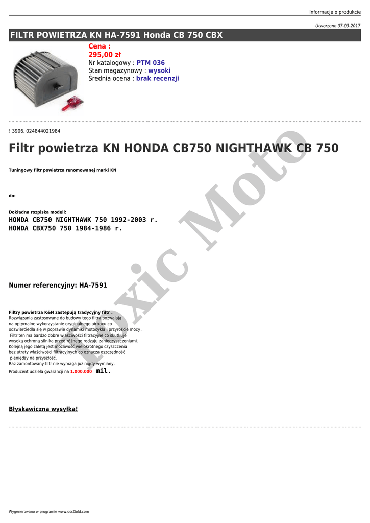 Informacje o produkcie Utworzono 07-03-2017 FILTR POWIETRZA KN HA-7591 Honda CB 750 CBX Cena : 295,00 zł Nr katalogowy : PTM 036 Stan magazynowy : wysoki Średnia ocena : brak recenzji ! 3906, 024844021984 ot o Filtr powietrza KN HONDA CB750 NIGHTHAWK CB 750 Tuningowy filtr powietrza renomowanej marki KN do: M Dokładna rozpiska modeli: xi Numer referencyjny: HA-7591 c HONDA CB750 NIGHTHAWK 750 1992-2003 r. HONDA CBX750 750 1984-1986 r. To Filtry powietrza K&N zastępują tradycyjny filtr . Rozwiązania zastosowane do budowy tego filtra pozwalają na optymalne wykorzystanie oryginalnego airboxu co odzwierciedla się w poprawie dynamiki motocykla i przyroście mocy . Filtr ten ma bardzo dobre właściwości filtracyjne co skutkuje wysoką ochroną silnika przed różnego rodzaju zanieczyszczeniami. Kolejną jego zaletą jest możliwość wielokrotnego czyszczenia bez utraty właściwości filtracyjnych co oznacza oszczędność pieniędzy na przyszłość. Raz zamontowany filtr nie wymaga już nigdy wymiany. Producent udziela gwarancji na 1.000.000 Błyskawiczna wysyłka! Wygenerowano w programie www.oscGold.com mil.