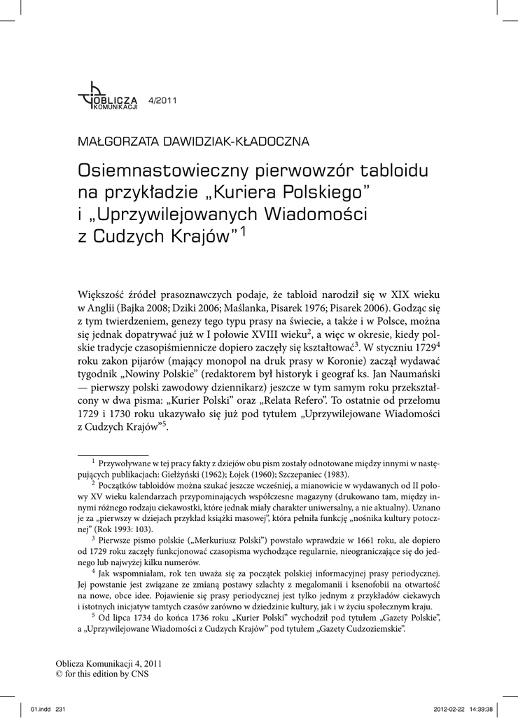 4/2011 MAŁGORZATA DAWIDZIAK-KŁADOCZNA Osiemnastowieczny pierwowzór tabloidu na przykładzie „Kuriera Polskiego” i „Uprzywilejowanych Wiadomości z Cudzych Krajów”1 Większość źródeł prasoznawczych podaje, że tabloid narodził się w XIX wieku w Anglii (Bajka 2008; Dziki 2006; Maślanka, Pisarek 1976; Pisarek 2006). Godząc się z tym twierdzeniem, genezy tego typu prasy na świecie, a także i w Polsce, można się jednak dopatrywać już w I połowie XVIII wieku2, a więc w okresie, kiedy polskie tradycje czasopiśmiennicze dopiero zaczęły się kształtować3. W styczniu 17294 roku zakon pijarów (mający monopol na druk prasy w Koronie) zaczął wydawać tygodnik „Nowiny Polskie” (redaktorem był historyk i geograf ks. Jan Naumański — pierwszy polski zawodowy dziennikarz) jeszcze w tym samym roku przekształcony w dwa pisma: „Kurier Polski” oraz „Relata Refero”. To ostatnie od przełomu 1729 i 1730 roku ukazywało się już pod tytułem „Uprzywilejowane Wiadomości z Cudzych Krajów”5. 1 Przywoływane w tej pracy fakty z dziejów obu pism zostały odnotowane między innymi w następujących publikacjach: Giełżyński (1962); Łojek (1960); Szczepaniec (1983). 2 Początków tabloidów można szukać jeszcze wcześniej, a mianowicie w wydawanych od II połowy XV wieku kalendarzach przypominających współczesne magazyny (drukowano tam, między innymi różnego rodzaju ciekawostki, które jednak miały charakter uniwersalny, a nie aktualny). Uznano je za „pierwszy w dziejach przykład książki masowej”, która pełniła funkcję „nośnika kultury potocznej” (Rok 1993: 103). 3 Pierwsze pismo polskie („Merkuriusz Polski”) powstało wprawdzie w 1661 roku, ale dopiero od 1729 roku zaczęły funkcjonować czasopisma wychodzące regularnie, nieograniczające się do jednego lub najwyżej kilku numerów. 4 Jak wspomniałam, rok ten uważa się za początek polskiej informacyjnej prasy periodycznej. Jej powstanie jest związane ze zmianą postawy szlachty z megalomanii i ksenofobii na otwartość na nowe, obce idee. Pojawienie się prasy periodycznej jest tylko jednym z przykładów ciekawych i istotnych inicjatyw tamtych czasów zarówno w dziedzinie kultury, jak i w życiu społecznym kraju. 5 Od lipca 1734 do końca 1736 roku „Kurier Polski” wychodził pod tytułem „Gazety Polskie”, a „Uprzywilejowane Wiadomości z Cudzych Krajów” pod tytułem „Gazety Cudzoziemskie”. Oblicza Komunikacji 4, 2011 © for this edition by CNS 01.indd 231 2012-02-22 14:39:38 232 MAŁGORZATA DAWIDZIAK-KŁADOCZNA Kilka lat później wydawcami obu periodyków zostali jezuici6, a redaktorem głównym — Michał Łowisz7. Historycy prasy są zgodni, że właśnie wtedy drastycznie obniżył się poziom zarówno „Kuriera Polskiego”, jak i „Uprzywilejowanych Wiadomości z Cudzych Krajów”. Wynikało to ze schlebiania przez jezuitów gustom szlachty polskiej, jej zamiłowaniu do plotek i sensacji towarzyskich (por. m.in. Giełżyński 1962; Szczepaniec 1983). Właśnie numery obu pism pochodzące z tego okresu uważam za pierwowzór dzisiejszego tabloidu. W 1760 roku gazety zmieniły tytuły na „Kurier Warszawski” i „Wiadomości Uprzywilejowane Warszawskie”, a w 1765 roku ponownie się połączyły i wychodziły do 1773 dwa razy w tygodniu pod tytułem „Wiadomości Warszawskie”. Ukazujące się blisko pół wieku pisma8 były wielkim osiągnięciem, zważywszy, że do czasu ich powstania większość tytułów należy uznać za efemerydy, które swą karierę kończyły po kilku lub kilkunastu numerach. Oczywiście omawiane tu czasopisma zmieniały swój charakter, co było uzależnione między innymi od wydawcy oraz sytuacji politycznej w kraju i na arenie międzynarodowej9. Podstawa materiałowa Przedstawione w dalszej części artykułu wnioski są oparte na analizach zachowanych numerów trzech roczników (1754, 1756, 1757) „Kuriera Polskiego” oraz „Uprzywilejowanych Wiadomości z Cudzych Krajów”10, przechowywanych między innymi w Bibliotece Kórnickiej11, a także udostępnianych w wersji elektronicznej przez Wielkopolską Bibliotekę Cyfrową12. Oba analizowane pisma były czterostronicowymi tygodnikami wydawanymi pierwotnie w formacie A4, a w latach 1740–1760 — ze względu na wysoką cenę papieru i związaną z tym oszczędność — w formacie 19,5 x 16 cm (Giełżyński 6 Do 1736 roku wyłączność na druk mieli pijarzy, w latach 1737–1740 oba pisma równolegle wydawali pijarzy i jezuici, natomiast po 1740 roku monopol przejęli jezuici (Szczepaniec 1983). 7 Po Naumańskim, a przed Łowiszem pisma redagował najprawdopodobniej Jan Milżewski (Hombek 2001). 8 W wyniku trudnej sytuacji politycznej w wydawaniu obu pism nastąpiła przerwa od stycznia do lipca 1734 roku. 9 Na przykład „Uprzywilejowane Wiadomości” od II kwartału 1756 roku odeszły od informacji obyczajowych. Było to spowodowane wojną wypowiedzianą Francji przez Wielką Brytanię 15 maja 1756 roku. Wspomniane pismo zaczęło informować o działaniach zbrojnych, a jego poprzednią funkcję przejął „Kurier Polski”. Kiedy natomiast sytuacja polityczna nie dawała pretekstu do przekazywania wieści o istotnych wydarzeniach, zajmowano się błahostkami. 10 Dla „Kuriera Polskiego” w dalszej części tekstu używam skrótu KP, a dla „Uprzywilejowanych Wiadomości z Cudzych Krajów” — UW. 11 „Kurier Polski” 21 grudnia 1729–31 grudnia 1760 syg. Cz. 2271, Cz. 22649; „Uprzywilejowane Wiadomości z Cudzych Krajów” syg. Cz. 2271 a, Cz. 22648. 12 www.wbc.poznan.pl (dostęp: 20.02.2009). Oblicza Komunikacji 4, 2011 © for this edition by CNS 01.indd 232 2012-02-22 14:39:38 OSIEMNASTOWIECZNY PIERWOWZÓR TABLOIDU 233 1962). Informacje były drukowane w dwóch szpaltach. Poszczególne zeszyty były numerowane, ale nie datowane. Źródła informacji UW zawierały polskie tłumaczenia tekstów publikowanych w gazetach międzynar