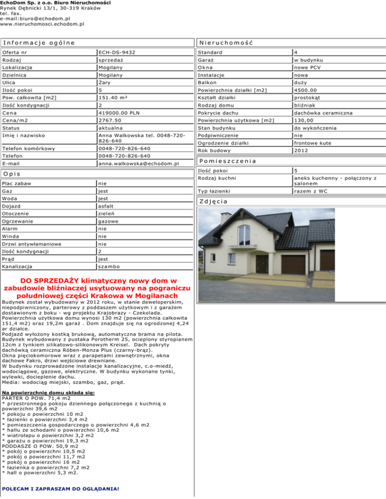 EchoDom Sp. z o.o. Biuro Nieruchomości Rynek Dębnicki 13/1, 30-319 Kraków tel. fax. e-mail:[email protected] www.nieruchomosci.echodom.pl Informacje ogólne Nieruchomość Oferta nr ECH-DS-9432 Standard 4 Rodzaj sprzedaż Garaż w budynku Lokalizacja Mogilany Okna nowe PCV Dzielnica Mogilany Instalacje nowa Ulica Żary Balkon duży Ilość pokoi 5 Powierzchnia działki [m2] 4500.00 Pow. całkowita [m2] 151.40 m² Kształt działki prostokąt Ilość kondygnacji 2 Rodzaj domu bliźniak Cena 419000.00 PLN Pokrycie dachu dachówka ceramiczna Cena/m2 2767.50 Powierzchnia użytkowa [m2] 130,00 Status aktualna Stan budynku do wykończenia Imię i nazwisko Anna Walkowska tel. 0048-720826-640 Podpiwniczenie nie Ogrodzenie działki frontowe kute Telefon komórkowy 0048-720-826-640 Rok budowy 2012 Telefon 0048-720-826-640 E-mail [email protected] Opis Plac zabaw nie Gaz jest Woda jest Dojazd asfalt Otoczenie zieleń Ogrzewanie gazowe Alarm nie Winda nie Drzwi antywłamaniowe nie Ilość kondygnacji 2 Prąd jest Kanalizacja szambo DO SPRZEDAŻY klimatyczny nowy dom w zabudowie bliźniaczej usytuowany na pograniczu południowej części Krakowa w Mogilanach Budynek został wybudowany w 2012 roku, w stanie deweloperskim, niepodpiwniczony, parterowy z poddaszem użytkowym i z garażem dostawionym z boku - wg projektu Krajobrazy - Czekolada. Powierzchnia użytkowa domu wynosi 130 m2 (powierzchnia całkowita 151,4 m2) oraz 19,2m garaż . Dom znajduje się na ogrodzonej 4,24 ar działce. Podjazd wyłożony kostką brukową, automatyczna brama na pilota. Budynek wybudowany z pustaka Porotherm 25, ocieplony styropianem 12cm z tynkiem silikatowo-silikonowym Kreisel. Dach pokryty dachówką ceramiczna Röben-Monza Plus (czarny-brąz). Okna pięciokomorowe wraz z parapetami zewnętrznymi, okna dachowe Fakro, drzwi wejściowe drewniane. W budynku rozprowadzone instalacje kanalizacyjne, c.o-miedź, wodociągowe, gazowe, elektryczne. W budynku wykonane tynki, wylewki, docieplenie dachu. Media: wodociąg miejski, szambo, gaz, prąd. Na powierzchnię domu składa się: PARTER O POW. 71,4 m2 * przestronnego pokoju dziennego połączonego z kuchnią o powierzchni 39,6 m2 * pokoju o powierzchni 10 m2 * łazienki o powierzchni 3,4 m2 * pomieszczenia gospodarczego o powierzchni 4,6 m2 * hallu ze schodami o powierzchni 10,6 m2 * wiatrołapu o powierzchni 3,2 m2 * garażu o powierzchni 19,3 m2 PODDASZE O POW. 50,9 m2 * pokój o powierzchni 10,5 m2 * pokój o powierzchni 11,7 m2 * pokój o powierzchni 16 m2 * łazienka o powierzchni 7,2 m2 * hall o powierzchni 5,3 m2. POLECAM I ZAPRASZAM DO OGLĄDANIA! Pomieszczenia Ilość pokoi 5 Rodzaj kuchni aneks kuchenny - połączony z salonem Typ łazienki razem z WC Zdjęcia BIURO NIERUCHOMOŚCI EchoDom Sp. z o.o.- szeroki wybór ofert. Kompleksowa obsługa przy sprzedaży, wynajmie nieruchomości. Atrakcyjne propozycje kredytowe, sporządzane wedle potrzeb Klientów. ZAPEWNIAMY PROFESJONALIZM I BEZPIECZEŃSTWO ZAWIERANYCH TRANSAKCJI ! © Wszelkie prawa zastrzeżone - EchoDom