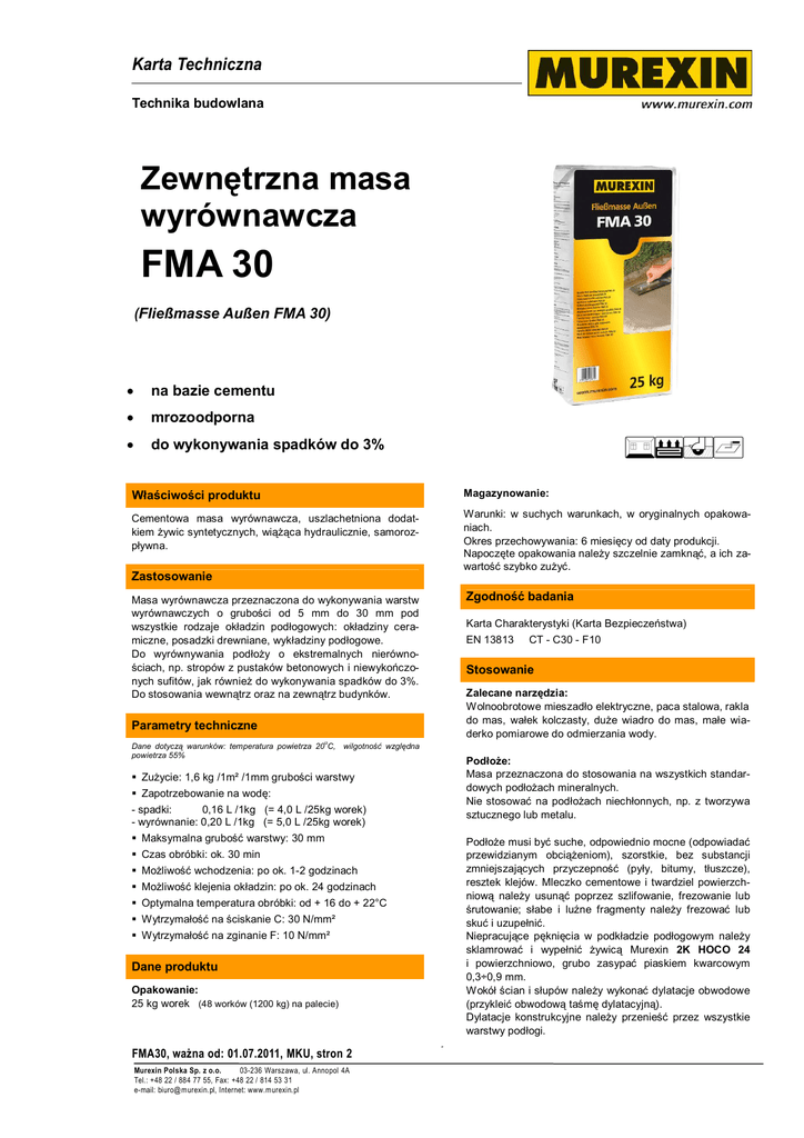 Karta Techniczna Technika budowlana BAT_ FMA30 Zewnętrzna masa wyrównawcza FMA 30 (Fließmasse Außen FMA 30) na bazie cementu mrozoodporna do wykonywania spadków do 3% Właściwości produktu Magazynowanie: Cementowa masa wyrównawcza, uszlachetniona dodatkiem żywic syntetycznych, wiążąca hydraulicznie, samorozpływna. Warunki: w suchych warunkach, w oryginalnych opakowaniach. Okres przechowywania: 6 miesięcy od daty produkcji. Napoczęte opakowania należy szczelnie zamknąć, a ich zawartość szybko zużyć. Zastosowanie Zgodność badania Masa wyrównawcza przeznaczona do wykonywania warstw wyrównawczych o grubości od 5 mm do 30 mm pod wszystkie rodzaje okładzin podłogowych: okładziny ceramiczne, posadzki drewniane, wykładziny podłogowe. Do wyrównywania podłoży o ekstremalnych nierównościach, np. stropów z pustaków betonowych i niewykończonych sufitów, jak również do wykonywania spadków do 3%. Do stosowania wewnątrz oraz na zewnątrz budynków. Karta Charakterystyki (Karta Bezpieczeństwa) EN 13813 CT - C30 - F10 Stosowanie Zalecane narzędzia: Wolnoobrotowe mieszadło elektryczne, paca stalowa, rakla do mas, wałek kolczasty, duże wiadro do mas, małe wiaderko pomiarowe do odmierzania wody. Parametry techniczne o Dane dotyczą warunków: temperatura powietrza 20 C, wilgotność względna powietrza 55% Podłoże: Masa przeznaczona do stosowania na wszystkich standardowych podłożach mineralnych. Nie stosować na podłożach niechłonnych, np. z tworzywa sztucznego lub metalu. Zużycie: 1,6 kg /1m² /1mm grubości warstwy Zapotrzebowanie na wodę: - spadki: 0,16 L /1kg (= 4,0 L /25kg worek) - wyrównanie: 0,20 L /1kg (= 5,0 L /25kg worek) Maksymalna grubość warstwy: 30 mm Podłoże musi być suche, odpowiednio mocne (odpowiadać przewidzianym obciążeniom), szorstkie, bez substancji zmniejszających przyczepność (pyły, bitumy, tłuszcze), resztek klejów. Mleczko cementowe i twardziel powierzchniową należy usunąć poprzez szlifowanie, frezowanie lub śrutowanie; słabe i luźne fragmenty należy frezować lub skuć i uzupełnić. Niepracujące pęknięcia w podkładzie podłogowym należy sklamrować i wypełnić żywicą Murexin 2K HOCO 24 i powierzchniowo, grubo zasypać piaskiem kwarcowym 0,3÷0,9 mm. Wokół ścian i słupów należy wykonać dylatacje obwodowe (przykleić obwodową taśmę dylatacyjną). Dylatacje konstrukcyjne należy przenieść przez wszystkie warstwy podłogi. Czas obróbki: ok. 30 min Możliwość wchodzenia: po ok. 1-2 godzinach Możliwość klejenia okładzin: po ok. 24 godzinach Optymalna temperatura obróbki: od + 16 do + 22°C Wytrzymałość na ściskanie C: 30 N/mm² Wytrzymałość na zginanie F: 10 N/mm² Dane produktu Opakowanie: 25 kg worek (48 worków (1200 kg) na palecie) FMA30, ważna od: 01.07.2011, MKU, stron 2 Murexin Polska Sp. z o.o. 03-236 Warszawa, ul. Annopol 4A Tel.: +48 22 / 884 77 55, Fax: +48 22 / 814 53 31 e-mail: [email protected], Internet: www.murexin.pl 1 Karta Techniczna Technika budowlana BAT_ FMA30 Gruntowanie: Podłoża chłonne: grunt penetrujący LF1 Podłoża niechłonne: Super grunt D4 Usuwanie odpadów: Resztki produktów należy w miarę możliwości zebrać i zużyć. Nie wylewać do kanalizacji i zbiorników wodnych. Mieszanie: Do dokładnie odmierzonej zimnej wody należy powoli wsypywać masę FMA30 i mieszać przez ok. 4 minuty mieszadłem wolnoobrotowym aż do uzyskania jednorodnej płynnej masy. Proporcja dodawania wody: - 5,0 litrów wody na worek 25 kg - konsystencja samopoziomująca (ok. 0,20 L /1kg) - 4,0 litry wody na worek 25 kg - umożliwia wykonywanie spadków (ok. 0,16 L /1kg) Bezpieczeństwo i higiena pracy: Przestrzegać specyfikacji oraz informacji o stosowaniu, czyszczeniu i utylizacji podanych w Karcie Charakterystyki produktu. ________________________________ Niniejsza karta techniczna bazuje na rozległym doświadczeniu, została stworzona z najlepszej woli, nie jest prawnie wiążąca i nie jest ofertą w rozumieniu prawa czy też gwarancją wynikającą z zamówienia lub umowy sprzedaży. Aby zminimalizować ryzyko popełnienia błędów wykonawczych w karcie zawarto określone, ograniczone informacje. Naturalnie nie mogą być tam dokładnie opisane wszystkie dotychczasowe i możliwe zastosowania produktu. Zrezygnowano z danych, które dla fachowców są oczywiste. W przypadku niejasności bądź wątpliwości, jak również ujawnienia jakichkolwiek dodatkowych czynników mogących mieć wpływ na prawidłowość aplikacji produktu bądź technologii wykonania systemu, Wykonawca winien uprzednio przeprowadzić próbę na miejscu budowy, zabezpieczając w odpowiedni sposób jej wyniki oraz skontaktować się z działem technicznym firmy Murexin Polska Sp. z o.o. Niezależnie od powyższych zaleceń Wykonawca zobowiązany jest do działania zgodnie z obowiązującymi przepisami, normami i wytycznymi oraz z zasadami sztuki budowlanej. W momencie wydania nowego opracowania tej karty technicznej, poprzednia wersja traci swoją ważność. Obróbka: Płynną masę wylewać na starannie przygotowane i wypoziomowane podłoże najlepiej jedną warstwą nieprzekraczającą 30 mm grubości. Masę rozprowadzić równomiernie używając rakli lub pacy. Masę odpowietrzyć wałkiem kolczastym. W przypadku konieczności nałożenia kolejnej warstwy, układać ją jak tylko będzie można wejść na warstwę ułożoną wcześniej (po upływie ok. 2 godz.). Przy dłuższej przerwie ponownie zagruntować. Masa FMA 30 może być układana za pomocą pompy i raklowana. Optymalna temperatura obróbki: od + 16 do + 22°C Uwaga: Przy niechłonnych podłożach i złych warunkach klimatycznych należy uwzględnić dłuższe czasy schnięcia masy. Zbyt duża ilość wody powoduje zmniejszenie wytrzymałości masy. Pielęgnacja: Masę FMA30 należy chronić przed nasłonecznieniem, zbyt szybkim odparowaniem wilgoci i zbyt szybkim przesychaniem podczas wiązania. Dodatkowe wskazó