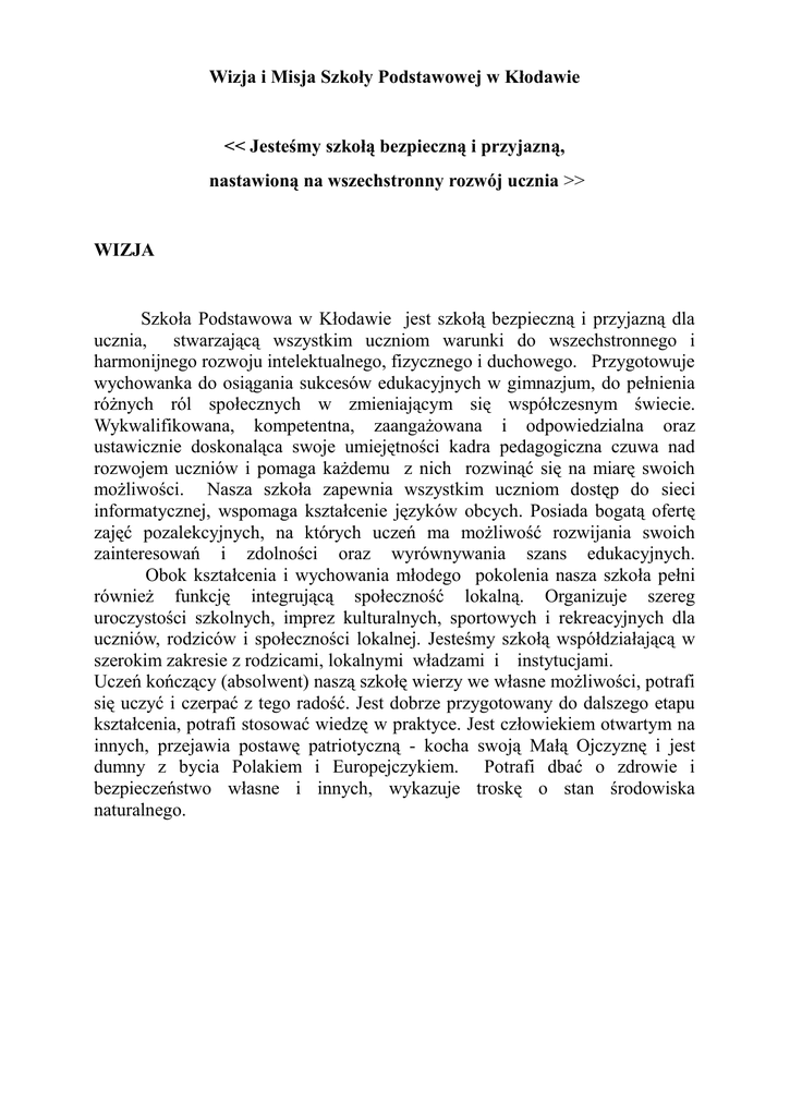 Wizja i Misja Szkoły Podstawowej w Kłodawie << Jesteśmy szkołą bezpieczną i przyjazną, nastawioną na wszechstronny rozwój ucznia >> WIZJA Szkoła Podstawowa w Kłodawie jest szkołą bezpieczną i przyjazną dla ucznia, stwarzającą wszystkim uczniom warunki do wszechstronnego i harmonijnego rozwoju intelektualnego, fizycznego i duchowego. Przygotowuje wychowanka do osiągania sukcesów edukacyjnych w gimnazjum, do pełnienia różnych ról społecznych w zmieniającym się współczesnym świecie. Wykwalifikowana, kompetentna, zaangażowana i odpowiedzialna oraz ustawicznie doskonaląca swoje umiejętności kadra pedagogiczna czuwa nad rozwojem uczniów i pomaga każdemu z nich rozwinąć się na miarę swoich możliwości. Nasza szkoła zapewnia wszystkim uczniom dostęp do sieci informatycznej, wspomaga kształcenie języków obcych. Posiada bogatą ofertę zajęć pozalekcyjnych, na których uczeń ma możliwość rozwijania swoich zainteresowań i zdolności oraz wyrównywania szans edukacyjnych. Obok kształcenia i wychowania młodego pokolenia nasza szkoła pełni również funkcję integrującą społeczność lokalną. Organizuje szereg uroczystości szkolnych, imprez kulturalnych, sportowych i rekreacyjnych dla uczniów, rodziców i społeczności lokalnej. Jesteśmy szkołą współdziałającą w szerokim zakresie z rodzicami, lokalnymi władzami i instytucjami. Uczeń kończący (absolwent) naszą szkołę wierzy we własne możliwości, potrafi się uczyć i czerpać z tego radość. Jest dobrze przygotowany do dalszego etapu kształcenia, potrafi stosować wiedzę w praktyce. Jest człowiekiem otwartym na innych, przejawia postawę patriotyczną - kocha swoją Małą Ojczyznę i jest dumny z bycia Polakiem i Europejczykiem. Potrafi dbać o zdrowie i bezpieczeństwo własne i innych, wykazuje troskę o stan środowiska naturalnego. MISJA Szkoła to nasz wspólny dom, za który ponosimy wspólną odpowiedzialność, wspólnie tworzymy w nim warunki przyjazne dzieciom i zmierzamy do osiągnięcia modelu absolwenta. Szkoła Podstawowa w Kłodawie jest miejscem, w którym stwarza się warunki do nauki dla wszystkich dzieci mając na uwadze wszechstronny rozwój osobowości dziecka ze szczególnym uwzględnieniem jego potrzeb, zainteresowań, możliwości i umiejętności. Wspieramy go w procesie nabywania wiedzy, umiejętności, postaw i nawyków, które zapewnią mu przygotowanie do racjonalnego i godnego życia we współczesnym świecie oraz kontynuacji nauki na dalszym etapie kształcenia. Troszczymy się o jego bezpieczeństwo i zdrowie, umożliwiamy rozwijanie talentów i zdolności uczniów na zajęciach pozalekcyjnych i w organizacjach działających na terenie szkoły. Wykwalifikowana kadra nauczycielska prowadzi zajęcia nowoczesnymi metodami, wdraża programy autorskie kształcące umiejętności. Pokazujemy jak pożytecznie spędzać czas wolny. Wprowadzamy dzieci w świat kultury i sztuki, przez co uwrażliwiamy na piękno. Uczymy przestrzegania norm społecznych, szacunku wobec innych, zwłaszcza osób starszych i niepełnosprawnych, wzajemnej pomocy, empatii oraz tolerancji. W naszej placówce pielęgnujemy tradycje szkolne, regionalne i narodowe. Pragniemy, aby nasz wychowanek odczuwał satysfakcję ze swoich dokonań, miał poczucie własnej wartości oraz dumy z własnego miejsca zamieszkania, regionu, ojczyzny, do życia w zjednoczonej Europie. Promujemy zdrowy styl życia wykorzystując lokalne warunki tj. dobre trasy rowerowe organizując wycieczki rowerowe po ZPK, biwaki, lekcje WF w terenie. Wspieramy także uczniów w trudnej sytuacji rodzinnej i materialnej oraz uczymy jak przezwyciężać niepowodzenia. Dbamy o dobre imię naszej szkoły, a także o to, aby rodzic i uczeń byli usatysfakcjonowani z jakości i fachowości naszych działań. Staramy się być przyjacielem, powiernikiem i „drugim domem” naszych uczniów. Zależy nam, aby nasi uczniowie uczyli się w bezpiecznej, nowocześnie wyposażonej i przyjaznej szkole, aby rodzice i uczniowie mieli satysfakcję z wyboru naszej szkoły! Absolwent szkoły podstawowej na miarę swojego wieku jest: Ciekawy świata, co oznacza, że dostrzega jego różnorodność, wykorzystuje możliwości jakie daje mu rodzina i szkoła, potrafi wyciągać wnioski ze swoich obserwacji, stara się poszerzać i pogłębiać swoją wiedzę, jest aktywny umysłowo. Odpowiedzialny, punktualny, solidny, co oznacza, że planuje swoje zajęcia, dotrzymuje terminów, szanuje czas swój i innych, rozumie potrzebę ponoszenia konsekwencji swoich działań, świadomie dąży do usprawnienia swojego warsztatu pracy, działa w grupie i poczuwa się do współodpowiedzialności za wyniki jej pracy, potrafi odstąpić od działania, jeżeli przewiduje jego negatywne skutki. Rozważny, obowiązkowy, co oznacza, że przestrzega zasad bezpieczeństwa, wie jak unikać zagrożeń związanych z życiem w swoim środowisku, dba o swój wygląd i higienę. Uczciwy, prawy, prawdomówny, co oznacza, że rozróżnia złe i dobre uczynki w oparciu o obowiązujący system wartości, rozumie ograniczenia wynikające z jego wieku, panuje nad swoimi uczuciami i emocjami, stara się rozumieć motywy zachowań rówieśników, dostrzega znaczenie prawdy i prawdomówności, rozumie, że nie wolno realizować własnych potrzeb kosztem cudzych praw i interesów, szanuje własność swoją i cudzą. Otwarty, zaradny, co oznacza, że nawiązuje przyjazne kontakty z innymi ludźmi, współdziała z nimi, zna różne sposoby komunikowania się, jest aktywny i twórczy, bez trudu uczy się korzystania z nowoczesnych technologii komunikacyjnych, kształci zdolności kojarzenia i umiejętność obserwacji, umie śmiało prezentować własne zdanie i słuchać innych, często pyta starszych, starając się zaspokoić własną ciekawość. Kulturalny, taktowny, szanujący innych, co oznacza, że zna podstawowe zasady kulturalnego zachowania obowiązuj