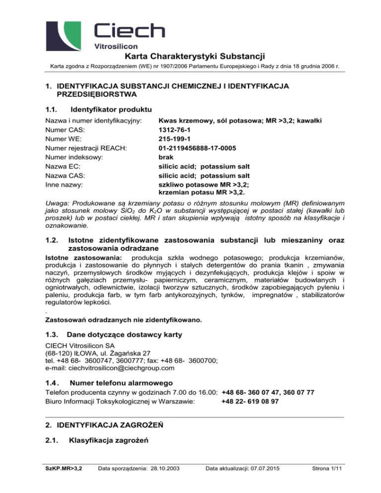 Karta Charakterystyki Substancji Karta zgodna z Rozporządzeniem (WE) nr 1907/2006 Parlamentu Europejskiego i Rady z dnia 18 grudnia 2006 r. 1. IDENTYFIKACJA SUBSTANCJI CHEMICZNEJ I IDENTYFIKACJA PRZEDSIĘBIORSTWA 1.1. Identyfikator produktu Nazwa i numer identyfikacyjny: Numer CAS: Numer WE: Numer rejestracji REACH: Numer indeksowy: Nazwa EC: Nazwa CAS: Inne nazwy: Kwas krzemowy, sól potasowa; MR >3,2; kawałki 1312-76-1 215-199-1 01-2119456888-17-0005 brak silicic acid; potassium salt silicic acid; potassium salt szkliwo potasowe MR >3,2; krzemian potasu MR >3,2. Uwaga: Produkowane są krzemiany potasu o różnym stosunku molowym (MR) definiowanym jako stosunek molowy SiO2 do K2O w substancji występującej w postaci stałej (kawałki lub proszek) lub w postaci ciekłej. MR i stan skupienia wpływają istotny sposób na klasyfikacje i oznakowanie. 1.2. Istotne zidentyfikowane zastosowania substancji lub mieszaniny oraz zastosowania odradzane Istotne zastosowania: produkcja szkła wodnego potasowego; produkcja krzemianów, produkcja i zastosowanie do płynnych i stałych detergentów do prania tkanin , zmywania naczyń, przemysłowych środków myjących i dezynfekujących, produkcja klejów i spoiw w różnych gałęziach przemysłu- papierniczym, ceramicznym, materiałów budowlanych i ogniotrwałych, odlewnictwie, izolacji tworzyw sztucznych, środków zapobiegających pyleniu i paleniu, produkcja farb, w tym farb antykorozyjnych, tynków, impregnatów , stabilizatorów regulatorów lepkości. . Zastosowań odradzanych nie zidentyfikowano. 1.3. Dane dotyczące dostawcy karty CIECH Vitrosilicon SA (68-120) IŁOWA, ul. Żagańska 27 tel. +48 68- 3600747, 3600777; fax: +48 68- 3600700; e-mail: [email protected] 1.4 . Numer telefonu alarmowego Telefon producenta czynny w godzinach 7.00 do 16.00: +48 68- 360 07 47, 360 07 77 Biuro Informacji Toksykologicznej w Warszawie: +48 22- 619 08 97 _________________________________________________________________________________________________________ 2. IDENTYFIKACJA ZAGROŻEŃ 2.1. Klasyfikacja zagrożeń SzKP.MR>3,2 Data sporządzenia: 28.10.2003 Data aktualizacji: 07.07.2015 Strona 1/11 Karta Charakterystyki Substancji Karta zgodna z Rozporządzeniem (WE) nr 1907/2006 Parlamentu Europejskiego i Rady z dnia 18 grudnia 2006 r. Klasyfikacja zgodna z rozporządzeniem (WE) 1272/2008 [CLP/GHS] Substancja nie sklasyfikowana 2.1.2 Klasyfikacja zgodna z dyrektywą DSD i rozporządzeniem MZ w sprawie kryteriów i sposobu klasyfikacji substancji chemicznych i ich mieszanin (Dz.U.12.1018 Substancja nie sklasyfikowana 2.1.1. 2.2. Elementy oznakowania 2.2.1. Oznakowane według z rozporządzeniem (WE) Nr 1272/2008 [CLP/GHS] Substancja nie wymaga oznakowania 2.2.2. Oznakowanie według Dyrektywy DSD i rozporządzenia MZ w sprawie oznakowania opakowań substancji niebezpiecznych i mieszanin niebezpiecznych oraz niektórych mieszanin (Dz.U.12.445) Substancja nie wymaga oznakowania 2.1. Inne zagrożenia Substancja nie spełnia kryteriów PBT lub vPvB świetle załącznika XIII rozporządzenia REACH. __________________________________________________________________________________________________________________ 3. SKŁAD / INFORMACJA O SKŁADNIKACH Nazwa chemiczna: Kwas krzemowy, sól potasowa o module MR >3,2 Zawartość czystej substancji: 99%ww (K2O+SiO2) Zwyczajowa nazwa własna: szkliwo potasowe o module >3,2 Nazwa EC: silicic acid, potassium salt; Nr WE: 215-199-1 Nazwa CAS: silicic acid, potassium salt; nr CAS: 1312-76-1 Nazwa IUPAC: potassium hydroxy(oxo)silanolate Wzór chemiczny: K2O x nSiO2 Opis substancji: Substancja nieorganiczna typu UVCB. Jest kompozycją oligomerów anionów krzemianowych SiO4 połączonych z kationami potasu. Budowa strukturalna substancji i jej właściwości zależą od stosunku molowego SiO2 do K2O zwanego modułem molowym MR. Opisywany produkt (dla stężenia 100% substancji K2O x nSiO2) o module molowym MR >3,2 zawiera: Moduł molowy (MR) Zawartość SiO2 Zawartość K2O > 67% < 33% > 3,2 Opis zanieczyszczeń: Występujące, w ilości poniżej 1%ww, zanieczyszczenia nie mają wpływu na klasyfikację substancji. Są to tlenki metali pochodzące z surowców (piasku kwarcowego) np. tlenki: wapnia, magnezu, glinu, tytanu, żelaza itp. oraz KCl i K2SO4. _________________________________________________________________________________________________________ 4. ŚRODKI PIERWSZEJ POMOCY 4.1. Opis środków pierwszej pomocy SzKP.MR>3,2 Data sporządzenia: 28.10.2003 Data aktualizacji: 07.07.2015 Strona 2/11 Karta Charakterystyki Substancji Karta zgodna z Rozporządzeniem (WE) nr 1907/2006 Parlamentu Europejskiego i Rady z dnia 18 grudnia 2006 r. Substancja nie jest niebezpieczna dla ludzi. Należy unikać kontaktu z nieosłoniętą skórą lub oczami. W przypadku kontaktu ze skórą: spłukać skórę pod strumieniem wody lub prysznicem. W przypadku dostania się substancji do oczu: usunąć mechanicznie. Ostrożnie płukać wodą przez co najmniej 10 minut. Wyjąć soczewki kontaktowe, jeżeli są i można je łatwo usunąć. Wezwać lekarza – okulistę. W przypadku połknięcia: wypłukać usta, nie wywoływać wymiotów. Po wdychaniu: w przypadku złego samopoczucia, wyprowadzić na świeże powietrze. 4.2. Najważniejsze ostre oraz opóźnione objawy oraz skutki narażenia Substancja stała, słabo rozpuszczalna w wodzie. Na powierzchni, wskutek kontaktu z CO2 z powietrza, może się wytwarzać warstwa rozpuszczalnego alkalicznego K2CO3. Kontakt ze skórą może powodować niegroźne podrażnienia. Przypadkowe wprowadzenie substancji do oka grozi jego podrażnieniem. Połknięcie może spowodować uszkodzenie śluzówki. 4.3. Wskazania dotyczące wszelkiej natychmiastowe pomocy lekarskiej i szczególnego postępowania z poszkodowanym W przypadku dostania się substancji do oczu i utrzymującego się podrażnienia lub zaczerwienienia oczu po przemyciu dużą ilością wody wezwać lekarza – okulistę. Każdorazowo, w przyp