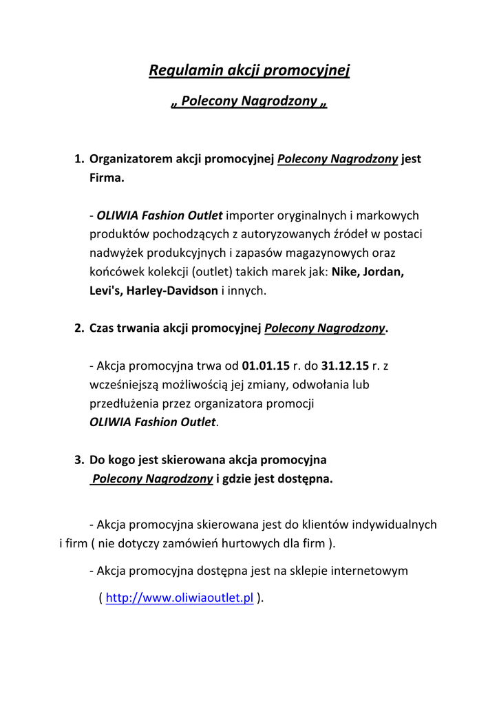 Regulamin akcji promocyjnej „ Polecony Nagrodzony „ 1. Organizatorem akcji promocyjnej Polecony Nagrodzony jest Firma. - OLIWIA Fashion Outlet importer oryginalnych i markowych produktów pochodzących z autoryzowanych źródeł w postaci nadwyżek produkcyjnych i zapasów magazynowych oraz końcówek kolekcji (outlet) takich marek jak: Nike, Jordan, Levi's, Harley-Davidson i innych. 2. Czas trwania akcji promocyjnej Polecony Nagrodzony. - Akcja promocyjna trwa od 01.01.15 r. do 31.12.15 r. z wcześniejszą możliwością jej zmiany, odwołania lub przedłużenia przez organizatora promocji OLIWIA Fashion Outlet. 3. Do kogo jest skierowana akcja promocyjna Polecony Nagrodzony i gdzie jest dostępna. - Akcja promocyjna skierowana jest do klientów indywidualnych i firm ( nie dotyczy zamówień hurtowych dla firm ). - Akcja promocyjna dostępna jest na sklepie internetowym ( http://www.oliwiaoutlet.pl ). 4. Zasady akcji promocyjnej Polecony Nagrodzony. - Klient polecający znajomą osobę poprzez stronę naszego sklepu internetowego ( http://www.oliwiaoutlet.pl ), otrzymuje 30 zł - punktów rabatowych ( 1 zł = 1 punkt ). Warunkiem otrzymania 30 zł - punktów rabatowych przez klienta polecającego jest również realizacja jednorazowego zamówienia na naszym sklepie www przez osobę poleconą na wartość powyżej 50 zł. - Czas realizacji zamówienia przez osobę poleconą nie może być dłuższy niż okres 90 dni od daty rejestracji własnego konta . - Osoba polecona podczas rejestracji własnego konta na sklepie www jest zobowiązana podać adres e-mail naszego klienta polecającego. - Osoba polecona dokonująca zakupu na sklepie www nie może posiadać tego samego adresu zamieszkania jak również adresu wysyłki w zamówieniu jak klient polecający, złożone zamówienie jak również płatność za zakupiony towar musi zostać dokonane na dane i przez osobę poleconą. - Otrzymane punkty rabatowe sumują się w naszym systemie rabatowym do czasu zakończenia akcji promocyjnej lub jej odwołania. 5. Realizacja zakupów za uzyskane punkty rabatowe w akcji promocyjnej Polecony Nagrodzony. - Klient mający na swoim koncie odpowiednią ilość punktów rabatowych ( min. 50 ), które uprawniają go do zakupu wybranego dostępnego produktu na naszym sklepie internetowym. Wartość przesyłki nie może zostać zmniejszona za pomocą płatności punktami rabatowymi. Przelicznik: 1 punkt = 1 zł 6. Zasady łączenia ofert i akcji promocyjnych. - Akcja promocyjna Polecony Nagrodzony łączy się z akcją promocyjną Program Lojalnościowy dla stałych klientów, natomiast nie łączy się z innymi ofertami lub akcjami promocyjnymi.