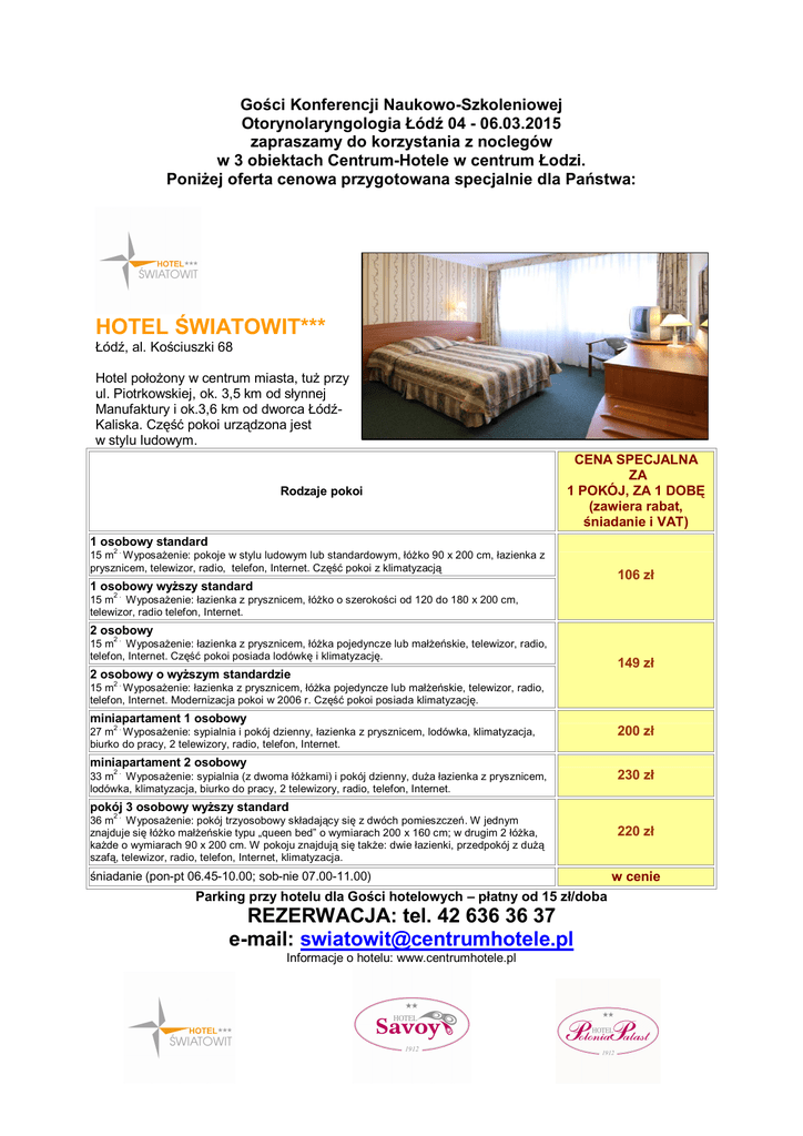 Gości Konferencji Naukowo-Szkoleniowej Otorynolaryngologia Łódź 04 - 06.03.2015 zapraszamy do korzystania z noclegów w 3 obiektach Centrum-Hotele w centrum Łodzi. Poniżej oferta cenowa przygotowana specjalnie dla Państwa: HOTEL ŚWIATOWIT*** Łódź, al. Kościuszki 68 Hotel położony w centrum miasta, tuż przy ul. Piotrkowskiej, ok. 3,5 km od słynnej Manufaktury i ok.3,6 km od dworca ŁódźKaliska. Część pokoi urządzona jest w stylu ludowym. Rodzaje pokoi CENA SPECJALNA ZA 1 POKÓJ, ZA 1 DOBĘ (zawiera rabat, śniadanie i VAT) 1 osobowy standard 2. 15 m Wyposażenie: pokoje w stylu ludowym lub standardowym, łóżko 90 x 200 cm, łazienka z prysznicem, telewizor, radio, telefon, Internet. Część pokoi z klimatyzacją 1 osobowy wyższy standard 106 zł 2. 15 m Wyposażenie: łazienka z prysznicem, łóżko o szerokości od 120 do 180 x 200 cm, telewizor, radio telefon, Internet. 2 osobowy 2. 15 m Wyposażenie: łazienka z prysznicem, łóżka pojedyncze lub małżeńskie, telewizor, radio, telefon, Internet. Część pokoi posiada lodówkę i klimatyzację. 2 osobowy o wyższym standardzie 149 zł 2. 15 m Wyposażenie: łazienka z prysznicem, łóżka pojedyncze lub małżeńskie, telewizor, radio, telefon, Internet. Modernizacja pokoi w 2006 r. Część pokoi posiada klimatyzację. miniapartament 1 osobowy 2. 27 m Wyposażenie: sypialnia i pokój dzienny, łazienka z prysznicem, lodówka, klimatyzacja, biurko do pracy, 2 telewizory, radio, telefon, Internet. 200 zł miniapartament 2 osobowy 2. 33 m Wyposażenie: sypialnia (z dwoma łóżkami) i pokój dzienny, duża łazienka z prysznicem, lodówka, klimatyzacja, biurko do pracy, 2 telewizory, radio, telefon, Internet. 230 zł pokój 3 osobowy wyższy standard 2. 36 m Wyposażenie: pokój trzyosobowy składający się z dwóch pomieszczeń. W jednym znajduje się łóżko małżeńskie typu „queen bed” o wymiarach 200 x 160 cm; w drugim 2 łóżka, każde o wymiarach 90 x 200 cm. W pokoju znajdują się także: dwie łazienki, przedpokój z dużą szafą, telewizor, radio, telefon, Internet, klimatyzacja. śniadanie (pon-pt 06.45-10.00; sob-nie 07.00-11.00) Parking przy hotelu dla Gości hotelowych – płatny od 15 zł/doba REZERWACJA: tel. 42 636 36 37 e-mail: [email protected] Informacje o hotelu: www.centrumhotele.pl 220 zł w cenie HOTEL SAVOY** Łódź, ul. Traugutta 6 Hotel w stylu retro, posiada stylową restaurację i kawiarnię. Goście wjeżdżają na piętra zabytkową windą z obsługą. Hotel położony jest doskonale, tuż przy sławnej ul. Piotrkowskiej będącej wizytówką Łodzi. W pobliżu znajdują się: kina, puby i restauracje. Rodzaje pokoi CENA SPECJALNA ZA 1 POKÓJ, ZA 1 DOBĘ (zawiera rabat, śniadanie i VAT) 1 osobowy 2- Od 12-16 m , położenie - od dziedzińca. Wyposażenie: łazienka z prysznicem, TV, radio, telefon 1 osobowy wyższy standard 99 zł 2 18m , położenie – od dziedzińca. Wyposażenie: łazienka z prysznicem, telewizor, radio, telefon, Internet. Możliwość dostawki. 1 osobowy w stylu retro 2 18 m , położenie - od dziedzińca. Stylowe wyposażenie: meble w stylu retro, sekretarzyk, łazienka z prysznicem i biczami wodnymi, telewizor, radio, suszarka do włosów, telefon, Internet. 165 zł 2 osobowy 2 20 m , położenie - od dziedzińca lub od frontu. Pokoje składają się z jednego pomieszczenia lub sypialni i pokoju dziennego. Wyposażenie: łazienka z prysznicem, łóżka pojedyncze lub małżeńskie, telewizor, radio, telefon, Internet. 141 zł 3 osobowy 2 20 m , położenie - od dziedzińca lub od frontu. Pokoje składają się z jednego pomieszczenia lub sypialni i pokoju dziennego. Wyposażenie: łazienka z prysznicem, łóżka pojedyncze lub małżeńskie, telewizor, radio, telefon, Internet. 210 zł mini-apartament 2 osobowy 2 36 m , położenie – od frontu. Wyposażenie: sypialnia i pokój dzienny, duża łazienka z wanną, jacuzzi oraz prysznicem i biczami wodnymi, dodatkowe wc, suszarka do włosów, klimatyzacja, chłodziarka, telewizory, radio, telefon, Internet. Śniadanie (07.00-10.00) 230 zł w cenie Parking strzeżony około 200m od hotelu – od 25 zł/za dobę w zależności od rodzaju pojazdu; REZERWACJA: tel. 42 632 93 60 e-mail: [email protected] Informacje o hotelu: www.centrumhotele.pl HOTEL POLONIA PALAST** Łódź, ul. Narutowicza 38 Hotel Polonia Palast** to 100 letni obiekt „z duszą”, wpisany do Rejestru Zabytków. Położony jest około 400 m od ul. Piotrkowskiej (głównej arterii handlowo-rozrywkowej miasta) oraz ok. 1 km od słynnej łódzkiej Manufaktury. Rodzaje pokoi 1 osobowy CENA SPECJALNA ZA 1 POKÓJ, ZA 1 DOBĘ (zawiera rabat, śniadanie i VAT) 2 Powierzchnia 16 m . . Wyposażenie: łazienka z wanną lub prysznicem, łóżko 100x200 cm, telewizor, radio, telefon. Położenie: od ulicy. 2 osobowy 2 Powierzchnia 16 m . Wyposażenie: łazienka z wanną lub prysznicem, łóżka pojedyncze lub małżeńskie, telewizor, radio, telefon. Położenie: od ulicy. Możliwość dostawki. 3 osobowy 99 zł 141 zł 2 Powierzchnia 16 m . Wyposażenie: łazienka z wanną lub prysznicem, łóżka pojedyncze lub małżeńskie, telewizor, radio, telefon. Położenie: od ulicy. Śniadanie (07.00-10.00) 210 zł w cenie Parking strzeżony około 200m od hotelu – od 30 zł/za dobę w zależności od rodzaju pojazdu; REZERWACJA: tel. 42 632 87 73 e-mail: [email protected] Informacje o hotelu: www.centrumhotele.pl WARUNKI REZERWACJI, PŁATNOŚCI I ANULACJI DLA GOŚCI KONFERENCJI NAUKOWO-SZKOLENIOWEJ OTORYNOLARYNGOLOGIA w terminie: 04- 06.03.2015 1. Rezerwacja może być dokonana telefonicznie lub mailowo. Aby skorzystać z powyższych cen z rabatem konieczne jest podanie hasła: „ORL 2015” oraz dokonanie gwarancji rezerwacji. 2. Obowiązkowa jest gwarancja w wysokości minimum 50% wartości rezerwacji poprzez: preautoryzację na karcie płatniczej/kredytowej lub przelew na konto Centrum-Hotele. Druk preautoryzacji w języku polskim i angiel