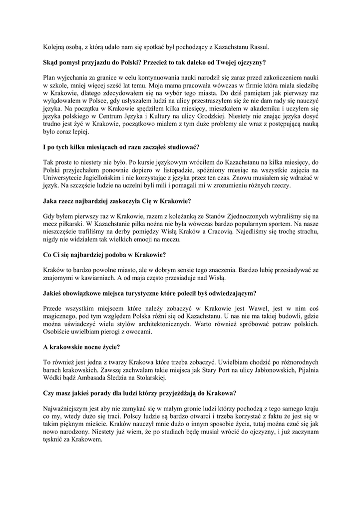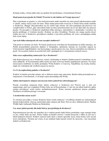 Kolejną osobą, z którą udało nam się spotkać był pochodzący z Kazachstanu Rassul. Skąd pomysł przyjazdu do Polski? Przecież to tak daleko od Twojej ojczyzny? Plan wyjechania za granice w celu kontynuowania nauki narodził się zaraz przed zakończeniem nauki w szkole, mniej więcej sześć lat temu. Moja mama pracowała wówczas w firmie która miała siedzibę w Krakowie, dlatego zdecydowałem się na wybór tego miasta. Do dziś pamiętam jak pierwszy raz wylądowałem w Polsce, gdy usłyszałem ludzi na ulicy przestraszyłem się że nie dam rady się nauczyć języka. Na początku w Krakowie spędziłem kilka miesięcy, mieszkałem w akademiku i uczyłem się języka polskiego w Centrum Języka i Kultury na ulicy Grodzkiej. Niestety nie znając języka dosyć trudno jest żyć w Krakowie, początkowo miałem z tym duże problemy ale wraz z postępującą nauką było coraz lepiej. I po tych kilku miesiącach od razu zacząłeś studiować? Tak proste to niestety nie było. Po kursie językowym wróciłem do Kazachstanu na kilka miesięcy, do Polski przyjechałem ponownie dopiero w listopadzie, spóźniony miesiąc na wszystkie zajęcia na Uniwersytecie Jagiellońskim i nie korzystając z języka przez ten czas. Znowu musiałem się wdrażać w język. Na szczęście ludzie na uczelni byli mili i pomagali mi w zrozumieniu różnych rzeczy. Jaka rzecz najbardziej zaskoczyła Cię w Krakowie? Gdy byłem pierwszy raz w Krakowie, razem z koleżanką ze Stanów Zjednoczonych wybraliśmy się na mecz piłkarski. W Kazachstanie piłka nożna nie była wówczas bardzo popularnym sportem. Na nasze nieszczęście trafiliśmy na derby pomiędzy Wisłą Kraków a Cracovią. Najedliśmy się trochę strachu, nigdy nie widziałem tak wielkich emocji na meczu. Co Ci się najbardziej podoba w Krakowie? Kraków to bardzo powolne miasto, ale w dobrym sensie tego znaczenia. Bardzo lubię przesiadywać ze znajomymi w kawiarniach. A od maja często przesiaduje nad Wisłą. Jakieś obowiązkowe miejsca turystyczne które polecił byś odwiedzającym? Przede wszystkim miejscem które należy zobaczyć w Krakowie jest Wawel, jest w nim coś magicznego, pod tym względem Polska różni się od Kazachstanu. U nas nie ma takiej budowli, gdzie można uświadczyć wielu stylów architektonicznych. Warto również spróbować potraw polskich. Osobiście uwielbiam pierogi z owocami. A krakowskie nocne życie? To również jest jedna z twarzy Krakowa które trzeba zobaczyć. Uwielbiam chodzić po różnorodnych barach krakowskich. Zawszę zachwalam takie miejsca jak Stary Port na ulicy Jabłonowskich, Pijalnia Wódki bądź Ambasada Śledzia na Stolarskiej. Czy masz jakieś porady dla ludzi którzy przyjeżdżają do Krakowa? Najważniejszym jest aby nie zamykać się w małym gronie ludzi którzy pochodzą z tego samego kraju co my, wtedy dużo się traci. Polscy ludzie są bardzo otwarci i trzeba korzystać z faktu że jest się w takim pięknym mieście. Kraków nauczył mnie dużo o innym sposobie życia, tutaj można czuć się jak nowo narodzony. Niestety już wiem, że po studiach będę musiał wrócić do ojczyzny, i już zaczynam tęsknić za Krakowem.