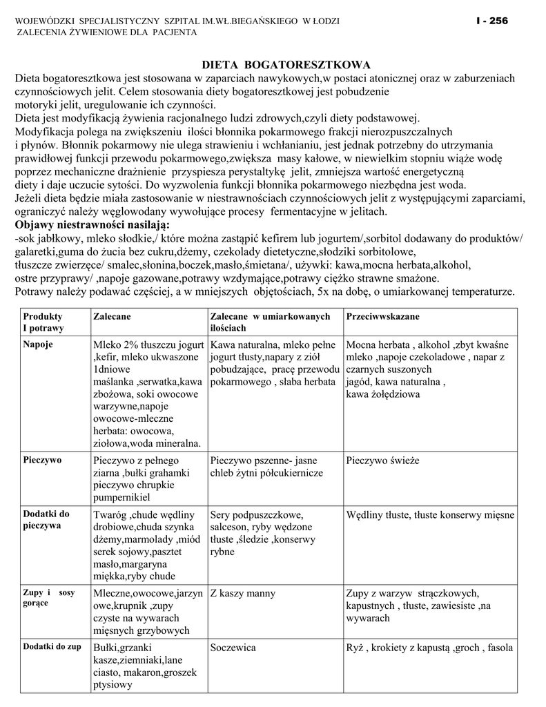 I - 256 WOJEWÓDZKI SPECJALISTYCZNY SZPITAL IM.WŁ.BIEGAŃSKIEGO W ŁODZI ZALECENIA ŻYWIENIOWE DLA PACJENTA DIETA BOGATORESZTKOWA Dieta bogatoresztkowa jest stosowana w zaparciach nawykowych,w postaci atonicznej oraz w zaburzeniach czynnościowych jelit. Celem stosowania diety bogatoresztkowej jest pobudzenie motoryki jelit, uregulowanie ich czynności. Dieta jest modyfikacją żywienia racjonalnego ludzi zdrowych,czyli diety podstawowej. Modyfikacja polega na zwiększeniu ilości błonnika pokarmowego frakcji nierozpuszczalnych i płynów. Błonnik pokarmowy nie ulega strawieniu i wchłanianiu, jest jednak potrzebny do utrzymania prawidłowej funkcji przewodu pokarmowego,zwiększa masy kałowe, w niewielkim stopniu wiąże wodę poprzez mechaniczne drażnienie przyspiesza perystaltykę jelit, zmniejsza wartość energetyczną diety i daje uczucie sytości. Do wyzwolenia funkcji błonnika pokarmowego niezbędna jest woda. Jeżeli dieta będzie miała zastosowanie w niestrawnościach czynnościowych jelit z występującymi zaparciami, ograniczyć należy węglowodany wywołujące procesy fermentacyjne w jelitach. Objawy niestrawności nasilają: -sok jabłkowy, mleko słodkie,/ które można zastąpić kefirem lub jogurtem/,sorbitol dodawany do produktów/ galaretki,guma do żucia bez cukru,dżemy, czekolady dietetyczne,słodziki sorbitolowe, tłuszcze zwierzęce/ smalec,słonina,boczek,masło,śmietana/, używki: kawa,mocna herbata,alkohol, ostre przyprawy/ ,napoje gazowane,potrawy wzdymające,potrawy ciężko strawne smażone. Potrawy należy podawać częściej, a w mniejszych objętościach, 5x na dobę, o umiarkowanej temperaturze. Produkty I potrawy Zalecane Zalecane w umiarkowanych ilościach Przeciwwskazane Napoje Mleko 2% tłuszczu jogurt ,kefir, mleko ukwaszone 1dniowe maślanka ,serwatka,kawa zbożowa, soki owocowe warzywne,napoje owocowe-mleczne herbata: owocowa, ziołowa,woda mineralna. Kawa naturalna, mleko pełne jogurt tłusty,napary z ziół pobudzające, pracę przewodu pokarmowego , słaba herbata Mocna herbata , alkohol ,zbyt kwaśne mleko ,napoje czekoladowe , napar z czarnych suszonych jagód, kawa naturalna , kawa żołędziowa Pieczywo Pieczywo z pełnego ziarna ,bułki grahamki pieczywo chrupkie pumpernikiel Pieczywo pszenne- jasne chleb żytni półcukiernicze Pieczywo świeże Dodatki do pieczywa Twaróg ,chude wędliny drobiowe,chuda szynka dżemy,marmolady ,miód serek sojowy,pasztet masło,margaryna miękka,ryby chude Sery podpuszczkowe, salceson, ryby wędzone tłuste ,śledzie ,konserwy rybne Wędliny tłuste, tłuste konserwy mięsne Zupy i gorące Mleczne,owocowe,jarzyn Z kaszy manny owe,krupnik ,zupy czyste na wywarach mięsnych grzybowych Zupy z warzyw strączkowych, kapustnych , tłuste, zawiesiste ,na wywarach Bułki,grzanki kasze,ziemniaki,lane ciasto, makaron,groszek ptysiowy Ryż , krokiety z kapustą ,groch , fasola sosy Dodatki do zup Soczewica Mięso,Podroby Chude gatunki mięs : ,Drób Ryby cielęcina,konina,schab, królik,indyk ,kurczak, Ryby: sandacz,szczupak ,karp, lin,flądra,dorsz,pstrąg, morszczuk,mintaj, makrela,sola,karmazyn tuńczyk,sardynka, -pulpety ,potrawki Średnio tłuste gatunki mięs,wieprzowina wołowina,dziczyzna, wątroba,ozorki,nerki, mózg, flaki gęsi ,kaczki , Ryby: śledzie ,halibut niebieski , łosoś ,potrawy smażone z mięsem drobiu i ryb Bardzo tłuste gatunki mięs : wieprzowina baranina, mięsa smażone w dużych ilościach Racuchy ,bliny ,kluski kładzione ,placki ziemniaczane Potrawy z fasoli grochu ,z ryżu , z dodatkiem mąki ziemniaczanej warzyw kapustnych Potrawy Półmięsne Bezmięsne Budynie z mięsa i kasz, warzyw ,makaron z mięsem , leniwe pierogi pierogi z mięsem ,z owocami ,papryka faszerowana ,kluski ziemniaczane,naleśnik z mięsem , Tłuszcze Oleje zawierające wielonienasycone kwasy słonecznikowy, sojowy kukurydziany Oleje zawierające wielonienasycone kwasy rzepakowy,oliwa oliwek, mało, margaryny miękkie Warzywa Warzywa świeże mrożone,buraki papryka,pomidory, marchew,dynia,szpinak, pietruszka,sałata,seler rabarbar,warzywa w postaci soków Ziemniaki Gotowane ,pieczone Owoce Świeże,suszone konserwowane ,orzechy włoskie ,laskowe,owoce w postaci surówek soków,gotowane Desery Kompoty, galaretki Ciasta z dużą ilością żółtek z owocowe, mleczne,musy masami przeciery,sałatki owocowe Kisiele, czekolada, kakao, batony,ciasta z dodatkiem ,kakao Przyprawy Kwasek cytrynowy pietruszka zielona,sól jarzynka ,kminek,koper majeranek ,gałka muszkatowa, curry Ocet Łój,smalec,słonina boczek ,margaryny twarde ,olej palmowy Kalafior, kiszona kapusta,warzywa cebulowe,cebula, czosnek pory . Fasola szparagowa groszek zielony ,ogórki kiszone. Suche nasiona roślin strączkowych ,pozostałe warzywa kapustne,ogórki świeże . Smażone,frytki, placki. Gruszki,orzechy solone,orzechy kokosowe orzechy archaidowe Ostra papryka ,pieprz, chili , musztarda (w dyspepsjach jelit zabroniona ) Czereśnie, , Źródło: ,Podstawy naukowe żywienia w szpitalach'' -wydanie IŻiŻ rok 2001, ,,Praktyczny podręcznik dietetyki''- wydanie IŻiŻ rok 2010, ,,Zasady prawidłowego żywienia chorych w szpitalach '' -wydanie IŻiŻ rok 2011 Opracował Zespół do Spraw Żywienia WSSz.im.Wł.Biegańskiego Kwiecień 2013