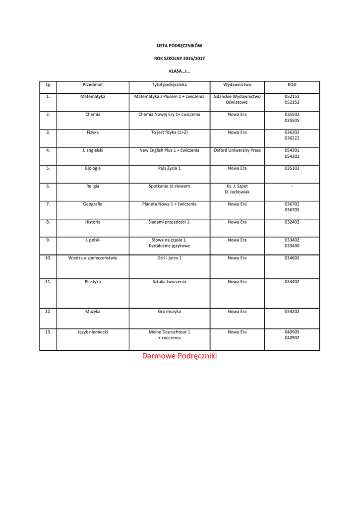 LISTA PODRĘCZNIKÓW ROK SZKOLNY 2016/2017 KLASA…I… Lp Przedmiot Tytuł podręcznika Wydawnictwo KOD 1. Matematyka Matematyka z Plusem 1 + ćwiczenia Gdańskie Wydawnictwo Oświatowe 052151 052152 2. Chemia Chemia Nowej Ery 1+ ćwiczenia Nowa Era 035502 035505 3. Fizyka To jest fizyka (1+2) Nowa Era 036202 036222 4. J. angielski New English Plus 1 + ćwiczenia Oxford Uniwersity Press 054301 054302 5. Biologia Puls Życia 1 Nowa Era 035102 6. Religia Spotkanie ze słowem Ks. J. Szpet D. Jackowiak - 7. Geografia Planeta Nowa 1 + ćwiczenia Nowa Era 036702 036705 8. Historia Śladami przeszłości 1 Nowa Era 032402 9. J. polski Słowa na czasie 1 Kształcenie językowe Nowa Era 033402 033490 10. Wiedza o społeczeństwie Dziś i jutro 1 Nowa Era 034602 11. Plastyka Sztuka tworzenia Nowa Era 034402 12. Muzyka Gra muzyka Nowa Era 034202 13. Język niemiecki Meine Deutschtour 1 + ćwiczenia Nowa Era 040905 040902 Darmowe Podręczniki