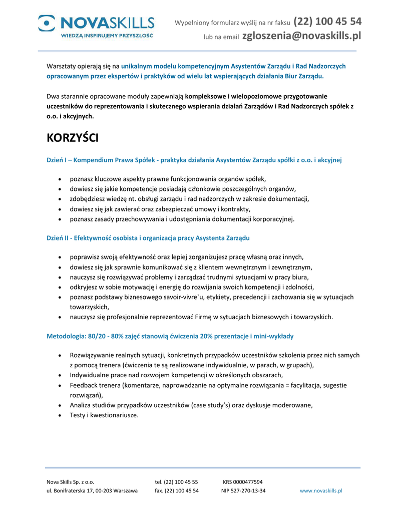 (22) 100 45 54 lub na email [email protected] Wypełniony formularz wyślij na nr faksu Warsztaty opierają się na unikalnym modelu kompetencyjnym Asystentów Zarządu i Rad Nadzorczych opracowanym przez ekspertów i praktyków od wielu lat wspierających działania Biur Zarządu. Dwa starannie opracowane moduły zapewniają kompleksowe i wielopoziomowe przygotowanie uczestników do reprezentowania i skutecznego wspierania działań Zarządów i Rad Nadzorczych spółek z o.o. i akcyjnych. KORZYŚCI Dzień I – Kompendium Prawa Spółek - praktyka działania Asystentów Zarządu spółki z o.o. i akcyjnej poznasz kluczowe aspekty prawne funkcjonowania organów spółek, dowiesz się jakie kompetencje posiadają członkowie poszczególnych organów, zdobędziesz wiedzę nt. obsługi zarządu i rad nadzorczych w zakresie dokumentacji, dowiesz się jak zawierać oraz zabezpieczać umowy i kontrakty, poznasz zasady przechowywania i udostępniania dokumentacji korporacyjnej. Dzień II - Efektywność osobista i organizacja pracy Asystenta Zarządu poprawisz swoją efektywność oraz lepiej zorganizujesz pracę własną oraz innych, dowiesz się jak sprawnie komunikować się z klientem wewnętrznym i zewnętrznym, nauczysz się rozwiązywać problemy i zarządzać trudnymi sytuacjami w pracy biura, odkryjesz w sobie motywację i energię do rozwijania swoich kompetencji i zdolności, poznasz podstawy biznesowego savoir-vivre`u, etykiety, precedencji i zachowania się w sytuacjach towarzyskich, nauczysz się profesjonalnie reprezentować Firmę w sytuacjach biznesowych i towarzyskich. Metodologia: 80/20 - 80% zajęć stanowią ćwiczenia 20% prezentacje i mini-wykłady Rozwiązywanie realnych sytuacji, konkretnych przypadków uczestników szkolenia przez nich samych z pomocą trenera (ćwiczenia te są realizowane indywidualnie, w parach, w grupach), Indywidualne prace nad rozwojem kompetencji w określonych obszarach, Feedback trenera (komentarze, naprowadzanie na optymalne rozwiązania = facylitacja, sugestie rozwiązań), Analiza studiów przypadków uczestników (case study’s) oraz dyskusje moderowane, Testy i kwestionariusze. Nova Skills Sp. z o.o. ul. Bonifraterska 17, 00-203 Warszawa tel. (22) 100 45 55 fax. (22) 100 45 54 KRS 0000477594 NIP 527-270-13-34 www.novaskills.pl (22) 100 45 54 lub na email [email protected] Wypełniony formularz wyślij na nr faksu PROGRAM Dzień I - Kompendium Prawa Spółek - praktyka działania Asystentów Zarządu spółki z o.o. i akcyjnej Mec. Agnieszka Lisak Problematyka obrotu gospodarczego i zawieranych w nim umów Formy prowadzenia działalności gospodarczej w kraju, Miejsce rejestracji przedsiębiorców, Dokumenty zaświadczające o wiarygodności przedsiębiorców (odpis z Krajowego Rejestru Sądowego, zaświadczenie z CEIDG), Zasady zawierania umów w firmie i sporządzania aneksów, Osoby uprawnione do zawierania umów w firmie: działanie przez wspólników, członków zarządu, pełnomocników, prokurentów, Co to jest prokura, Formy czynności prawnych (pisemna, akt notarialny, notarialne poświadczenie podpisu…), Zasady uwierzytelniania dokumentów. Rodzaje dokumentacji w firmie Umowa z kontrahentami, Dokumentacja korporacyjna (umowa spółki, statut, akt założycielski, uchwały, protokoły, regulaminy zarządu i rady nadzorczej), Regulaminy w firmie i ich rodzaje. Szczegółowe zagadnienia z zakresu prawa spółek Rodzaje spółek, Kapitał zakładowy, pojęcie wkładu, udziału, aportu, Organy spółek, czy każda spółka musi mieć organy. Zarząd Rola zarządu w spółce, zadania i kompetencje, Obowiązki członków zarządu w związku z zakończeniem roku obrotowego, Sporządzenie sprawozdania zarządu z działalności spółki, Co powinno zawierać sprawozdanie zarządu? (podstawowe błędy popełniane przy pisaniu sprawozdań), Opinia biegłego rewidenta, kiedy jest sporządzana oraz jej znaczenie, Sprawozdanie finansowe i jego elementy. Nova Skills Sp. z o.o. ul. Bonifraterska 17, 00-203 Warszawa tel. (22) 100 45 55 fax. (22) 100 45 54 KRS 0000477594 NIP 527-270-13-34 www.novaskills.pl (22) 100 45 54 lub na email [email protected] Wypełniony formularz wyślij na nr faksu Jakie dokumenty są składane obligatoryjnie przez spółkę do Krajowego Rejestru Sądowego w związku z zakończeniem roku obrotowego? Rada Nadzorcza Rola Rady Nadzorczej w spółce, Zadania i kompetencje. Zgromadzenie wspólników Rola Zgromadzenia Wspólników w spółce, Zadania i kompetencje. Dzień II - Efektywność osobista i organizacja pracy Asystenta Zarządu Cyprian Jędrkowiak Standardy komunikacji z Klientem wewnętrznym i zewnętrznym Diagnoza umiejętności komunikacyjnych, Zakłócenia w komunikacji, Jak mówić, aby ludzie czuli się rozumiani, a nie ignorowani, Na czym polega język świata rozmówcy, Dopasowanie do rozmówcy – zastosowanie indywidualnych stylów komunikacyjnych – diagnoza, Jak przekazać swoje stanowisko, by było ono rozumiane, doskonalenie umiejętności w sytuacjach ćwiczeniowych, Aranżacja trudnych sytuacji oraz informacja zwrotna i powtórzenia z zastosowaniem nowych możliwości, Rola dystansu i angażowania się w komunikacji, Zbieranie informacji o potrzebach działów w firmie, Uzyskanie informacji od przełożonych. Efektywność i organizacja czasu pracy Asystenta Zarządu Diagnoza własnej struktury czasu, Jaki wpływ ma Twoja struktura czasu na organizowanie działań i zadań, Jak postrzegasz czas – test postrzegania wg Zimbardo – diagnoza, Jakie są Twoje kluczowe obszary działania, W jaki sposób wartościujesz czas, Nova Skills Sp. z o.o. ul. Bonifraterska 17, 00-203 Warszawa tel. (22) 100 45 55 fax. (22) 100 45 54 KRS 0000477594 NIP 527-270-13-34 www.novaskills.pl (22) 100 45 54 lub na email [email protected] Wypełniony formularz wyślij na nr faksu Postawa i rola Asystenta Zarządu, samoświadomość, postawa, zachowania Model SMART – zarządzanie celami, Zarządzanie trudnymi sytuacjam