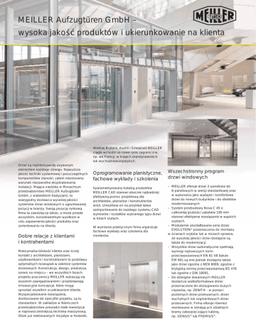 MEILLER Aufzugtüren GmbH – wysoka jakość produktów i ukierunkowanie na klienta Wielkiej Brytanii, Austrii i Szwajcarii MEILLER ciągle wchodzi na nowe rynki zagraniczne, np. we Francji, w krajach skandynawskich lub wschodnioeuropejskich. Drzwi są najintensywniej używanym elementem każdego dźwigu. Najwyższa jakość techniki systemowej i poszczególnych komponentów stanowi, zatem nieodzowny warunek niezawodne eksploatowania instalacji. Mające siedzibę w Monachium przedsiębiorstwo MEILLER Aufzugtüren GmbH, z wieloletnimi tradycjami, to wiarygodny dostawca wysokiej jakości systemów drzwi windowych o ugruntowanej pozycji w branży. Swoją pozycję rynkową firma ta zawdzięcza także, a może przede wszystkim, konsekwentnym wysiłkom w celu zapewnienia jakości produktu oraz zorientowaniu na klienta. Dobre relacje z klientami i kontrahentami Maksymalna bliskość klienta oraz ścisły kontakt z architektami, planistami, użytkownikami i konstruktorami to podstawy optymalnych rozwiązań w zakresie systemów drzwiowych. Konstrukcja, design, produkcja, serwis na miejscu – we wszystkich fazach projektu pracownicy MEILLER wykazują się wysokim zaangażowaniem i przedstawiają innowacyjne koncepcje, które mogą sprostać wszelkim oczekiwaniom klienta. Wyspecjalizowane rozwiązania, dostosowane do specyfiki projektu, są tu standardem. W zakładzie w Niemczech przedsiębiorstwo prowadzi stałe inwestycje w najnowocześniejszą technikę maszynową. Obok już realizowanych inicjatyw w Holandii, Oprogramowanie planistyczne, fachowe wykłady i szkolenia Sparametryzowany katalog produktów MEILLER CAD stanowi obecnie najbardziej efektywną pomoc projektową dla architektów, planistów i konstruktorów wind. Umożliwia on na przykład łatwe zaimportowanie do każdego systemu CAD wymiarów i kształtów wybranego typu drzwi w trzech rzutach. W wymiarze praktycznym firma organizuje fachowe wykłady oraz szkolenia dla monterów. Wszechstronny program drzwi windowych – MEILLER oferuje drzwi 2-panelowe do 6-panelowych w wersji standardowej oraz w wykonaniu jako wydajne i komfortowe drzwi do nowych budynków i do obiektów modernizowanych – System przebudowy Nova C 45 o całkowitej grubości zaledwie 190 mm stanowi efektywne rozwiązanie w wąskich szybach. – Modularnie ukształtowana seria drzwi EVOLUTION® przeznaczona do montażu w ścianach szybów lub w niszach sprawia, że wysokiej jakości drzwi dostępne są także do modernizacji. – Wszystkie drzwi automatyczne spełniają wymogi najnowszych norm przeciwpożarowych EN 81-58 (także EW 60); są one jednak dostępne także jako drzwi zgodne z NEN 6069, zgodne z brytyjską normą przeciwpożarową BS 476 lub zgodne z DIN 18091. – Do dźwigów towarowych MEILLER dostarcza wielkoformatowe drzwi przeznaczone do obsługiwania dużych ciężarów, np. ZENIT® - w postaci poziomych drzwi przesuwnych, drzwi wychylnych lub segmentowych drzwi przesuwnych. Firma oferuje również montowane w istniejących obiektach bramy zabezpieczające kabinę, np. GENIUS® lub PREMIUS®. wymieniane na nowe drzwi kabinowe MEILLER, na których stosuje się krzywkę odpowiednią do danego typu drzwi szybowych. Taki system umożliwia zastosowanie w połączeniu z różnymi drzwiami szybowymi firm Schindler, Liftcomp/Sematic, OTIS i Thyssen, a na dodatek jest on na bieżąco rozszerzany. MEILLER – specjalista od szkła skrzydła w wykonaniu bez ram, z mocowaniami punktowymi oraz wyfrezowanym zabezpieczeniem krawędzi zamykania są produkowane przy zastosowaniu różnego rodzaju szkła. Wytrawianie, piaskowanie, użycie folii lubsitodruku oraz zintegrowane w szkle źródła światła umożliwiają osiągnięcie rozmaitych efektów kreatywnego kształtowania drzwi szybowych i kabinowych. Efektywne koncepcje modernizacyjne Przy modernizacji przestarzałych technicznie dźwigów z automatycznymi drzwiami szybowymi i windowymi odnowienie wszystkich drzwi windy okazuje się zwykle zbyt kosztowne. Firma MEILLER oferuje w tym zakresie profesjonalną koncepcję modernizacji, która dzięki długiej dostępności dźwigu pozwala zarządcy zaoszczędzić koszty, a tym samym przynosi długotrwałe korzyści. Zamiast wymiany drzwi szybowych, które są zintegrowane w budynku, a ich wymiana wymaga często dużych nakładów, wymieniamy tylko drzwi kabinowe. Stare drzwi kabinowe są w całości Odporne na wandalizm drzwi kabinowe według EN 81-71 W przypadku obiektów publicznych windy są narażone na wandalizm w szczególny sposób. Z tego względu konstruowanie bezpiecznych systemów dźwigowych coraz bardziej zyskuje na znaczeniu – i to nie tylko od chwili wdrożenia europejskiej normy przeciw wandalom – EN 81-71. Wieloletni dostawca drzwi do wind do wielu europejskich linii kolejowych oraz systemów komunikacji dalekobieżnej – firma MEILLER – dysponuje ogromnym doświadczeniem w zakresie konstruowania odpornych na wandalizm systemów drzwiowych. Obramowane, szklane drzwi w wersji zabezpieczonej przed wandalizmem znajdują zastosowanie między innymi w liniach kolejowych Randstad Rail, zwłaszcza w dźwigach bez maszynowni zewnętrznych. Odporne na wandalizm drzwi szybowe są wykonywane ze stali szlachetnej (AlSi 316), a w bocznych ościeżnicach mają miejsce przeznaczone na sterownik dźwigu, falownik oraz inne oprzyrządowanie techniczne. Firma MEILLER słusznie uznawana jest za specjalistę od eleganckich portali o wysokiej estetyce. Szklane skrzydła drzwi, obramowania ze wszystkich stron lub Dodatkowe informacje znajdziecie Państwo na stronie internetowej www.meiller-aufzugtueren.de. MEILLER Aufzugtüren GmbH · Untermenzinger Straße 1 · 80997 München Tel. +49 89 / 14 87 - 0 · Fax +49 89 / 14 87 - 15 66 · [email protected] www.meiller-aufzugtueren.de Numer druku: 1191-pl-771-1002. Zastrzega się możliwość wprowadzania zmian technicznych. – Jako jedyny niemiecki producent MEILLER oferuje drzwi antywybuchowe zgodnie z wymogami dyrek