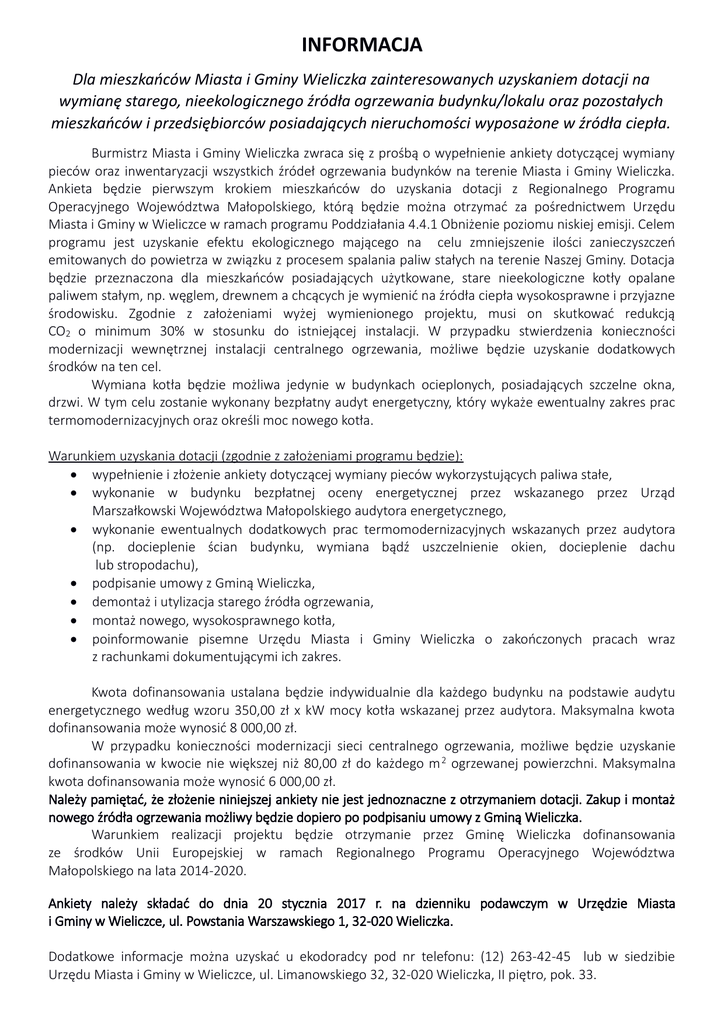 INFORMACJA Dla mieszkańców Miasta i Gminy Wieliczka zainteresowanych uzyskaniem dotacji na wymianę starego, nieekologicznego źródła ogrzewania budynku/lokalu oraz pozostałych mieszkańców i przedsiębiorców posiadających nieruchomości wyposażone w źródła ciepła. Burmistrz Miasta i Gminy Wieliczka zwraca się z prośbą o wypełnienie ankiety dotyczącej wymiany pieców oraz inwentaryzacji wszystkich źródeł ogrzewania budynków na terenie Miasta i Gminy Wieliczka. Ankieta będzie pierwszym krokiem mieszkańców do uzyskania dotacji z Regionalnego Programu Operacyjnego Województwa Małopolskiego, którą będzie można otrzymać za pośrednictwem Urzędu Miasta i Gminy w Wieliczce w ramach programu Poddziałania 4.4.1 Obniżenie poziomu niskiej emisji. Celem programu jest uzyskanie efektu ekologicznego mającego na celu zmniejszenie ilości zanieczyszczeń emitowanych do powietrza w związku z procesem spalania paliw stałych na terenie Naszej Gminy. Dotacja będzie przeznaczona dla mieszkańców posiadających użytkowane, stare nieekologiczne kotły opalane paliwem stałym, np. węglem, drewnem a chcących je wymienić na źródła ciepła wysokosprawne i przyjazne środowisku. Zgodnie z założeniami wyżej wymienionego projektu, musi on skutkować redukcją CO2 o minimum 30% w stosunku do istniejącej instalacji. W przypadku stwierdzenia konieczności modernizacji wewnętrznej instalacji centralnego ogrzewania, możliwe będzie uzyskanie dodatkowych środków na ten cel. Wymiana kotła będzie możliwa jedynie w budynkach ocieplonych, posiadających szczelne okna, drzwi. W tym celu zostanie wykonany bezpłatny audyt energetyczny, który wykaże ewentualny zakres prac termomodernizacyjnych oraz określi moc nowego kotła. Warunkiem uzyskania dotacji (zgodnie z założeniami programu będzie): wypełnienie i złożenie ankiety dotyczącej wymiany pieców wykorzystujących paliwa stałe, wykonanie w budynku bezpłatnej oceny energetycznej przez wskazanego przez Urząd Marszałkowski Województwa Małopolskiego audytora energetycznego, wykonanie ewentualnych dodatkowych prac termomodernizacyjnych wskazanych przez audytora (np. docieplenie ścian budynku, wymiana bądź uszczelnienie okien, docieplenie dachu lub stropodachu), podpisanie umowy z Gminą Wieliczka, demontaż i utylizacja starego źródła ogrzewania, montaż nowego, wysokosprawnego kotła, poinformowanie pisemne Urzędu Miasta i Gminy Wieliczka o zakończonych pracach wraz z rachunkami dokumentującymi ich zakres. Kwota dofinansowania ustalana będzie indywidualnie dla każdego budynku na podstawie audytu energetycznego według wzoru 350,00 zł x kW mocy kotła wskazanej przez audytora. Maksymalna kwota dofinansowania może wynosić 8 000,00 zł. W przypadku konieczności modernizacji sieci centralnego ogrzewania, możliwe będzie uzyskanie dofinansowania w kwocie nie większej niż 80,00 zł do każdego m 2 ogrzewanej powierzchni. Maksymalna kwota dofinansowania może wynosić 6 000,00 zł. Należy pamiętać, że złożenie niniejszej ankiety nie jest jednoznaczne z otrzymaniem dotacji. Zakup i montaż nowego źródła ogrzewania możliwy będzie dopiero po podpisaniu umowy z Gminą Wieliczka. Warunkiem realizacji projektu będzie otrzymanie przez Gminę Wieliczka dofinansowania ze środków Unii Europejskiej w ramach Regionalnego Programu Operacyjnego Województwa Małopolskiego na lata 2014-2020. Ankiety należy składać do dnia 20 stycznia 2017 r. na dzienniku podawczym w Urzędzie Miasta i Gminy w Wieliczce, ul. Powstania Warszawskiego 1, 32-020 Wieliczka. Dodatkowe informacje można uzyskać u ekodoradcy pod nr telefonu: (12) 263-42-45 lub w siedzibie Urzędu Miasta i Gminy w Wieliczce, ul. Limanowskiego 32, 32-020 Wieliczka, II piętro, pok. 33.