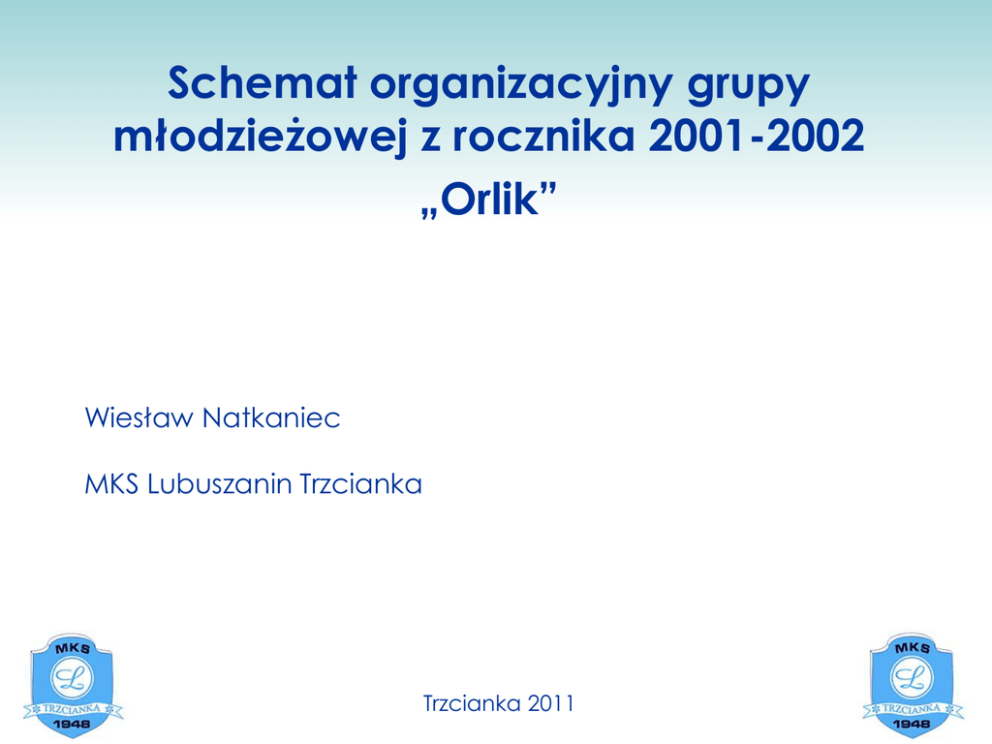 Schemat organizacyjny grupy młodzieżowej z rocznika 2001-2002 „Orlik” Wiesław Natkaniec MKS Lubuszanin Trzcianka Trzcianka 2011 Plan prezentacji 1. 2. 3. 4. 5. 6. 7. 8. 9. 10. 11. 12. Charakterystyka trenera Cele szkoleniowe Podział na grupy Test techniczny Plan zajęć Mezocykl treningowy Elementy jednostki treningowej Materiały Szkoleniowe Zawodnik na zajęciach Zawodnik na turnieju Trener-Zawodnik-Rodzic Dyskusja Trener Wiesław Natkaniec Absolwent Państwowej Wyższej Szkoły Zawodowej w Wałczu. Specjalność: nauczycielska, Dodatkowa specjalność: gimnastyka korekcyjna Uprawnienia: - Instruktor sportu w dyscyplinach: * Piłka nożna * Piłka ręczna * Koszykówka * Pływanie Trzcianka 2011 Trener Wiesław Natkaniec Dodatkowe kursy, szkolenia: - Udział w konferencji metodyczno– szkoleniowej dla trenerów i instruktorów woj. Wielkopolskiego w Poznaniu. - Kurs przygotowawczy dla kandydatów na wychowawców placówek wypoczynku dla dzieci i młodzieży w Pile. - Aktywny udział w sportowym życiu miasta i gminy Trzcianka. Wieloletni zawodnik oraz asystent trenerów grup młodzieżowych w trzecioligowym klubie MKS Lubuszanin Trzcianka. Trzcianka 2011 Cele szkoleniowe Szkolenie ruchowe: - Ogólna sprawność ruchowa Koordynacja Zręczność i kreatywność z piłką przy nodze Gra w piłkę: - Zabawa i radość - Technika w formie ogólnej - Praca zespołowa - Elementy taktyki Trzcianka 2011 Podział na grupy Grupa Niebieska - max. 20 zawodników w tym dwóch bramkarzy Grupa Biała – max. 20 zawodników w tym dwóch bramkarzy Test techniczny 1. 2. 3. 4. 5. 6. Próba uderzeń piłki wewnętrzną częścią stopy Próba uderzeń piłki wew./zew. Podbiciem stopy Próba uderzeń piłki prostym podbiciem Próba prowadzenia piłki stopą w slalomie Żonglerka z piłką Gra uproszczona 3x3/4x4/5x5 Trzcianka 2011 Podział na grupy Test techniczny 1. Próba uderzeń piłki wewnętrzną częścią stopy Trzcianka 2011 Podział na grupy Test techniczny 2. Próba uderzeń piłki wew./zew. Podbiciem stopy Trzcianka 2011 Podział na grupy Test techniczny 3. Próba uderzeń piłki prostym podbiciem Trzcianka 2011 Podział na grupy Test techniczny 4. Próba prowadzenia piłki stopą w slalomie 5. Żonglerka z piłką 6. Gry uproszczone 3x3, 4x4, 5x5, 6x6 Trzcianka 2011 Trzcianka 2011 Trzcianka 2011 Trzcianka 2011 Trzcianka 2011 Podział na grupy Przelicznik punktów na „gwiazdki” Punkty/ gwiazdki 101- 1106 81- 1005 61- 804 41- 603 21- 402 Poniżej 20 – 1 Każdy zawodnik po przeliczeniu wszystkich prób na punkty dostał ocenę w postaci „gwiazdki” 20 zawodników z najlepszymi wynikami zostaje zakwalifikowanych do grupy „niebieskiej” następnych 20 zostaje zakwalifikowanych do grupy „białej”. Zawodnicy, którzy nie odbyli testów specjalnych automatycznie zostają zakwalifikowani do grupy „białej”. Trzcianka 2011 Podział na grupy 70 60 50 40 Niebieska Biała 30 20 10 0 1 2 3 4 5 6 7 8 9 10 11 12 13 Trzcianka 2011 14 15 16 17 18 19 20 Podział na grupy Grupa Niebieska Bartosz Duda Dawid Dubaj Jakub Potocki Kamil Duszyński Klaudiusz Tecław Krzysztof Kazirodek Miłosz Klonowski Mateusz Wlazło Mateusz Paszko Piotr Janyszka Radosław Pomostowski Roman Wróblewski Wiktor Iwanicki Dawid Szymański Wojciech Guze Michał Wesołowski Jan Czujko Mikołaj Pakos Maciej Kordek Hubert Wilk Remigiusz Borynik Trzcianka 2011 Podział na grupy Grupa Biała Bartosz Paliniewicz Błażej Strzelecki Eryk Krysztopowicz Filip Miroszczenko Gabriel Włodarski Jakub Mumot Jakub Krysztopowicz Jakub Rybarczyk Jakub Baranowski Kacper Jastrzębski Karol Szymański Patryk Grzybowski Filip Rodzik Dawid Matuszny Adrian Medoliński Łukasz Zawieja Mikołaj Szarek Jakub Dzikiewicz Hubert Antoniak Kacper Kułaga Jakub Koniuszy Patryk Czerniawski Łukasz Brzozowiec Trzcianka 2011 Plan zajęć Miejsce zajęć: Boisko Orlik 2012, Stadion OSiR Trzcianka Mikrocykl treningowy: * grupa Niebieska- wtorek, piątek * grupa Biała- poniedziałek, piątek Makrocykl treningowy: *16.08.2011- 29.11.2011 Trzcianka 2011 Plan zajęć Grupa Niebieska Wtorek- Boisko Orlik 2012 godz. 15:15-16:15 Piątek- Stadion OSiR godz. 16:30- 17:30 Grupa Biała Poniedziałek- Stadion OSiR godz. 15:15- 16:15 Piątek- Boisko Orlik 2012 godz. 15:00- 16:00 Trzcianka 2011 Mezocykl treningowy SIERPIEŃ P W Ś C WRZESIEŃ P S N P W Ś C P S N 1 2 3 4 1 2 3 4 5 6 7 8 9 10 11 12 13 14 5 6 7 8 9 10 11 15 16 17 18 19 20 21 12 13 14 15 16 17 18 22 23 24 25 26 27 28 19 20 21 22 23 24 25 29 30 31 26 27 28 29 30 grupa Biała treningi gr. B i N zawody grupa Niebieska test techniczny Trzcianka 2011 Mezocykl treningowy PAŹDZIERNIK P W Ś C P LISTOPAD S N 1 2 3 4 5 6 7 8 9 10 11 12 13 14 15 16 17 18 19 20 21 22 23 24 25 26 27 28 29 30 31 grupa Biała treningi gr. B i N zawody P W Ś C P S N 1 2 3 4 5 6 7 8 9 10 11 12 13 14 15 16 17 18 19 20 21 22 23 24 25 26 27 28 29 30 grupa Niebieska test techniczny Trzcianka 2011 Mezocykl treningowy SIERPIEŃ P W Ś C P S N 1 2 3 4 5 6 7 8 9 10 11 12 13 14 15 male gry 17 male gry 19 22 male gry 24 ZAWODY 26 29 techn. + małe gry 31 grupa Biała treningi gr. B i N zawody grupa Niebieska test techniczny Trzcianka 2011 ZAWODY 27 21 28 Mezocykl treningowy WRZESIEŃ P W Ś C P S N techn. + małe gry wolne test techniczny wolne wolne test techniczny wolne wolne wolne nauka el. tech. wolne wolne techniczny, małe gry wolne wolne małe gry nauka el. tech. wolne wolne techniczny, małe gry ZAWODY wolne małe gry nauka el. tech. wolne wolne wolne techniczny, małe gry technika+ małe gry nauka elementów tech. 1x1 + 2x2 + 5x5 2x2 + 3x3 + 5x5 3x3 + 4x4 + 5x5 prowadzenie piłki prostym podbiciem prowadzenie piłki wewnętrzną częśdią stopy prowadzenie piłki zewnętrzną częścią stopy grupa Biała treningi gr. B i N zawody grupa Niebieska test techniczny Trzcianka 2011 wolne Mezocykl treningowy PAŹDZIERNIK P W Ś C P S N wolne wolne małe gry nauka el. tech. wolne wolne techniczny, małe gry wolne wolne małe gry nau