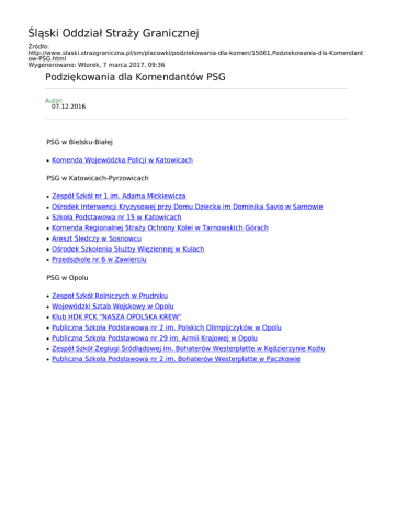 Śląski Oddział Straży Granicznej Źródło: http://www.slaski.strazgraniczna.pl/sm/placowki/podziekowania-dla-komen/15061,Podziekowania-dla-Komendant ow-PSG.html Wygenerowano: Wtorek, 7 marca 2017, 09:36 Podziękowania dla Komendantów PSG Autor: 07.12.2016 PSG w Bielsku-Białej ● Komenda Wojewódzka Policji w Katowicach PSG w Katowicach-Pyrzowicach ● Zespół Szkół nr 1 im. Adama Mickiewicza ● Ośrodek Interwencji Kryzysowej przy Domu Dziecka im Dominika Savio w Sarnowie ● Szkoła Podstawowa nr 15 w Katowicach ● Komenda Regionalnej Straży Ochrony Kolei w Tarnowskich Górach ● Areszt Śledczy w Sosnowcu ● Ośrodek Szkolenia Służby Więziennej w Kulach ● Przedszkole nr 6 w Zawierciu PSG w Opolu ● Zespoł Szkół Rolniczych w Prudniku ● Wojewódzki Sztab Wojskowy w Opolu ● Klub HDK PCK "NASZA OPOLSKA KREW" ● Publiczna Szkoła Podstawowa nr 2 im. Polskich Olimpijczyków w Opolu ● Publiczna Szkoła Podstawowa nr 29 im. Armii Krajowej w Opolu ● Zespół Szkół Żeglugi Śródlądowej im. Bohaterów Westerplatte w Kędzierzynie Koźlu ● Publiczna Szkoła Podstawowa nr 2 im. Bohaterów Westerplatte w Paczkowie