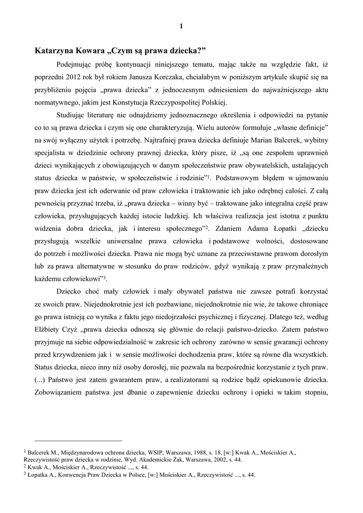 1 Katarzyna Kowara „Czym są prawa dziecka?” Podejmując próbę kontynuacji niniejszego tematu, mając także na względzie fakt, iż poprzedni 2012 rok był rokiem Janusza Korczaka, chciałabym w poniższym artykule skupić się na przybliżeniu pojęcia „prawa dziecka” z jednoczesnym odniesieniem do najważniejszego aktu normatywnego, jakim jest Konstytucja Rzeczypospolitej Polskiej. Studiując literaturę nie odnajdziemy jednoznacznego określenia i odpowiedzi na pytanie co to są prawa dziecka i czym się one charakteryzują. Wielu autorów formułuje „własne definicje” na swój wyłączny użytek i potrzebę. Najtrafniej prawa dziecka definiuje Marian Balcerek, wybitny specjalista w dziedzinie ochrony prawnej dziecka, który pisze, iż „są one zespołem uprawnień dzieci wynikających z obowiązujących w danym społeczeństwie praw obywatelskich, ustalających status dziecka w państwie, w społeczeństwie i rodzinie”1. Podstawowym błędem w ujmowaniu praw dziecka jest ich oderwanie od praw człowieka i traktowanie ich jako odrębnej całości. Z całą pewnością przyznać trzeba, iż „prawa dziecka – winny być – traktowane jako integralna część praw człowieka, przysługujących każdej istocie ludzkiej. Ich właściwa realizacja jest istotna z punktu widzenia dobra dziecka, jak i interesu społecznego”2. Zdaniem Adama Łopatki „dziecku przysługują wszelkie uniwersalne prawa człowieka i podstawowe wolności, dostosowane do potrzeb i możliwości dziecka. Prawa nie mogą być uznane za przeciwstawne prawom dorosłym lub za prawa alternatywne w stosunku do praw rodziców, gdyż wynikają z praw przynależnych każdemu człowiekowi”3. Dziecko choć mały człowiek i mały obywatel państwa nie zawsze potrafi korzystać ze swoich praw. Niejednokrotnie jest ich pozbawiane, niejednokrotnie nie wie, że takowe chroniące go prawa istnieją co wynika z faktu jego niedojrzałości psychicznej i fizycznej. Dlatego też, według Elżbiety Czyż „prawa dziecka odnoszą się głównie do relacji państwo-dziecko. Zatem państwo przyjmuje na siebie odpowiedzialność w zakresie ich ochrony zarówno w sensie gwarancji ochrony przed krzywdzeniem jak i w sensie możliwości dochodzenia praw, które są równe dla wszystkich. Status dziecka, nieco inny niż osoby dorosłej, nie pozwala na bezpośrednie korzystanie z tych praw. (...) Państwo jest zatem gwarantem praw, a realizatorami są rodzice bądź opiekunowie dziecka. Zobowiązaniem państwa jest dbanie o zapewnienie dziecku ochrony i opieki w takim stopniu, Balcerek M., Międzynarodowa ochrona dziecka, WSIP, Warszawa, 1988, s. 18, [w:] Kwak A., Mościskier A., Rzeczywistość praw dziecka w rodzinie, Wyd. Akademickie Żak, Warszawa, 2002, s. 44. 2 Kwak A., Mościskier A., Rzeczywistość ..., s. 44. 3 Łopatka A., Konwencja Praw Dziecka w Polsce, [w:] Mościskier A., Rzeczywistość ..., s. 44. 1 2 w jakim jest to dla niego niezbędne (poprzez odpowiednie działania ustawodawcze, administracyjne i inne)”4. W nieco innym kontekście o prawach dziecka wypowiada się papież, Jan Paweł II, dla którego dziecko jest zarówno pełnowartościową jednostką, osobą, człowiekiem jak i pełnoprawnym, choć małym, obywatelem państwa. Dziecko to także uosobienie czystości, niewinności i wielkie źródło nadziei. „Powtarzam raz jeszcze to, co powiedziałem na Zgromadzeniu Ogólnym Narodów Zjednoczonych dnia 2 października 1979 r. Pragnę wypowiedzieć tę radość, jaką dla każdego z nas stanowią dzieci, wiosna życia, zadatek przyszłości każdej dzisiejszej ojczyzny. Żaden kraj na świecie, żaden system polityczny nie może myśleć o swej przyszłości inaczej, jak tylko poprzez wizję tych nowych pokoleń, które przejmą od swoich rodziców wielorakie dziedzictwo wartości, zadań i dążeń zarówno własnego narodu, jak też całej rodziny ludzkiej”5. Wedle nauki Jana Pawła II dziecko ma szczególne prawa, przede wszystkim prawo do zjednoczonej i kochającej rodziny, do szacunku i troski wobec jego osoby, do rozwoju we wszystkich dostępnych płaszczyznach życia w warunkach wolności i godności osobistej oraz prawo do niczym nieskażonej prawdy. Najważniejszym zbiorem praw obowiązującym w Polsce jest Konstytucja Rzeczpospolitej Polskiej, znowelizowana i podpisana w 1997 roku przez prezydenta Aleksandra Kwaśniewskiego. Część zawartych w niej artykułów mówi o ochronie i przestrzeganiu praw dziecka w świetle polskiego prawa, prawa cywilnego i kodeksu rodzinnego. Ważne wydają się także liczne „ ... postanowienia prawa rodzinnego i opiekuńczego, prawa karnego, wreszcie przepisy prawa pracy i prawa administracyjnego. Wiele uprawnień dzieci regulują przepisy wykonawcze resortów zdrowia i opieki społecznej, edukacji, sprawiedliwości, pracy i polityki socjalnej”6. Żywiej prawami dzieci zainteresowano się w polskim rządzie w czerwcu 1994 roku. Nad dwoma projektami regulującymi prawa dzieci w Polsce pracowała niewielka grupa senatorów. Jednakże posłowie już w pierwszym czytaniu oba projekty odrzucili. I właściwie dopiero Komisja Konstytucyjna przyjmując projekt Konstytucji Rzeczpospolitej Polskiej w dniu 16 stycznia 1997 roku zatwierdziła 237 bardzo ważnych artykułów związanych z prawną ochroną dzieci. Na pierwszy plan wysuwają się artykuły dotyczące ochrony prawnej dziecka, czyli art. nr 18, 30, 36, 40, 41, 48, 51, 63, 66-69, 72, 76, 79. I tak oto art. 30 polskiej Konstytucji z 1997 roku, zatytułowany w rozdziale Źródło wolności, praw i obowiązków człowieka i obywatela zakłada „ respektowanie przez rodziców Szkoła praw człowieka. Helsińska Fundacja Praw Człowieka, Warszawa, 1998, z. 5, s. 132 za Czyż E., Prawa dziecka, s. 35, [w:] Kwak A., Mościskier A., Rzeczywistość..., s. 44-45. 5 Jasudowicz T. (red.), Prawa rodziny – prawa w rodzinie. Jan Paweł II o małżeństwie i rodzinie. Wypisy z nauczania Ojca Świętego, Wyd.