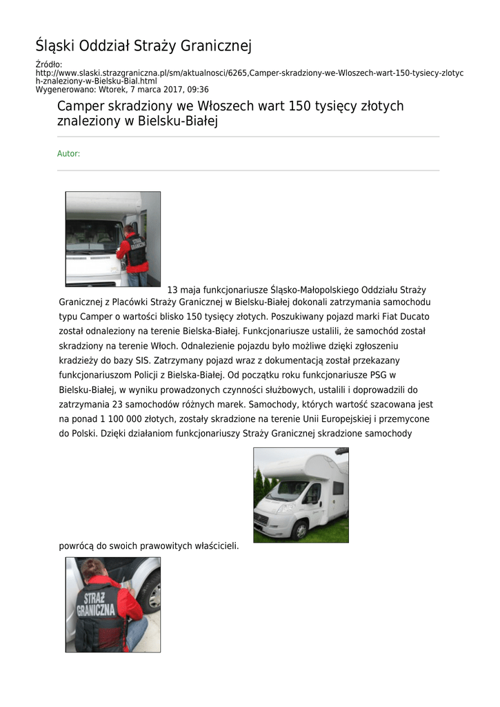 Śląski Oddział Straży Granicznej Źródło: http://www.slaski.strazgraniczna.pl/sm/aktualnosci/6265,Camper-skradziony-we-Wloszech-wart-150-tysiecy-zlotyc h-znaleziony-w-Bielsku-Bial.html Wygenerowano: Wtorek, 7 marca 2017, 09:36 Camper skradziony we Włoszech wart 150 tysięcy złotych znaleziony w Bielsku-Białej Autor: 13 maja funkcjonariusze Śląsko-Małopolskiego Oddziału Straży Granicznej z Placówki Straży Granicznej w Bielsku-Białej dokonali zatrzymania samochodu typu Camper o wartości blisko 150 tysięcy złotych. Poszukiwany pojazd marki Fiat Ducato został odnaleziony na terenie Bielska-Białej. Funkcjonariusze ustalili, że samochód został skradziony na terenie Włoch. Odnalezienie pojazdu było możliwe dzięki zgłoszeniu kradzieży do bazy SIS. Zatrzymany pojazd wraz z dokumentacją został przekazany funkcjonariuszom Policji z Bielska-Białej. Od początku roku funkcjonariusze PSG w Bielsku-Białej, w wyniku prowadzonych czynności służbowych, ustalili i doprowadzili do zatrzymania 23 samochodów różnych marek. Samochody, których wartość szacowana jest na ponad 1 100 000 złotych, zostały skradzione na terenie Unii Europejskiej i przemycone do Polski. Dzięki działaniom funkcjonariuszy Straży Granicznej skradzione samochody powrócą do swoich prawowitych właścicieli.