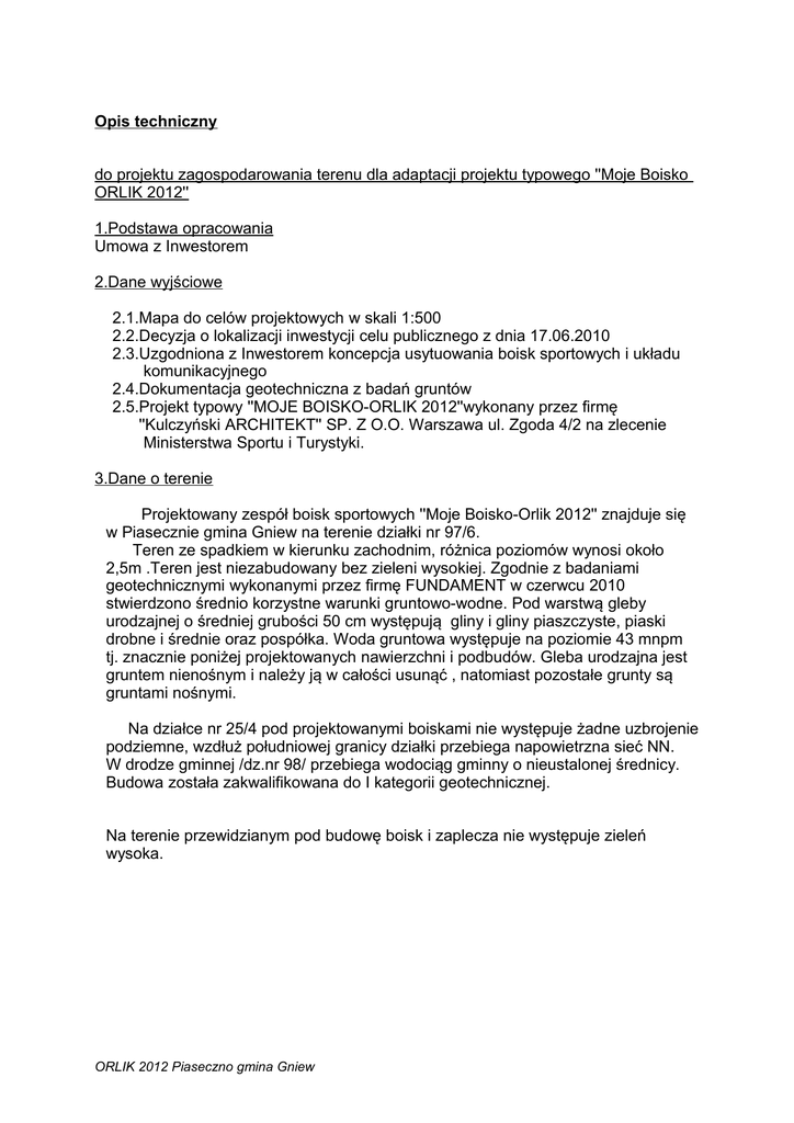 Opis techniczny do projektu zagospodarowania terenu dla adaptacji projektu typowego ''Moje Boisko ORLIK 2012'' 1.Podstawa opracowania Umowa z Inwestorem 2.Dane wyjściowe 2.1.Mapa do celów projektowych w skali 1:500 2.2.Decyzja o lokalizacji inwestycji celu publicznego z dnia 17.06.2010 2.3.Uzgodniona z Inwestorem koncepcja usytuowania boisk sportowych i układu komunikacyjnego 2.4.Dokumentacja geotechniczna z badań gruntów 2.5.Projekt typowy ''MOJE BOISKO-ORLIK 2012''wykonany przez firmę ''Kulczyński ARCHITEKT'' SP. Z O.O. Warszawa ul. Zgoda 4/2 na zlecenie Ministerstwa Sportu i Turystyki. 3.Dane o terenie Projektowany zespół boisk sportowych ''Moje Boisko-Orlik 2012'' znajduje się w Piasecznie gmina Gniew na terenie działki nr 97/6. Teren ze spadkiem w kierunku zachodnim, różnica poziomów wynosi około 2,5m .Teren jest niezabudowany bez zieleni wysokiej. Zgodnie z badaniami geotechnicznymi wykonanymi przez firmę FUNDAMENT w czerwcu 2010 stwierdzono średnio korzystne warunki gruntowo-wodne. Pod warstwą gleby urodzajnej o średniej grubości 50 cm występują gliny i gliny piaszczyste, piaski drobne i średnie oraz pospółka. Woda gruntowa występuje na poziomie 43 mnpm tj. znacznie poniżej projektowanych nawierzchni i podbudów. Gleba urodzajna jest gruntem nienośnym i należy ją w całości usunąć , natomiast pozostałe grunty są gruntami nośnymi. Na działce nr 25/4 pod projektowanymi boiskami nie występuje żadne uzbrojenie podziemne, wzdłuż południowej granicy działki przebiega napowietrzna sieć NN. W drodze gminnej /dz.nr 98/ przebiega wodociąg gminny o nieustalonej średnicy. Budowa została zakwalifikowana do I kategorii geotechnicznej. Na terenie przewidzianym pod budowę boisk i zaplecza nie występuje zieleń wysoka. ORLIK 2012 Piaseczno gmina Gniew 4.Rozwiązania techniczne. 4.1.Założenia ogólne Projekt zakłada adaptację i dostosowanie do warunków obowiązującego planu zagospodarowania przestrzennego typowego projektu ''Moje Boisko ORLIK 2012'' Przewiduje się budowę boiska do piłki nożnej o wymiarach 30x62m , boiska wielofunkcyjnego o wymiarach 32,1x19,1m , wyposażonych w niezbędny sprzęt sportowy ,oraz budynek sanitarno-szatniowy oraz chodniki i drogę dojazdową. Obiekt w całości będzie ogrodzony,boiska będą oświetlone,do budynków szatniowych doprowadzona zostanie instalacja wodna,kanalizacyjna i elektryczna. 4.2.Makroniwelacja i roboty przygotowawcze Roboty ziemne należy rozpocząć od zdjęcia warstwy ziemi urodzajnej o średniej grubości 50 cm i złożenia jej na poboczu w celu wykorzystania do wykonania docelowych nasypów, skarp i trawników. W związku ze znaczną różnicą poziomów terenu pod projektowane boiska należy wykonać nasyp budowlany z gruntu dowiezionego zgodnie z projektem makroniwelacji-rys.nr 16. Nasyp wykonać z gruntu dowiezionego spełniającego wymagania grupy nośności podłoża G1 tj grunty niewysadzinowe dla dobrych warunków wodnych - żwiry, pospółki ,piaski grube i średnie, piaski pylaste i pospółki gliniaste Nasyp wykonać i zagęścić zgodnie z PN-S-02205 „Drogi samochodowe-Roboty ziemne-Wymagania i badania. Teren wokół boisk ukształtować w sposób uniemożliwiający zalewanie boisk wodami opadowymi z terenów przyległych. Na tak przygotowanym podłożu wykonywać warstwy konstrukcyjne boisk. 4.3.Rozwiązania techniczne boisk. BOISKO DO PIŁKI NOŻNEJ Wymiary boiska 62x30 m /pole gry 56x26m / PODBUDOWA. - warstwa odsączająca z piasku grubego gr. 30 cm - warstwa konstrukcyjna z kruszywa kamiennego (fr. 31,5-63mm) o gr. 10cm, - warstwa klinująca z kruszywa kamiennego (fr. 0-31,5mm) o gr. 5cm, -warstwa wyrównująca z miału kamiennego (fr. 0-4mm) o gr. 4cm. Boisko należy oddzielić od sąsiadujących elementów terenu za pomocą obrzeży betonowych 8x30x100cm układanych na ławie z betonu B15. Na powierzchni boiska należy wyprofilować spadki o wartości 0,5%. ORLIK 2012 Piaseczno gmina Gniew NAWIERZCHNIA BOISKA DO PIŁKI NOŻNEJ. Zaprojektowano nawierzchnię z trawy sztucznej trzeciej generacji, tj. zasypywana piaskiem kwarcowym i granulatem gumowym w kolorze czarnym Kolor trawy - zielony, linie białe wklejane. Parametry techniczne: 1.Wysokość włókna min. 60 mm 2. Typ włókna: monofil 3. Skład chemiczny włókna; polietylen 4.Ciężar włókna: min. 11.000 Dtex, 5.Gęstość trawy: min. 97.000 włókien /m2 Wymagane dokumenty dotyczące nawierzchni 1. Raport z badań przeprowadzonych przez laboratorium (Labosport lub ISASport lub Sports Labs Ltd), dotyczący oferowanej nawierzchni, potwierdzający zgodność jej parametrów z FIFA Quality Concept for Football Turf (dostępny na www.FIFA.com) 2. Certyfikat lub deklaracja zgodności z normą PN-EN 15330-1:2008, lub aprobata techniczna ITB, lub rekomendacja techniczna ITB. 3. Karta techniczna oferowanej nawierzchni, potwierdzona przez jej producenta. 4. Atest PZH lub równoważny dla oferowanej nawierzchni i wypełnienia. 5. Autoryzacja producenta trawy syntetycznej, wystawiona dla wykonawcy na realizowaną inwestycję wraz z potwierdzeniem gwarancji udzielonej przez producenta na tę nawierzchnię. Podłoże, na którym ma być układana wykładzina powinno być przygotowane zgodnie z instrukcją producenta i powinno być suche, równe, pozbawione zanieczyszczeń, mocne i stabilne. Program konserwacji ORLIK 2012 Piaseczno gmina Gniew Szczegółowe wytyczne na temat programu konserwacji boiska zawiera Karta Gwarancyjna opracowana przez producenta nawierzchni. WYPOSAŻENIE BOISKA DO PIŁKI NOŻNEJ Bramki aluminiowe (5x2m), montowane w tulejach, siatki do bramek. Ilość: 2 szt. BOISKO UNIWERSALNE DO GRY W KOSZYKÓWKĘ,SIATKÓWKĘ I PIŁKĘ RĘCZNĄ Wymiary boiska 19,1 x 32,1m PODBUDOWA. Przekrój przez podbudowę: - warstwa odsączająca z piasku gr. 30 cm - warstwa konstrukcyjna z kruszywa łamanego o frakcji 31,5-63mm, gr. 10cm, - warstwa klinująca z kruszywa kamiennego o frakcji 0-31,5mm, gr. 5cm, Podbudowę na