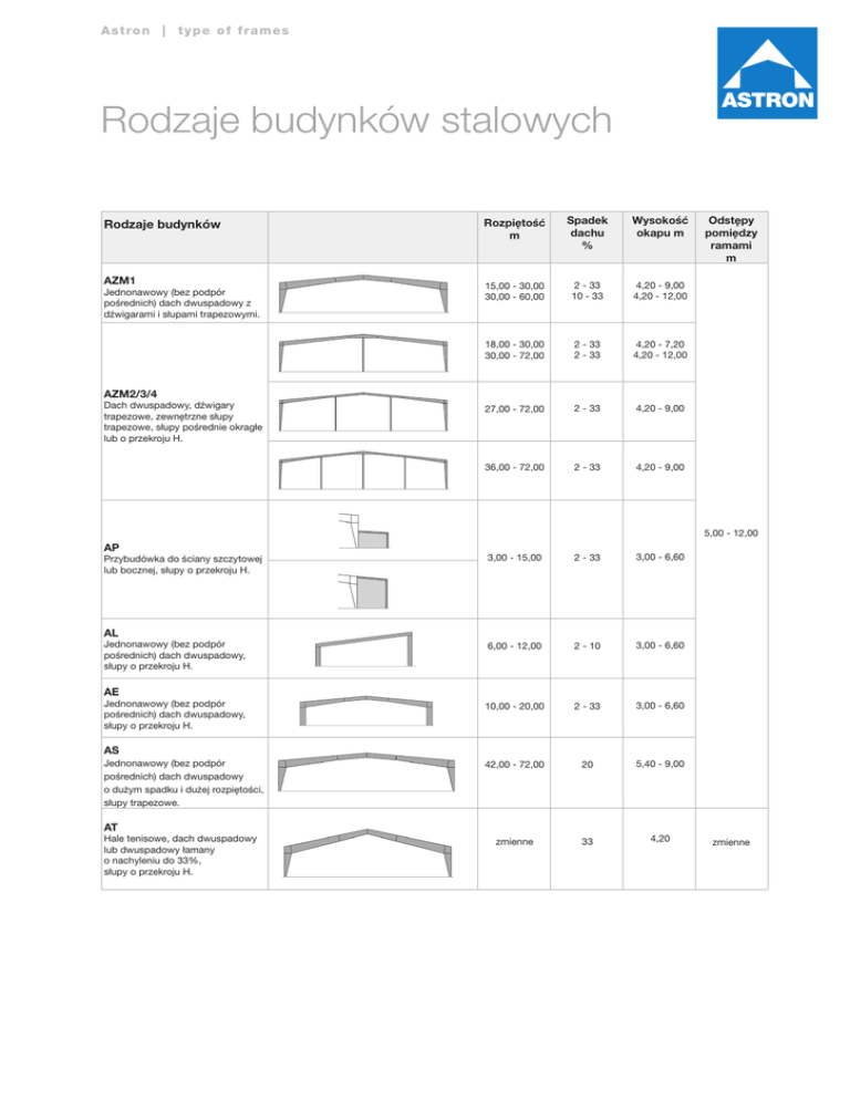 L i nAdstro ab A ns t|r otny p e | oCfofr l oaum r eCsh a r t Rodzaje budynków stalowych Rodzaje budynków AZM1 Jednonawowy (bez podpór pośrednich) dach dwuspadowy z dźwigarami i słupami trapezowymi. Rozpiętość m Spadek dachu % Wysokość okapu m 15,00 - 30,00 30,00 - 60,00 2 - 33 10 - 33 4,20 - 9,00 4,20 - 12,00 18,00 - 30,00 30,00 - 72,00 2 - 33 2 - 33 4,20 - 7,20 4,20 - 12,00 27,00 - 72,00 2 - 33 4,20 - 9,00 36,00 - 72,00 2 - 33 4,20 - 9,00 Odstępy pomiędzy ramami m AZM2/3/4 Dach dwuspadowy, dźwigary trapezowe, zewnętrzne słupy trapezowe, słupy pośrednie okragłe lub o przekroju H. 5,00 - 12,00 AP Przybudówka do ściany szczytowej lub bocznej, słupy o przekroju H. 3,00 - 15,00 2 - 33 3,00 - 6,60 6,00 - 12,00 2 - 10 3,00 - 6,60 10,00 - 20,00 2 - 33 3,00 - 6,60 42,00 - 72,00 20 5,40 - 9,00 zmienne 33 4,20 AL Jednonawowy (bez podpór pośrednich) dach dwuspadowy, słupy o przekroju H. AE Jednonawowy (bez podpór pośrednich) dach dwuspadowy, słupy o przekroju H. AS Jednonawowy (bez podpór pośrednich) dach dwuspadowy o dużym spadku i dużej rozpiętości, słupy trapezowe. AT Hale tenisowe, dach dwuspadowy lub dwuspadowy łamany o nachyleniu do 33%, słupy o przekroju H. zmienne