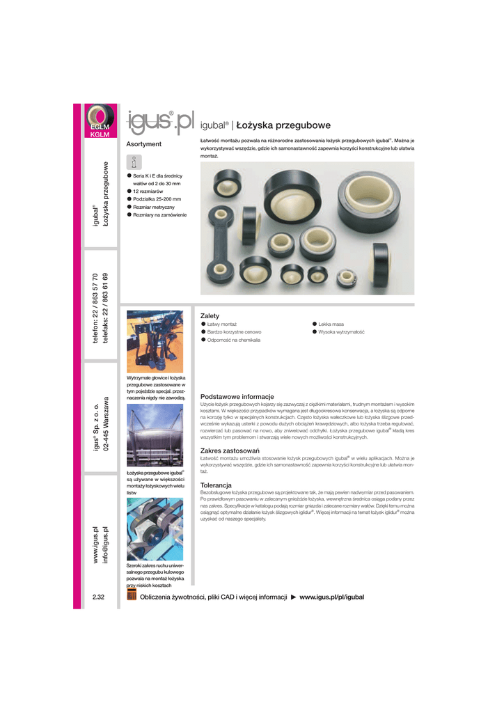 igubal® | Łożyska przegubowe EGLM KGLM Asortyment Łatwość montażu pozwala na różnorodne zastosowania łożysk przegubowych igubal®. Można je wykorzystywać wszędzie, gdzie ich samonastawność zapewnia korzyści konstrukcyjne lub ułatwia igubal® Łożyska przegubowe telefaks: 22 / 863 61 69 02-445 Warszawa igus® Sp. z o. o. telefon: 22 / 863 57 70 montaż. Seria K i E dla średnicy wałów od 2 do 30 mm 12 rozmiarów Podziałka 25-200 mm Rozmiar metryczny Rozmiary na zamówienie Zalety Lekka masa Bardzo korzystne cenowo Wysoka wytrzymałość Odporność na chemikalia Wytrzymałe głowice i łożyska przegubowe zastosowane w tym pojeździe specjal. przeznaczenia nigdy nie zawodzą. Podstawowe informacje Użycie łożysk przegubowych kojarzy się zazwyczaj z ciężkimi materiałami, trudnym montażem i wysokim kosztami. W większości przypadków wymagana jest długookresowa konserwacja, a łożyska są odporne na korozję tylko w specjalnych konstrukcjach. Często łożyska wałeczkowe lub łożyska ślizgowe przedwcześnie wykazują usterki z powodu dużych obciążeń krawędziowych, albo łożyska trzeba regulować, rozwiercać lub pasować na nowo, aby zniwelować odchyłki. Łożyska przegubowe igubal® kładą kres wszystkim tym problemom i stwarzają wiele nowych możliwości konstrukcyjnych. Zakres zastosowań Łatwość montażu umożliwia stosowanie łożysk przegubowych igubal® w wielu aplikacjach. Można je wykorzystywać wszędzie, gdzie ich samonastawność zapewnia korzyści konstrukcyjne lub ułatwia montaż. Tolerancja Bezobsługowe łożyska przegubowe są projektowane tak, że mają pewien nadwymiar przed pasowaniem. Po prawidłowym pasowaniu w zalecanym gnieździe łożyska, wewnętrzna średnica osiąga podany przez nas zakres. Specyfikacje w katalogu podają rozmiar gniazda i zalecane rozmiary wałów. Dzięki temu można osiągnąć optymalne działanie łożysk ślizgowych iglidur®. Więcej informacji na temat łożysk iglidur® można uzyskać od naszego specjalisty. [email protected] Łożyska przegubowe igubal® są używane w większości montaży łożyskowych wielu listw www.igus.pl Łatwy montaż Szeroki zakres ruchu uniwersalnego przegubu kulowego pozwala na montaż łożyska przy niskich kosztach 2.32 Obliczenia żywotności, pliki CAD i więcej informacji www.igus.pl/pl/igubal KGLM Struktura numeru art. E GL M-04 Wymiary Rozmiar metr. Łożysko przegubowe Seria E Łożysko dwuprzegubowe EGLM EGLM/ EGZM/ KGLMEGLM/ EGXM KGLM Typ EGLM/KGLM igubal® igubal® EGLM/KGLM | Łożysko przegubowe Dane obciążenia i wymiary [mm] Maks. obrotowy radialna [N] osiowa [N] d1 moment przyciągania [mm] czaszy [Nm] d2 B C [mm] [mm] [mm] Maks. E10 kąt wychylenia EGLM-04 600 50 1 4 12 5 3,0 37° EGLM-05 1000 130 2 5 14 6 4,0 33° EGLM-06 1200 150 2,5 6 14 6 4,0 27° EGLM-08 1800 175 7 8 16 8 5,0 24° EGLM-10 2500 400 14 10 19 9 6,0 24° EGLM-12 3800 650 25 12 22 10 7,0 21° EGLM-15 5500 1000 30 15 26 12 9,0 21° EGLM-16 6000 1150 32 16 28 13 9,5 21° EGLM-17 6300 1200 35 17 30 14 10,0 21° EGLM-20 9000 1400 40 20 35 16 12,0 18° EGLM-25 14000 2900 55 25 42 20 16,0 16° EGLM-30 17000 4000 70 30 47 22 18,0 13º Maks. obrotowy d1 Maks. telefaks: 22 / 863 61 69 Maks. stat. siła obciążenia telefon: 22 / 863 57 70 Nr art. Dane obciążenia i wymiary [mm] Nr art. Maks. stat. siła obciążenia radialna [N] osiowa [N] moment przyciągania [mm] czaszy [Nm] E10 d2 B C [mm] [mm] [mm] kąt wychylenia KGLM-02 300 60 1 2 8 4 3,0 KGLM-03 550 200 2 3 10 6 4,5 32° KGLM-05 1300 500 5 5 13 8 6,0 30° KGLM-06 1800 650 10 6 16 9 6,5 29° KGLM-08 2700 1200 12 8 19 12 9,0 25° KGLM-10 4000 1400 20 10 22 14 10,5 25° KGLM-12 5400 1500 30 12 26 16 12,0 25° KGLM-14 6000 2500 35 14 28 19 13,5 23° KGLM-16 8000 3000 40 16 32 21 15,0 23° KGLM-18 9000 4000 45 18 35 23 16,5 23° KGLM-20 10000 5000 55 20 40 25 18,0 23° KGLM-22 11700 6500 60 22 42 28 20,0 22° KGLM-25 13600 7500 65 25 47 31 22,0 22° KGLM-30 20000 9000 70 30 55 37 25,0 22° Materiał: Oprawa: igumid G strona 1.171, Czasza: iglidur® W300 Obliczenia żywotności, pliki CAD i więcej informacji 32° strona 1.54 www.igus.pl/pl/eglm www.igus.pl/pl/kglm 2.35