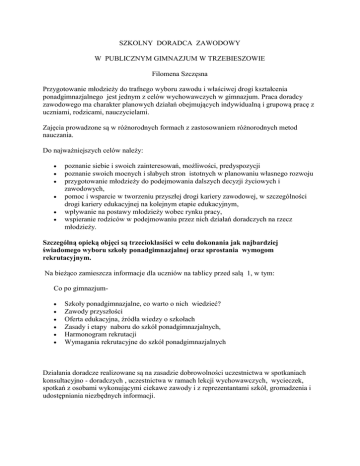 SZKOLNY DORADCA ZAWODOWY W PUBLICZNYM GIMNAZJUM W TRZEBIESZOWIE Filomena Szczęsna Przygotowanie młodzieży do trafnego wyboru zawodu i właściwej drogi kształcenia ponadgimnazjalnego jest jednym z celów wychowawczych w gimnazjum. Praca doradcy zawodowego ma charakter planowych działań obejmujących indywidualną i grupową pracę z uczniami, rodzicami, nauczycielami. Zajęcia prowadzone są w różnorodnych formach z zastosowaniem różnorodnych metod nauczania. Do najważniejszych celów należy: poznanie siebie i swoich zainteresowań, możliwości, predyspozycji poznanie swoich mocnych i słabych stron istotnych w planowaniu własnego rozwoju przygotowanie młodzieży do podejmowania dalszych decyzji życiowych i zawodowych, pomoc i wsparcie w tworzeniu przyszłej drogi kariery zawodowej, w szczególności drogi kariery edukacyjnej na kolejnym etapie edukacyjnym, wpływanie na postawy młodzieży wobec rynku pracy, wspieranie rodziców w podejmowaniu przez nich działań doradczych na rzecz młodzieży. Szczególną opieką objęci są trzecioklasiści w celu dokonania jak najbardziej świadomego wyboru szkoły ponadgimnazjalnej oraz sprostania wymogom rekrutacyjnym. Na bieżąco zamieszcza informacje dla uczniów na tablicy przed salą 1, w tym: Co po gimnazjum Szkoły ponadgimnazjalne, co warto o nich wiedzieć? Zawody przyszłości Oferta edukacyjna, źródła wiedzy o szkołach Zasady i etapy naboru do szkół ponadgimnazjalnych, Harmonogram rekrutacji Wymagania rekrutacyjne do szkół ponadgimnazjalnych Działania doradcze realizowane są na zasadzie dobrowolności uczestnictwa w spotkaniach konsultacyjno - doradczych , uczestnictwa w ramach lekcji wychowawczych, wycieczek, spotkań z osobami wykonującymi ciekawe zawody i z reprezentantami szkół, gromadzenia i udostępniania niezbędnych informacji. PLAN DZIAŁAŃ W ZAKRESIE ORIENTACJI ZAWODOWEJ Klasa Klasa I Tematyka zajęć 1.Poznaję siebie: Poznanie siebie warunkie m własnego rozwoju 2.Jaki jestem? Klasa II Poznaję świat zawodów Forma realizacji Godzina z wychowawcą Wykonawcy Wychowawca, doradca zawodowy Pogadanka, 3. Moje zainteresowania. Uwagi Współpraca ze szkolnym doradcą zawodowym Test, 4. Moje zdolności i predyspozycje zawodowe. Ankieta, 5.Umiejętność komunikacji i współpracy. Ćwiczenia problemowe i odgrywanie ról. 1.Planuję przyszłość edukacyjnozawodową. Godziny z wychowawcą 2.Charakterystyka zawodów Spotkania z przedstawicielami ciekawych zawodów Wychowawca, szkolny doradca zawodowy, bibliotekarz, Przygotowanie „Albumu zawodów”- z ich opisem Zastaw filmów „Kalejdoskop zawodów” 3.Tworzymy dokumenty: list motywacyjny, CV, podanie o pracę. Pogadanka, ćwiczenia problemowe 4.Rynek pracy Pogadanka, pokaz 5.Autoprezentacjamoc pierwszego wrażenia Prezentacje Nauczyciel polonista, informatyk Współpraca z Powiatowym Urzędem Pracy Koordynator projektów edukacyjnych Klasa III Wybieram ścieżkę edukacyjn ozawodową 1.Poznaję swoje preferencje edukacyjno zawodowe Godziny z wychowawcą, warsztaty z doradcą zawodowym 2.Instytucje wspierające w procesie planowania i realizacji kariery zawodowej Wycieczka do Młodzieżowego Centrum Kariery Wychowawca, doradca zawodowy, Dyrektor szkoły Wychowawca, doradca zawodowy Pogadanka, prezentacja multimedialna. 3.Struktura kształcenia Prezentacja ponadgimnazjalnego multimedialna Wychowawca, doradca zawodowy 4.Charakterystyka Wykład, opis, poszczególnych typów szkół. 5.Oferta edukacyjna Gazetka ścienna „ Co po gimnazjum?” Spotkania z przedstawicielami szkól ponadgimnazjalnyc h Wychowawca, doradca zawodowy Giełda szkół ponadgimazjal nych Źródła wiedzy o szkołach Wykład, 6.Zasady i etapy rekrutacji do szkól ponadgimnazjalnych Ćwiczenia obsługi kont rekrutacyjnych Wychowawca, doradca zawodowy 7. Poznajemy lokalny rynek pracy Wycieczka do zakładu mięsnego „Wierzejki: Wychowawca, doradca zawodowy 8.Podejmowanie decyzji ostatecznego wyboru szkoły Umieszczenie prezentacji na stronie szkoły dla uczniów i rodziców Obsługa konta, przygotowanie podania Doradca zawodowy udostępnia młodzieży opracowania i informacje na stronie internetowej szkoły: www. pgtrzebieszow.pl Dodatkowe informacje o szkołach ponadgimnazjalnych na stronach: WWW.kuratoriumoświatylublin WWW.men.gov.pl WWW.koweziu.edu.pl