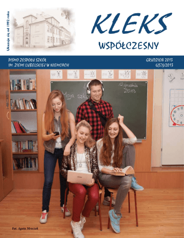 Ukazuje się od 1992 roku KLEKS WSPÓŁCZESNY PISMO ZESPOŁU SZKÓŁ IM. ZIEMI LUBELSKIEJ W NIEMCACH Fot. Agata Mroczek , GRUDZIEN 2013 6(57)/2013 Zamiast wstępu Kleks Jubileuszowy 5(56)/2013 KLEKS Współczesny 6(57)/2013 PISMO ZESPOŁU SZKÓŁ IM. ZIEMI LUBELSKIEJ W NIEMCACH Redakcja: Kasia Alagaratnam, Natalia Boguta, Łukasz Kamiński, Ewelina Mroczek, Agnieszka Niećko, Sylwia Sobolewska, Ewa Szych, Aleksandra Zarębska-Kursa, Współpraca: p. Mirosław Choina, p. Alicja Gruda, p. Marek Gruda, p. Monika Gruda, p. Ewa Korzeniowska, p. Krzysztof Kotyra, p. Joanna Piekarczyk, p. Renata Staszek, p. Lidia Szuberska, p. Anna Zgierska, p. Stanisława Żuławska, Michalina Bijak, Agata Borawska, Paulina Ćwikła, Dominika Dobosz, Ola Flis, Iga Kruczek, Agata Mroczek, Paulina Nowak, Justyna Woźniak, Natalia Woźniak, Ola Wójtowicz, Ola Zuń, Opiekunowie: p. Agnieszka Boguta, p. Katarzyna Iwańczuk, Korekta: p. Marzena Włodarczyk Skład komputerowy i oprawa graficzna: Katarzyna Iwańczuk Druk: Drukarnia „Perfekta” Lublin Adres redakcji: Zespół Szkół w Niemcach, ul. Szkolna 23, 21-025 Niemce [email protected] projekt graficzny p. M. Gruda Redakcja „Kleksa” właśnie obmyśla koncepcję najnowszego numeru. Fot. Natalia Boguta, kl. IIC 2 Okładka: • Projekt: p. Katarzyna Iwańczuk • Zdjęcia: Agata Mroczek • Na okładce: Agnieszka Niećko, Patryk Mróz, Ewelina Mroczek i Dagmara Karwicka – uczniowie klas III gimnazjum • O tym, jak powstawały okładki przeczytacie w następnym numerze „Kleksa” (…) Patrz, czuj, poznawaj, podziwiaj (…) ~ Marta Branica, Pokochać Lubelszczyznę Co nowego w szkole Opracowanie: Aleksandra Zarębska-Kursa kl. IIIC Fot.: p. Katarzyna Iwańczuk Jestem dumny z naszej szkoły „Jesteśmy dumni z naszej szkoły” – to słowa szkolnego hymnu. Słowa proste, ale oddające to, co czuję, patrząc na wspaniałą historię naszej placówki. Ja również chciałbym dołożyć swoją cegiełkę. Staram się, aby Zespół Szkół im. Ziemi Lubelskim w Niemcach był szkołą: • ROZWIJAJĄCĄ ZDOLNOŚCI UCZNIÓW Od nowego roku powstanie orkiestra dęta, w której będą grali uczniowie naszej szkoły. Zespół nauczycieli języków obcych podjął działania na rzecz nawiązania kontaktów ze szkołami z zagranicy, których celem jest wzajemna wymiana i bliższe poznanie języka, kultury, obyczajów naszych sąsiadów. W szkole odbywają się różne formy zajęć pozalekcyjnych dla uczniów m.in. zajęcia taneczne, karate, sportowe, wyjazdy na basen, licznie działają koła zainteresowań. Każdy uczeń może tu znaleźć coś dla siebie. • OTWARTĄ NA POTRZEBY ŚRODOWISKA Jako szkoła staramy się współpracować ze środowiskiem. Mamy dobre kontakty z instytucjami, zakładami pracy nie tylko z terenu naszej gminy, ale również poza nią. Wspólnie organizujemy akcje charytatywne, gościnnie użyczamy pomieszczeń Chórowi Męskiemu, KSM-owi, Klubowi GKS Niemce, Szkole Mistrzostwa Sportowego. Rozwijamy i zacieśniamy współpracę z największymi uczelniami w naszym regionie - UMCS, KUL, a w ostatnim okresie z Uniwersytetem Medycznym i Uniwersytetem Przyrodniczym w Lublinie. • PRZYJAZNĄ - dla uczniów i rodziców. W szkole, placówce publicznej, bardzo ważną rolę odgrywają rodzice uczniów, którzy mają duży wpływ na naszą pracę. Są częstymi gośćmi w moim gabinecie, gdzie wspólnie omawiamy wiele spraw, dotyczących życia szkoły. Poruszamy również kwestie związane z przyszłością placówki. Słucham opinii rodziców na temat m.in. organizacji zajęć dodatkowych. Efektem naszych działań jest wprowadzenie e- dziennika. Ważnym przykładem współpracy są działania, podjęte na rzecz bezpieczeństwa uczniów w drodze do szkoły i ze szkoły do domu. Rodzice także zaakceptowali mój pomysł budowy placu zabaw dla dzieci (w związku z obowiązkiem nauki dzieci sześcioletnich). Przykładów dobrej współpracy z rodzicami mamy dużo więcej. • TWÓRCZĄ I KREATYWNĄ Wspólnie z Radą Pedagogiczną naszej szkoły podjęliśmy działania na rzecz rozwoju uczniów szczególnie uzdolnionych, których efektem mają być wyniki w konkursach przedmiotowych w szkole podstawowej i gimnazjum. Żywię głęboką nadzieję, KLEKS 6(57)/2013 że stać nas na realizację tego przedsięwzięcia, co jeszcze w większym stopniu stworzy szansę naszym uczniom w procesie kształcenia. W szkole zostały przeprowadzone zmiany organizacyjne, mające na celu poprawę zarządzania tak dużą placówką. • BEZPIECZNĄ i GOSPODARNĄ Jednym z ważniejszych zadań gospodarczych jest przeprowadzenie niezbędnych remontów pokryć dachowych, wykonanie odwodnienia budynku, wymiana części ogrodzenia terenu szkoły. Szkoła musi być bezpieczna, funkcjonalna i po prostu ładna. Mam nadzieję, iż moje dotychczasowe działania, zarówno te zrealizowane, jak też będące w trakcie realizacji, spotkają się z akceptacją społeczności szkolnej i środowiska. Jerzy Wójcik Dyrektor Zespołu Szkół im. Ziemi Lubelskiej w Niemcach 3 A to ciekawe Sylwia Sobolewska, Iga Kruczek kl.IID Fot.: E. Szych kl. IIB, p. K. Iwańczuk Szkoła w liczbach Rok szkolny 2013/2014 Przedmioty na wyposażeniu: 1 rzutnik pisma 3 tablice interaktywne 3 kamery wideo 11 aparatów fotograficznych 11 odtwarzaczy DVD 16 projektów multimedialnych 77 komputerów (razem) w tym 33 dla uczniów 185 piłek 12364 książki w bibliotece Nauczyciele: 0 - stażyści 8 - kontraktowi 11 - mianowani 44 – dyplomowani 3 – tyle osób liczy dyrekcja naszej szkoły. Na zdjęciu (od lewej): pani wicedyrektor Barbara Józefacka, pan dyrektor Jerzy Wójcik, pani wicedyrektor Jadwiga Łucka-Drozd. Uczniowie szkoły: 66 – uczniowie klas 1 SP 87 – uczniowie klas I gimnazjum 131 – chłopcy w gimnazjum 136 – dziewczęta w gimnazjum 180 – dziewczęta w szkole podstawowej 183 – chłopcy w szkole podstawowej 267 – wszyscy uczniowie gimnazjum 363 – wszyscy uczniowie szkoły pod