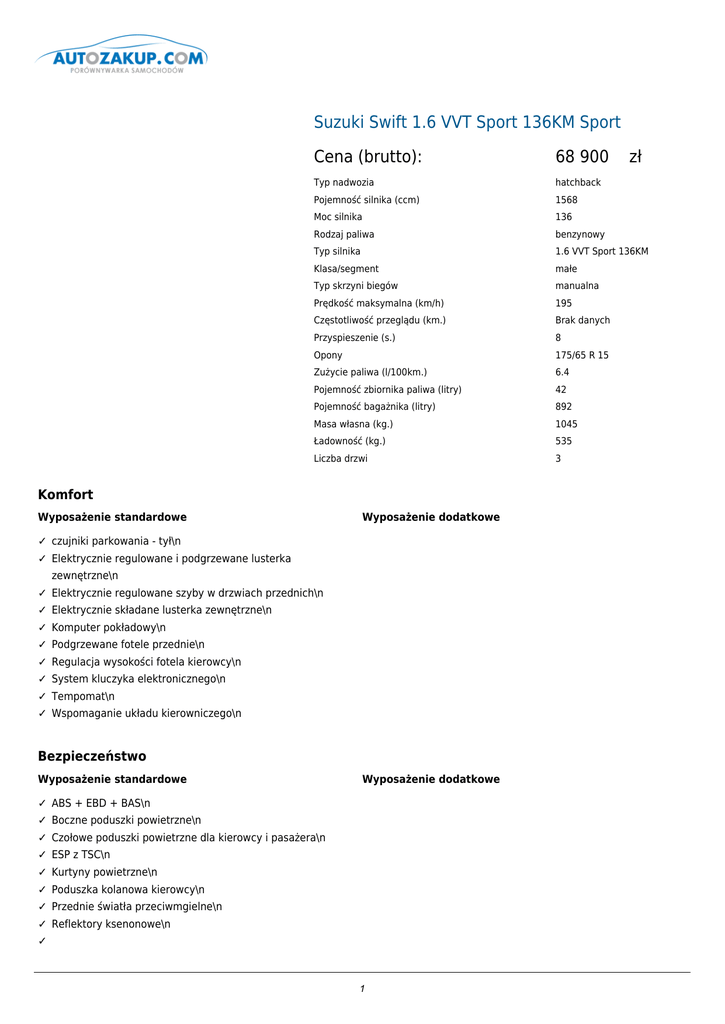 Suzuki Swift 1.6 VVT Sport 136KM Sport Cena (brutto): 68 900 Typ nadwozia hatchback Pojemność silnika (ccm) 1568 Moc silnika 136 Rodzaj paliwa benzynowy Typ silnika 1.6 VVT Sport 136KM Klasa/segment małe Typ skrzyni biegów manualna Prędkość maksymalna (km/h) 195 Częstotliwość przeglądu (km.) Brak danych Przyspieszenie (s.) 8 Opony 175/65 R 15 Zużycie paliwa (l/100km.) 6.4 Pojemność zbiornika paliwa (litry) 42 Pojemność bagażnika (litry) 892 Masa własna (kg.) 1045 Ładowność (kg.) 535 Liczba drzwi 3 Komfort Wyposażenie standardowe Wyposażenie dodatkowe ✓ czujniki parkowania - tył\n ✓ Elektrycznie regulowane i podgrzewane lusterka zewnętrzne\n ✓ Elektrycznie regulowane szyby w drzwiach przednich\n ✓ Elektrycznie składane lusterka zewnętrzne\n ✓ Komputer pokładowy\n ✓ Podgrzewane fotele przednie\n ✓ Regulacja wysokości fotela kierowcy\n ✓ System kluczyka elektronicznego\n ✓ Tempomat\n ✓ Wspomaganie układu kierowniczego\n Bezpieczeństwo Wyposażenie standardowe Wyposażenie dodatkowe ✓ ABS + EBD + BAS\n ✓ Boczne poduszki powietrzne\n ✓ Czołowe poduszki powietrzne dla kierowcy i pasażera\n ✓ ESP z TSC\n ✓ Kurtyny powietrzne\n ✓ Poduszka kolanowa kierowcy\n ✓ Przednie światła przeciwmgielne\n ✓ Reflektory ksenonowe\n ✓ 1 zł System mocowania fotelika dziecięcego ISOFIX\n 2 ✓ Wyłącznik poduszki powietrznej pasażera\n Dodatki Wyposażenie standardowe Wyposażenie dodatkowe ✓ Aluminiowe obręcze kół ✕ Kolor nadwozia Cosmic Black Pearl czarny perłowy 1700 PLN ✓ Centralny zamek ✕ Kolor nadwozia Supreme Red Pearl czerwony perłowy 2100 PLN ✓ Gniazdo USB\n ✓ Immobiliser\n ✓ Obrotomierz\n ✓ Skórzana kierownica z przyciskami sterowania radiem\n ✓ Zewnętrzne klamki i lusterka w kolorze nadwozia\n Doprecyzowanie oferty Kontakt: Nazwa użytkownika: admin Nazwa firmy: qqq Adres: qqq 12, 41-706 qqq1, NIP: 954 REGON: 1 Telefon: 123, 1 Fax: 1 Email: 1 www: 3