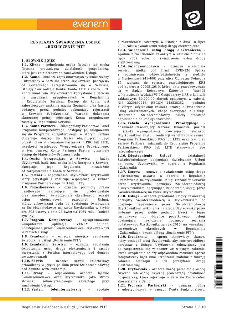 1. SŁOWNIK POJĘĆ 1.1. Klient – pełnoletnia osoba fizyczna lub osoba fizyczna prowadząca działalność gospodarczą, która jest zainteresowana zamówieniem Usługi; 1.2. Konto – oznacza zapis informatyczny umieszczony i utworzony w Serwisie przez Użytkownika, począwszy od skutecznego zarejestrowania się w Serwisie; istnieją dwa rodzaje Konta: Konto LITE i Konto PRO. Konto umożliwia Użytkownikom korzystanie z Serwisu na warunkach uregulowanych w Regulaminie i Regulaminie Serwisu. Dostęp do konta jest zabezpieczony unikalną nazwą (loginem) oraz hasłem podanym przez podmiot dokonujący rejestracji w Serwisie (Użytkownika). Warunki dokonania skutecznej pełnej rejestracji Konta uregulowane zostały w Regulaminie Serwisu. 1.3. Konto Partnera – Udostępniony Partnerowi Panel Programu Komputerowego, dostępny po zalogowaniu się do Programu Komputerowego, w którym Partner otrzymuje dostęp do treści obejmujących jego uczestnictwo w Programie Partnerskim PRO lub LITE, wysokości ustalonego Wynagrodzenia Prowizyjnego, w tym poprzez Konto Partnera Partner otrzymuje dostęp do Materiałów Promocyjnych; 1.4. Osoba korzystająca z Serwisu – każdy Użytkownik bądź inna osoba która korzysta z Serwisu, akceptuje jego Regulamin, niezależnie od zarejestrowania Konta w Serwisie. 1.5. Partner – odpowiednio Użytkownik; Użytkownik który przystąpił i realizuję współpracę w ramach Programu Partnerskiego PRO lub LITE; 1.6. Podwykonawca – oznacza podmioty prawa handlowego zajmujące się profesjonalnie oraz zawodowo świadczeniem określonego rodzaju usług obejmujących przedmiot Usługi, którzy zobowiązani będą do spełnienia świadczenia za Świadczeniodawcę na rzecz Użytkownika w trybie art. 393 ustawy z dnia 23 kwietnia 1964 roku - kodeks cywilny; 1.7. Program Komputerowy – oprogramowanie komputerowe „aplikacja EVENEM online”, udostępnione przez Świadczeniodawcę Użytkownikowi w ramach Usługi 1.8. Regulamin – oznacza niniejszy regulamin świadczenia usługi „Rozliczenie PIT”; 1.9. Regulamin Serwisu – oznacza regulamin świadczenia usług drogą elektroniczną i zasady korzystania z Serwisu internetowego pod domeną www.evenem.pl; 1.10. Serwis – oznacza serwis internetowy prowadzony w języku polskim przez Świadczeniodawcę pod domeną www.evenem.pl; 1.11. Strony – odpowiednio oznacza łącznie Świadczeniodawcę oraz Użytkownika, jako strony stosunku zobowiązaniowego zawartego przy zamówieniu Usługi; 1.12. System teleinformatyczny – zgodnie Regulamin świadczenia usługi „Rozliczenie PIT” z rozumieniem zawartym w ustawie z dnia 18 lipca 2002 roku o świadczeniu usług drogą elektroniczną; 1.13. Świadczenie usług drogą elektroniczną zgodnie z rozumieniem zawartym w ustawie z dnia 18 lipca 2002 roku o świadczeniu usług drogą elektroniczną; 1.14. Świadczeniodawca – oznacza właściciela serwisu, spółka pod firmą: EVENEM Spółka z ograniczoną odpowiedzialnością z siedzibą w Mysłowicach (41-400) przy ulicy Obrzeżna Północna 17, wpisana do rejestru przedsiębiorców KRS pod numerem 0000512610, której akta przechowywane są w Sądzie Rejonowym Katowice – Wschód w Katowicach Wydział VIII Gospodarczy KRS o kapitale zakładowym 50.000,00 złotych opłaconym w całości, NIP 2220897246, REGON 243538352 – podmiot z którym Użytkownik zawiera umowę o świadczenie usług elektronicznych, chcąc skorzystać z Usługi. Oznaczenia Świadczeniodawcy należy stosować odpowiednio do Podwykonawców; 1.15. Tabela Wynagrodzenia Prowizyjnego – dokument zawierający warunki finansowe, poziom i stawki wynagrodzenia prowizyjnego należnego Użytkownikowi z tytułu realizacji współpracy w ramach Programu Partnerskiego PRO lub LITE oraz tzw. plan kariery Partnera; załącznik do Regulaminu Programu Partnerskiego PRO lub LITE stanowiący jego integralna część; 1.16. Udostępnienie Usługi – działalność Świadczeniodawcy obejmująca świadczenie Usługi na rzecz Użytkownika w oparciu o Regulamin i Załączniki; 1.17. Umowa – umowa o świadczenie usług drogą elektroniczną zawarta w oparciu o Regulamin i zamówienie na wykonanie Usługi złożone w Serwisie przez Użytkownika, pomiędzy Świadczeniodawcą a Użytkownikiem, obejmująca świadczenie Usługi przez Świadczeniodawcę na rzecz Użytkownika; 1.18. Usługa – oznacza przedmiot umowy zawieranej pomiędzy Świadczeniodawcą a Użytkownikiem, co obejmuje zapewnienie przez Świadczeniodawcę Użytkownikowi wykonania na rzecz Użytkownika przez wybrany przez siebie podmiot trzeci – biuro rachunkowe lub doradcę podatkowego, usługi obejmującej rozliczenie rocznego zeznania podatkowego Użytkownika za rok 2015, na warunkach szczegółowo określonych w Regulaminie i Załącznikach; zwana usługą „Rozliczenie PIT”; 1.19. Urządzenia – sprzęt stanowiący skaner, który posiadać musi Użytkownik, aby móc prawidłowo korzystać z Usługi; Użytkownik zobowiązany jest do zaopatrzenia się w skaner we własnym zakresie; Przez Urządzenie należy odpowiednio rozumieć aparat fotograficzny bądź inne urządzenie mobilne z funkcją robienia fotokopii i ich przesyłania drogą elektroniczną; 1.20. Użytkownik – oznacza każdą pełnoletnią osobę fizyczną lub osobę fizyczną prowadzącą działalność gospodarczą, która rejestruje w Serwisie Konto celem skorzystania z Usługi. 1.21. Program Partnerski – oznacza jedną z udostępnionych w ramach Konta funkcjonalności Strona 1 / 10 EV/49/005/18022016003750 REGULAMIN ŚWIADCZENIA USŁUGI „ROZLICZENIE PIT” 2. POSTANOWIENIA OGÓLNE 2.1. Regulamin świadczenia usług drogą elektroniczną sporządzony został zgodnie z ustawą z dnia 18 lipca 2002 r. o świadczeniu usług drogą elektroniczną (Dz. U. 2002 nr 144 poz. 1204, z późn. zm.). 2.2. Regulamin Świadczeniodawca udostępnia osobom korzystającym z Serwisu, przed datą zamówienia Usługi, a także na każde jego żądanie. 2