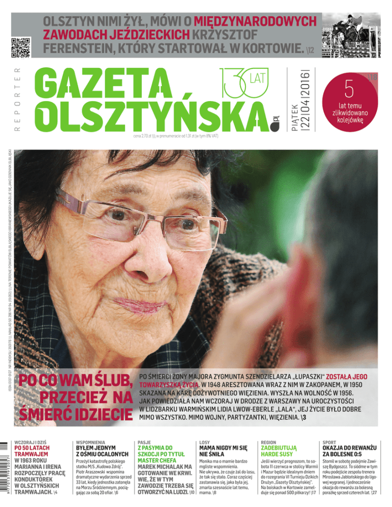PIĄTEK |22|04|2016| R E P O R T E R OLSZTYN NIMI ŻYŁ, MÓWI O MIĘDZYNARODOWYCH ZAWODACH JEŹDZIECKICH KRZYSZTOF FERENSTEIN, KTÓRY STARTOWAŁ W KORTOWIE. \12 5 \18 lat temu zlikwidowano kolejówkę Fot. Grzegorz Czykwin ISSN 0137-9127 NR INDEKSU 350176 \\\ NAKŁAD 50 296 NR 94 (19.052) \\\ NA TERENIE POWIATÓW ELBLĄSKIEGO I BRANIEWSKIEGO UKAZUJE SIĘ JAKO DZIENNIK ELBLĄSKI cena 2,70 zł \\\ w prenumeracie od 1,31 zł (w tym 8% VAT) PO CO WAM ŚLUB, PRZECIEŻ NA ŚMIERĆ IDZIECIE WCZORAJ I DZIŚ PO 50 LATACH TRAMWAJEM W 1963 ROKU MARIANNA I IRENA ROZPOCZĘŁY PRACĘ KONDUKTOREK W OLSZTYŃSKICH TRAMWAJACH. \4 WSPOMNIENIA BYŁEM JEDNYM Z OŚMIU OCALONYCH Przeżył katastrofę polskiego statku M/S „Kudowa Zdrój“. Piotr Araszewski wspomina dramatyczne wydarzenia sprzed 33 lat, kiedy jednostka zatonęła na Morzu Śródziemnym, pociągając za sobą 20 ofiar. \6 PO ŚMIERCI ŻONY MAJORA ZYGMUNTA SZENDZIELARZA „ŁUPASZKI“ ZOSTAŁA JEGO TOWARZYSZKĄ ŻYCIA. W 1948 ARESZTOWANA WRAZ Z NIM W ZAKOPANEM, W 1950 SKAZANA NA KARĘ DOŻYWOTNIEGO WIĘZIENIA. WYSZŁA NA WOLNOŚĆ W 1956. JAK POWIEDZIAŁA NAM WCZORAJ W DRODZE Z WARSZAWY NA UROCZYSTOŚCI W LIDZBARKU WARMIŃSKIM LIDIA LWOW-EBERLE „LALA“, JEJ ŻYCIE BYŁO DOBRE MIMO WSZYSTKO. MIMO WOJNY, PARTYZANTKI, WIĘZIENIA. \3 PASJE LOSY Z PASYMIA DO MAMA NIGDY MI SIĘ SZKOCJI PO TYTUŁ NIE ŚNIŁA MASTER CHEFA Monika ma o mamie bardzo MAREK MICHALAK MA mgliste wspomnienia. GOTOWANIE WE KRWI. Nie ukrywa, że czuje żal do losu, że tak się stało. Coraz częściej WIE, ŻE W TYM zastanawia się, jaka była jej, ZAWODZIE TRZEBA SIĘ zmarła szesnaście lat temu, OTWORZYĆ NA LUDZI. \10 mama. \8 REGION SPORT ZADEBIUTUJĄ HARDE SUSY OKAZJA DO REWANŻU ZA BOLESNE 0:5 Jeśli wierzyć prognozom, to sobota 11 czerwca w stolicy Warmii i Mazur będzie idealnym dniem do rozegrania VI Turnieju Dzikich Drużyn „Gazety Olsztyńskiej”. Na boiskach w Kortowie zamelduje się ponad 500 piłkarzy! \17 Stomil w sobotę podejmie Zawiszę Bydgoszcz. To siódme w tym roku podejście zespołu trenera Mirosława Jabłońskiego do ligowej wygranej. I jednocześnie okazja do rewanżu za bolesną porażkę sprzed czterech lat. \27