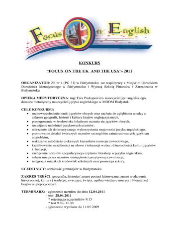 KONKURS “FOCUS ON THE UK AND THE USA”- 2011 ORGANIZATOR: ZS nr 4 (PG 31) w Białymstoku we współpracy z Miejskim Ośrodkiem Doradztwa Metodycznego w Białymstoku i Wyższą Szkołą Finansów i Zarządzania w Białymstoku OPIEKA MERYTORYCZNA: mgr Ewa Prokopowicz- nauczyciel jęz. angielskiego, doradca metodyczny nauczycieli języka angielskiego w MODM Białystok. CELE KONKURSU: • rozpowszechnienie nauki języków obcych oraz zachęta do zgłębiania wiedzy z zakresu geografii, historii i kultury krajów anglojęzycznych, • propagowanie w środowisku lokalnym uczenia się języków obcych, • rozwijanie uzdolnień językowych uczniów, • wdrażanie ich do kreatywnego wykorzystania znajomości języka angielskiego, • promowanie działań twórczych uczniów szczególnie zainteresowanych językiem angielskim, • wskazanie młodzieży ciekawych kierunków rozwoju zawodowego, • kształtowanie wrażliwości na słowo i tolerancji wobec różnorodności kultur, języków i tradycji, • zachęcanie uczniów i popularyzacja czytania literatury w języku angielskim, • nabywanie przez uczniów umiejętności pozytywnej rywalizacji, • integracja miejskich środowisk szkolnych oraz promocja szkoły. UCZESTNICY: uczniowie gimnazjów w Białymstoku ZAKRES TREŚCI: geografia, historia ( znane postaci historyczne, znane wydarzenia historyczne), kultura ( tradycje, zwyczaje, święta, ogólna wiedza o muzyce i literaturze) krajów anglojęzycznych. TERMINARZ: - zgłoszenie uczniów do dnia 12.04.2011 - test- 28.04.2011 * rejestracja uczestników 9.15 * test 9.30- 11.30 - ogłoszenie wyników do 11.05.2009 FORMA: jednorazowy test trwający poza sprawami organizacyjnymi 120 min. Test będzie zawierał zadania zamknięte i otwarte np.: test wielokrotnego wyboru, dopasowywanie, uzupełnianie zdań, zadania typu prawda- fałsz. WYNIKI: lista laureatów zostanie opublikowana na stronie internetowej ZS nr4 i na stronie MODM. Wyniki poszczególnych uczniów zostaną przesłane do szkół a wszyscy uczestnicy otrzymają zaświadczenia o uczestnictwie w konkursie. NAGRODY: laureaci otrzymają cenne nagrody rzeczowe. GŁÓWNY SPONSOR: MACMILLAN, LONGMAN, EXPRESS PUBLISHING/EGIS LITERATURA: - Podręczniki do nauczania języka angielskiego dla szkół gimnazjalnych dopuszczone przez MENiS. - Leksykon wiedzy o Wielkiej Brytanii i USA. - Randee Falk, Spotlight on the USA (Oxford University Press). - Susan Sheerin, Spotlight on Britain (Oxford University Press). - Michael Vaugham-Rees, In Britain (Chancerel International Publishers). - Przewodniki turystyczne, Internet. - GC Thornley and Gwyneth Roberts, An Outline of English Literature (Longman). - Richard Garret, The story of Britain (Harper Collins Publisher). - Kenneth O. Morgan, The Oxford Illustrated History of Britain (Oxford Illustrated Histories) REGULAMIN KONKURSU 1. Prawo uczestnictwa ma każdy uczeń zgłoszony przez szkołę. 2. Zgłoszenia należy dokonać w terminie do 12.04.2011- max. 5 uczestników ze szkoły na adres e- mail: [email protected] lub [email protected] lub pocztą na adres: Publiczne Gimnazjum nr 31, ul. Dojlidy Górne 48, Białystok lub MODM, ul. Poleska 27, Białystok z informacją na kopercie KONKURS „FOCUS ON THE UK & THE USA” - karta zgłoszenia (załącznik nr 1) Każdy z uczestników powinien posiadać wypełnioną kartę uczestnika- podpisaną przez dyrektora szkoły oraz przez rodziców/ prawnych opiekunów (załącznik nr 2). 3. Test odbędzie się w dniu 28.04.2011 w godz. 9.30- 11.30 w siedzibie MODM w Białymstoku, ul. Poleska 27. Rejestracja uczestników rozpocznie się o godz. 9.15 Miejsce przeprowadzenie konkursu może ulec zmianie – informacja zostanie umieszczona na stronach internetowych ZS4 i MODM oraz przekazana pocztą elektroniczną do szkół do 15.04.2011. 4. Uczestnik konkursu rozwiązuje zadania samodzielnie. 5. Wyniki, które nie podlegają odwołaniu, zostaną ogłoszone w ciągu dwóch tygodni od dnia przeprowadzenia konkursu. Każda szkoła, której uczniowie uczestniczyli w teście, otrzyma imienną listę rezultatów. 6. Laureaci – trzy osoby z największą ilością punktów otrzymają nagrody rzeczowe. Pozostali uczestnicy otrzymają zaświadczenia o uczestnictwie. 7. Wręczenie nagród nastąpi w terminie do dnia 20.05.2009r. ( dokładna data będzie przekazana do szkół wraz z listą wyników uczestników) w siedzibie MODM ul. Poleska 27, na którą zostaną zaproszeni wszyscy uczestnicy konkursu. 8. Uwagi końcowe - Każdy uczeń przystępując do konkursu jest zobowiązany do okazania ważnej legitymacji szkolnej. - Podczas konkursu uczniowie nie mogą korzystać z żadnych słowników ani encyklopedii polskich i obcojęzycznych. - Podczas konkursu uczniowie nie mogą używać korektorów, a prace powinny być pisane długopisem z czarnym/niebieskim wkładem. - Prace pisane ołówkiem nie będą sprawdzane przez komisję. - Wszelkie informacje dotyczące Konkursu „FOCUS ON THE UK & THE USA” będą zamieszczane na stronie internetowej MODM www.modm.bialystok.pl/ oraz ZS nr4 adres: www.zs4bialystok.xaa.pl SERDECZNIE ZAPRASZAMY DO UDZIAŁU W KONKURSIE! Organizatorzy: mgr Ewa Prokopowicz (MODM) mgr Katarzyna Artemiuk (ZS nr 4) Załącznik nr 1 KARTA ZGŁOSZENIA UCZESTNICTWA KONKURSIE „FOCUS ON THE UK & THE USA” LP. IMIĘ I NAZWISKO UCZNIA (wpisać drukowanymi literami) KLASA IMIĘ I NAZWISKO NAUCZYCIELA PROWADZĄCEGO NAZWA SZKOŁY: ........................................................................................................................... ADRES SZKOŁY: ............................................................................................................................ TELEFON / E-MAIL SZKOŁY: ............................................................................................................................. NAUCZYCIEL ODPOWIEDZIALNY:........................................................................................ TEL. lub E-MAI